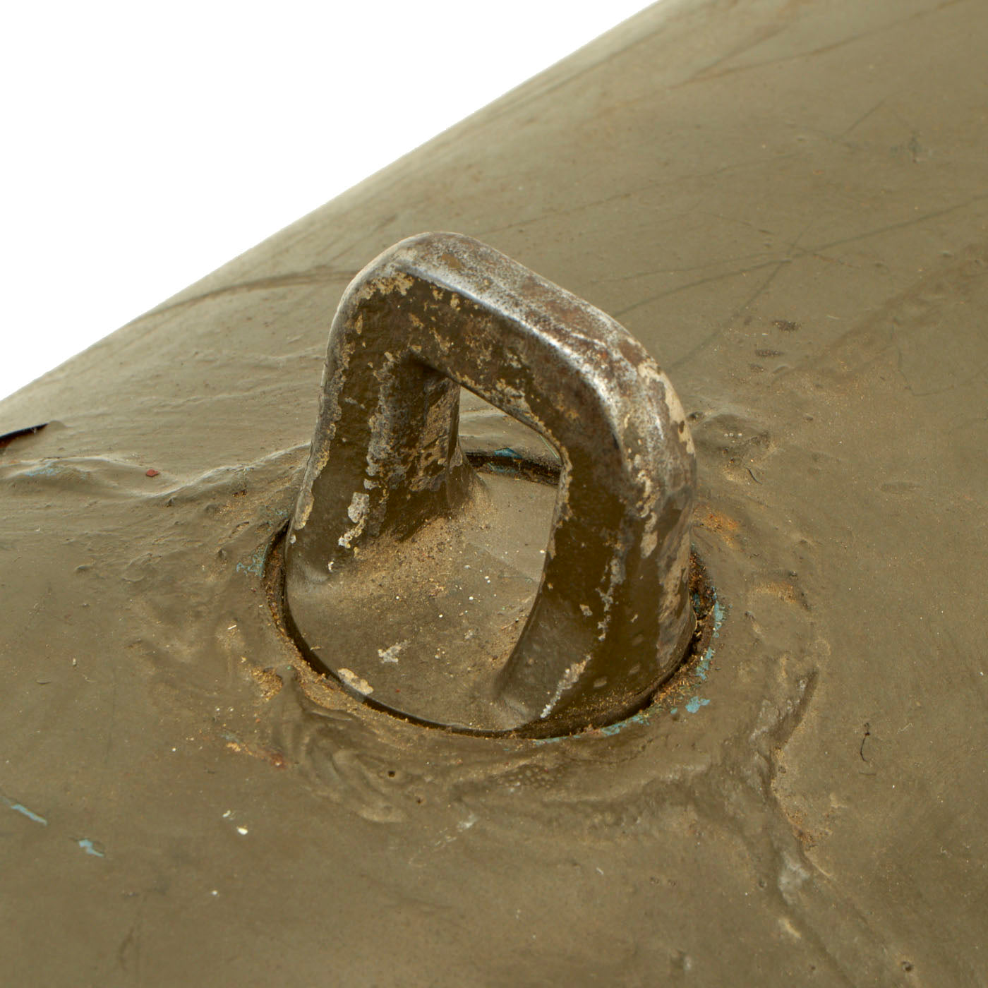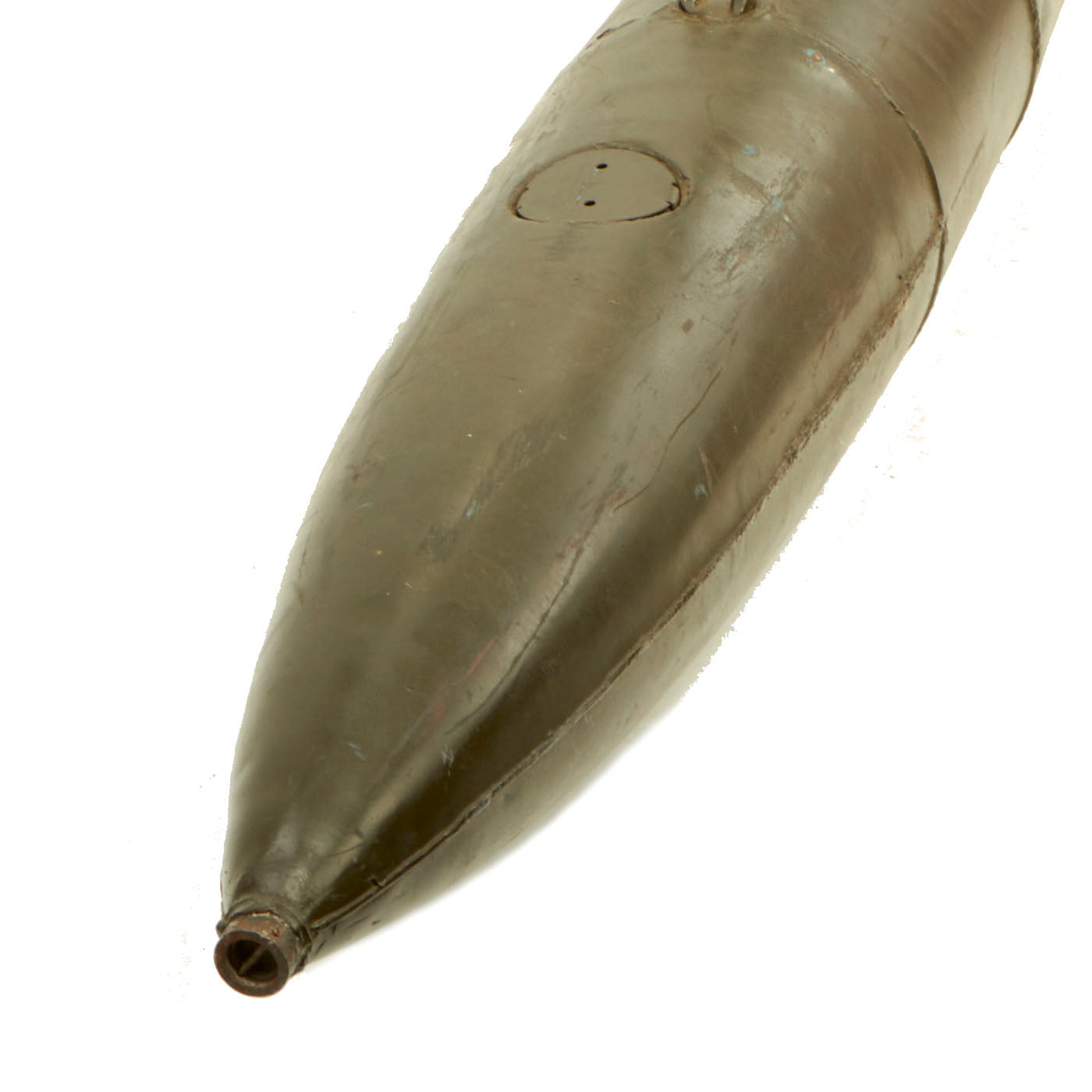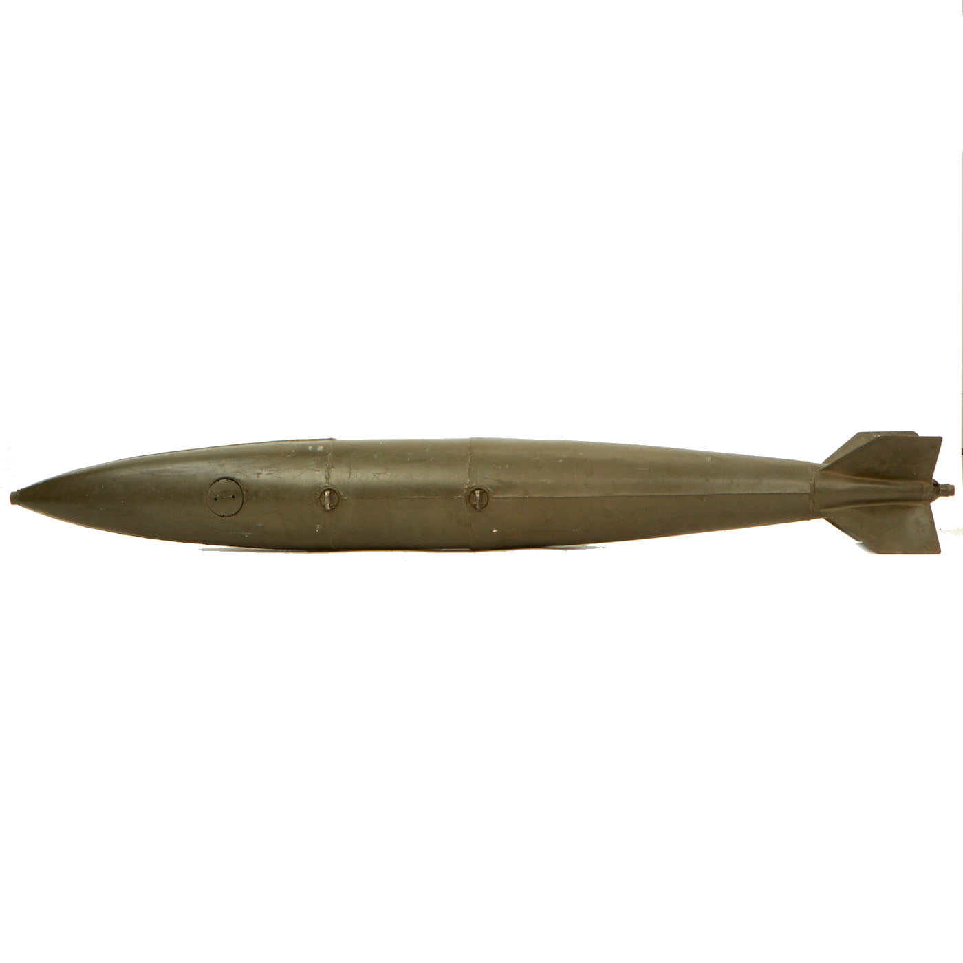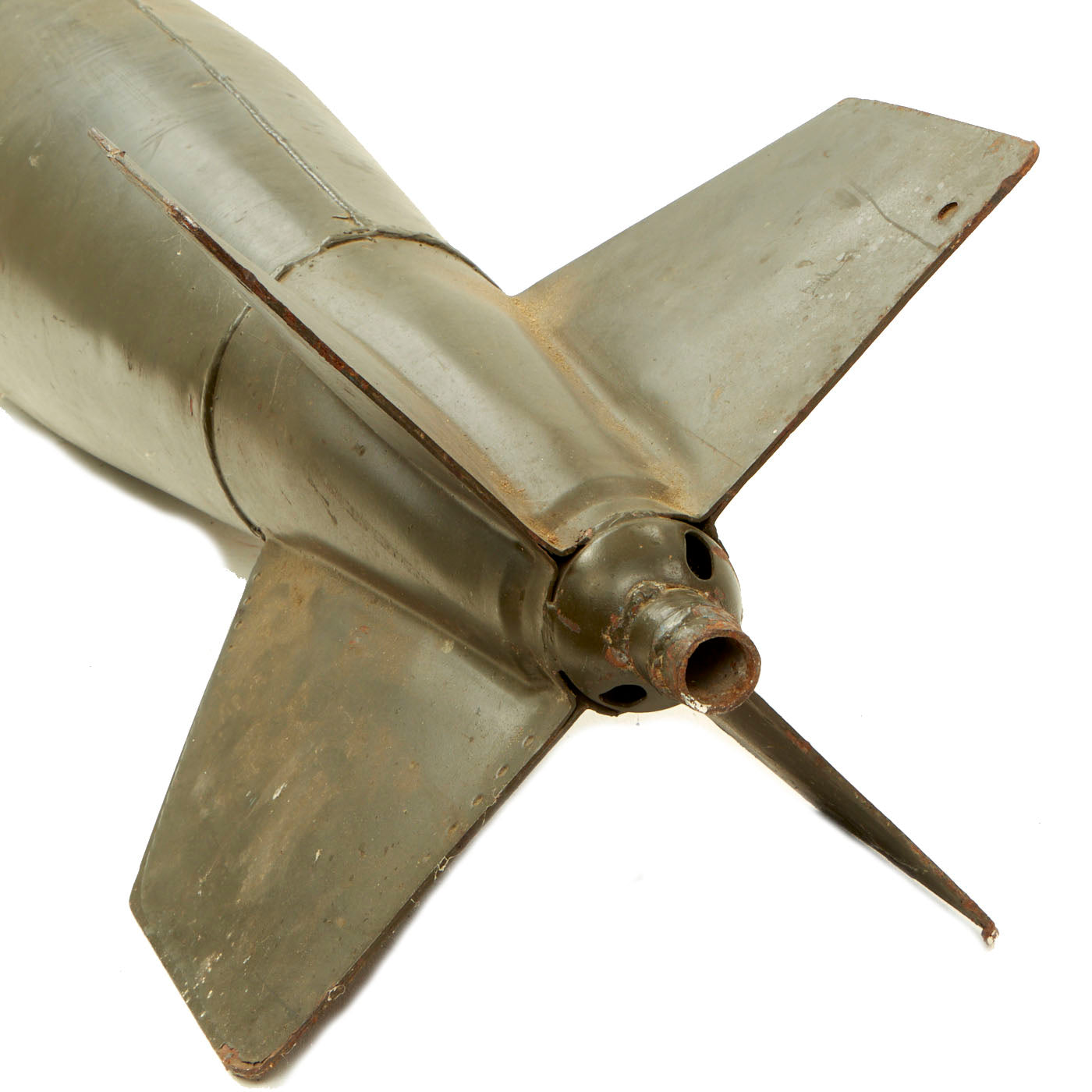 This 92” long example was designed to appear as a real Mk 83 for training purposes. It could be filled with a mixture of sand and water to supplement the weight of the explosive contents and is complete with 2 lifting lugs positioned on the top. There is no fuse or any “bolt on” attachments, this is just a bare example of the base model of the Mk 83. It is completely empty but still weighs a ton (95lbs)! It has been repainted OD green over the original "inert blue" color, which can still be seen in areas where the paint is worn. This is for sure bound to turn some heads once added to your collection!