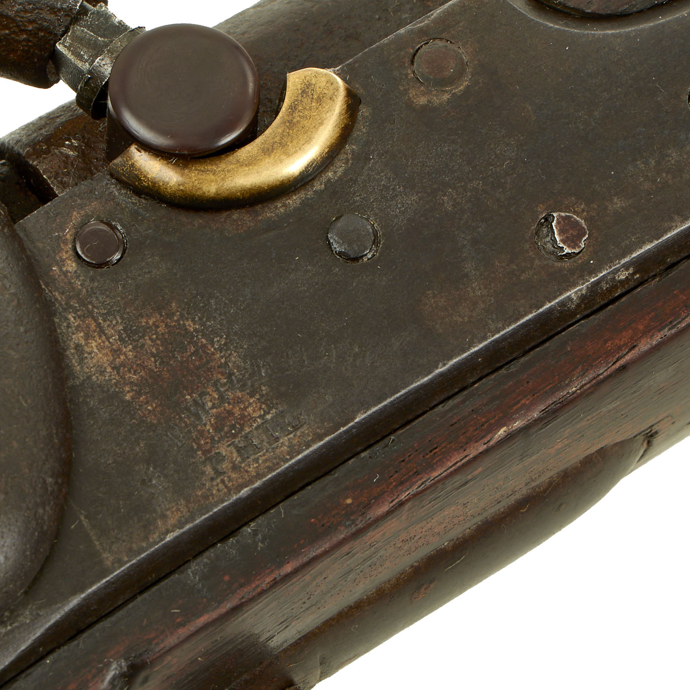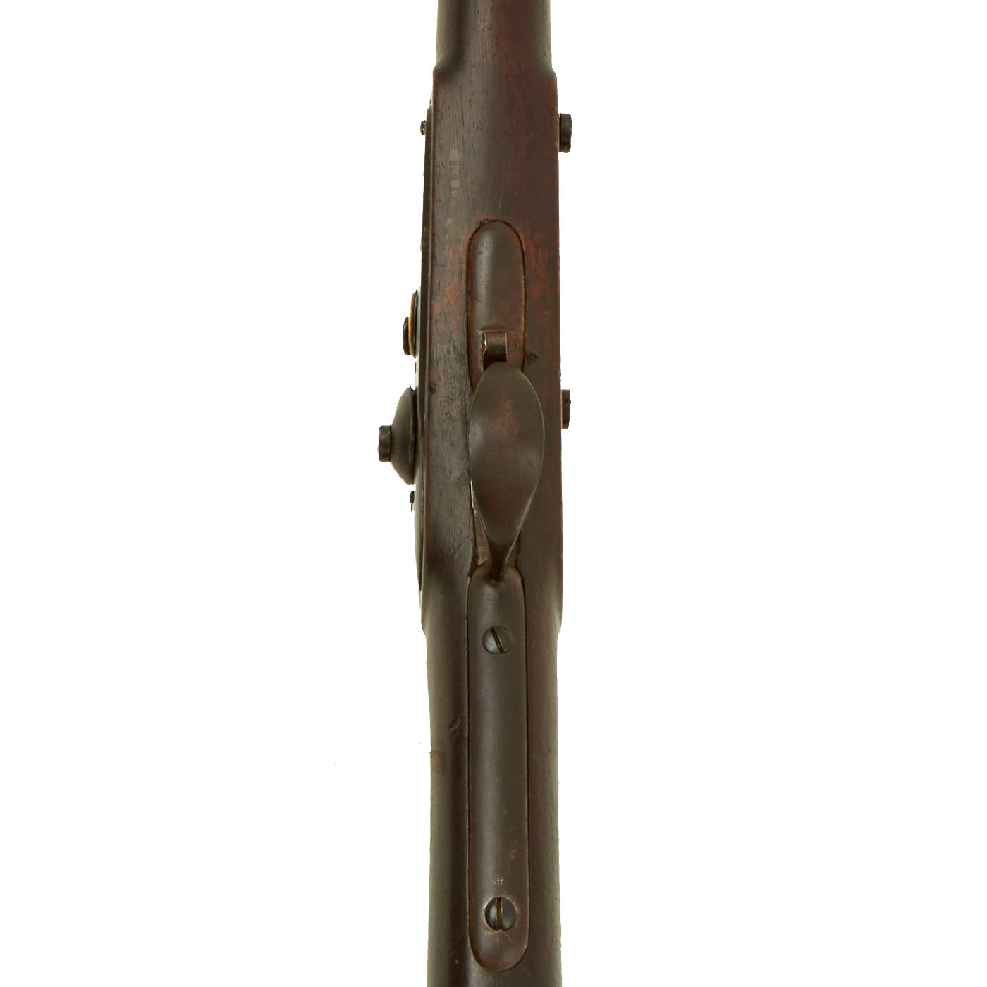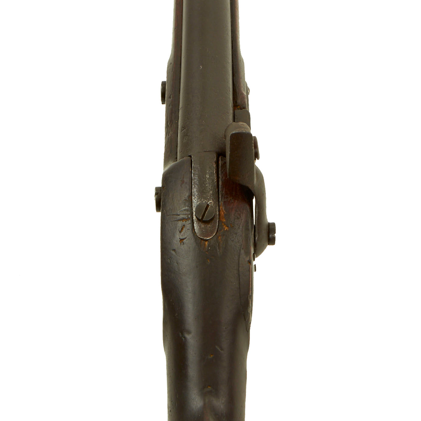 Overall this is a very nice example of a Model 1816 Long Musket converted to percussion. The stock is in good shape, with a great color, and the expected wear from long service. We do not see any major cracks or repairs, just some cracking around the lock plate, which is typical. The barrel is marked F / P / U.S. over the chamber, and there look to be the remnants of an "eagle's head" as well. There are not any major issues that we can see. The metalwork overall has a lovely gray peppered patina, with evidence of past pitting from powder burn around the breech.