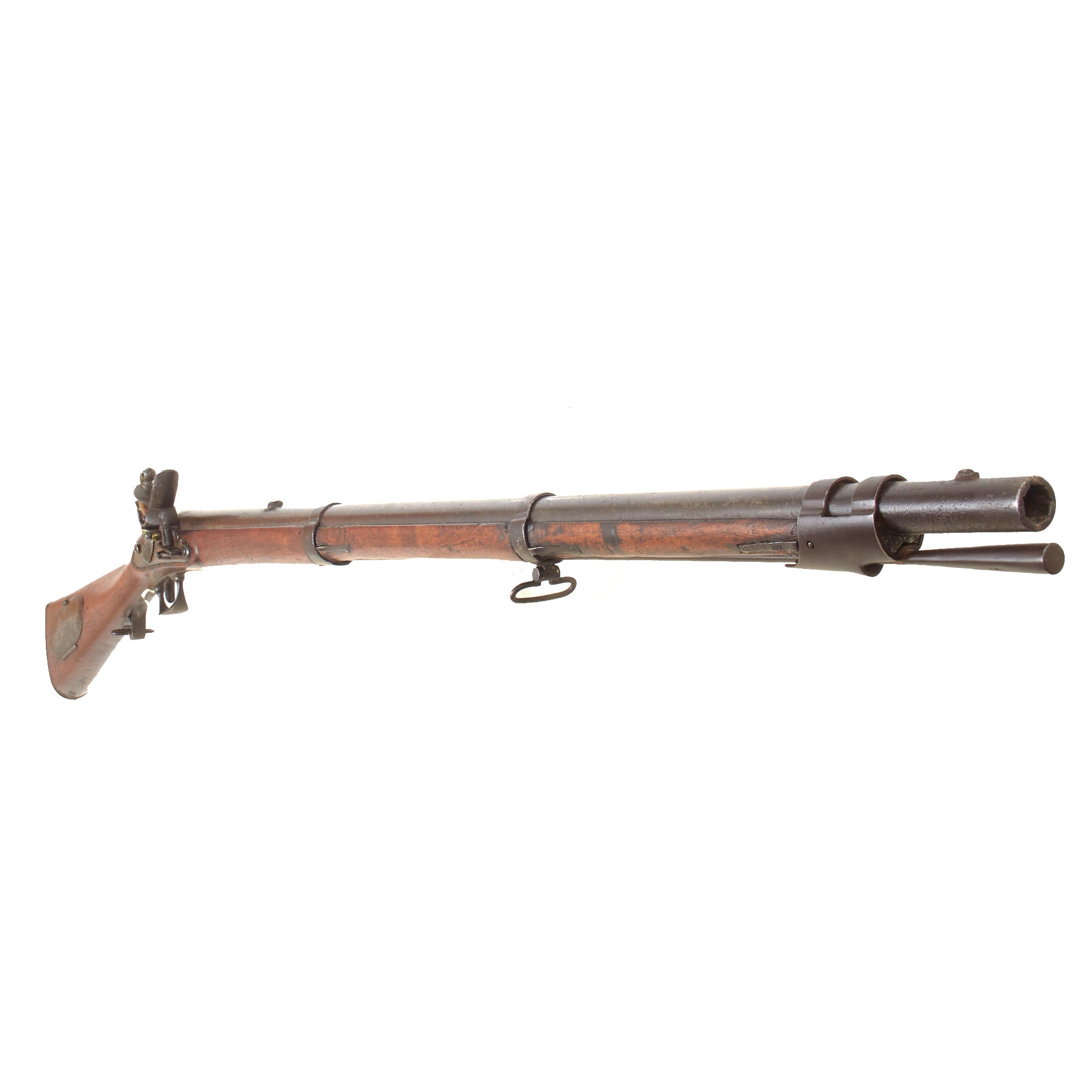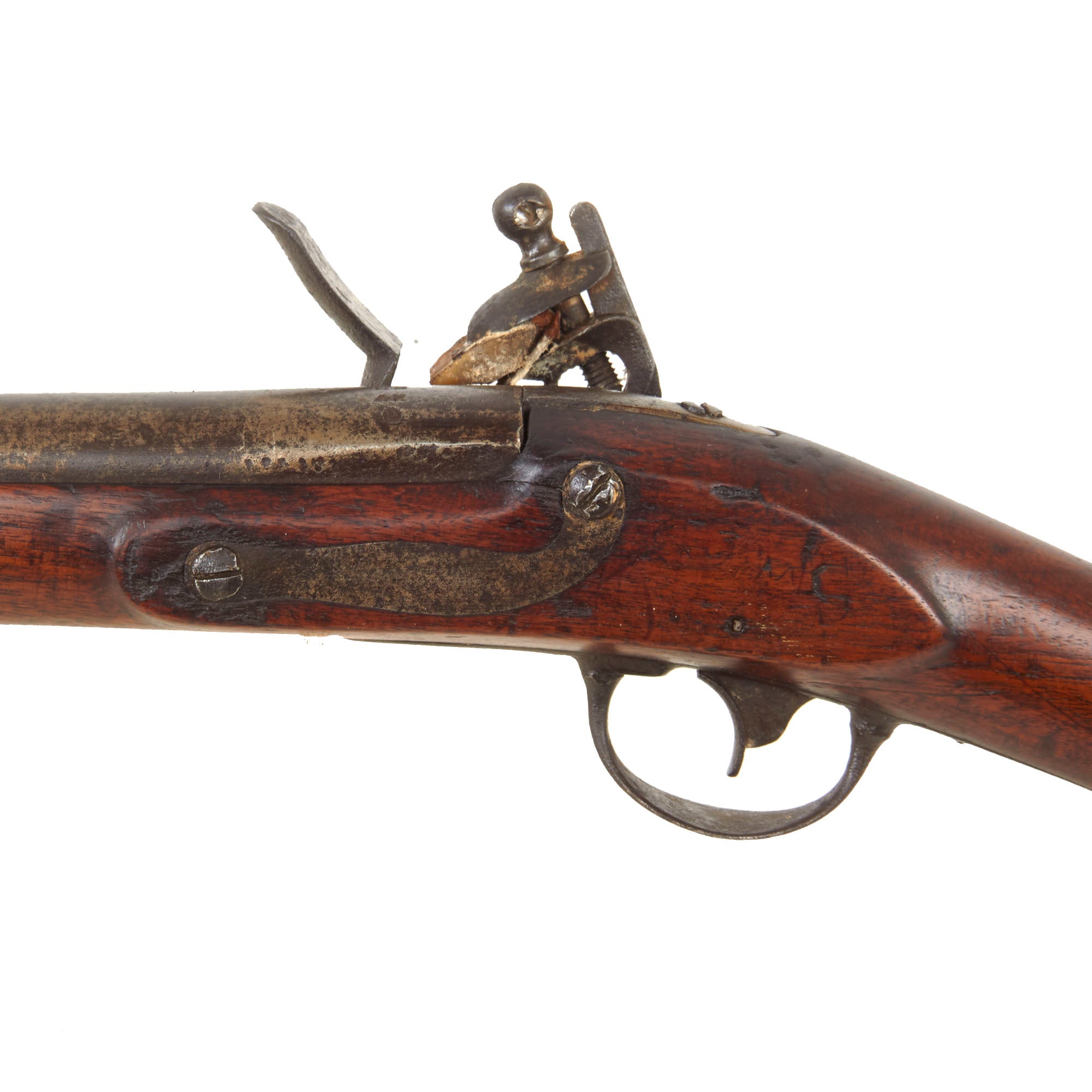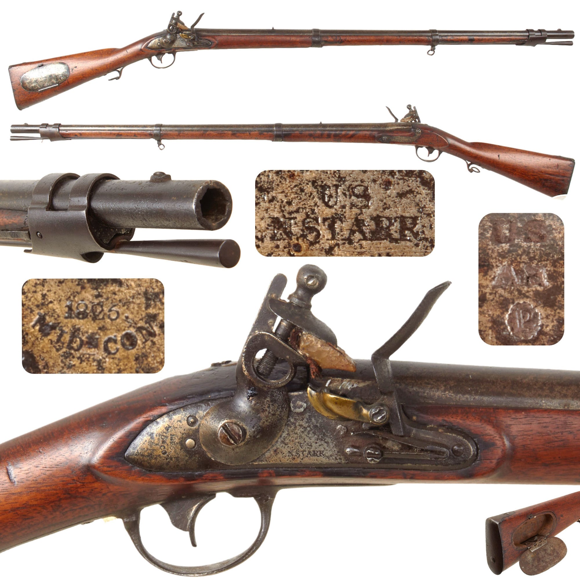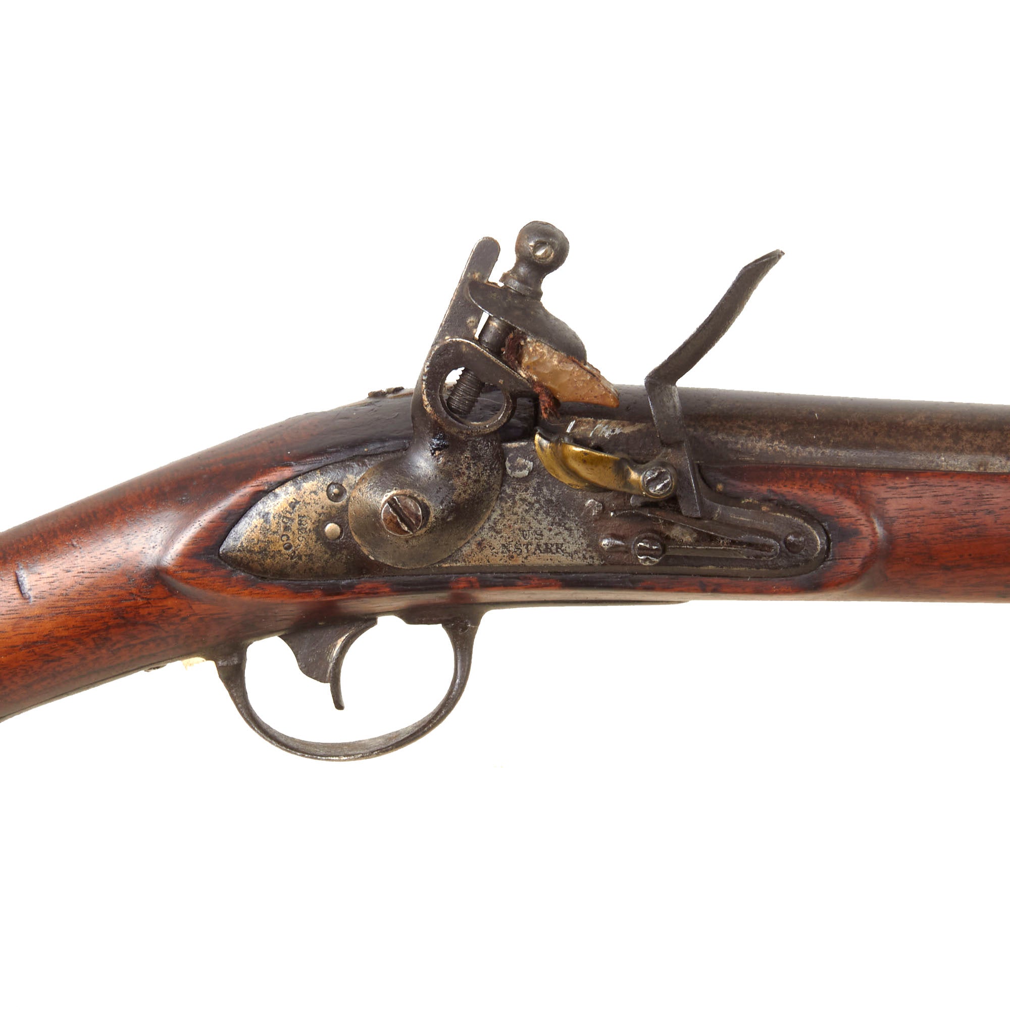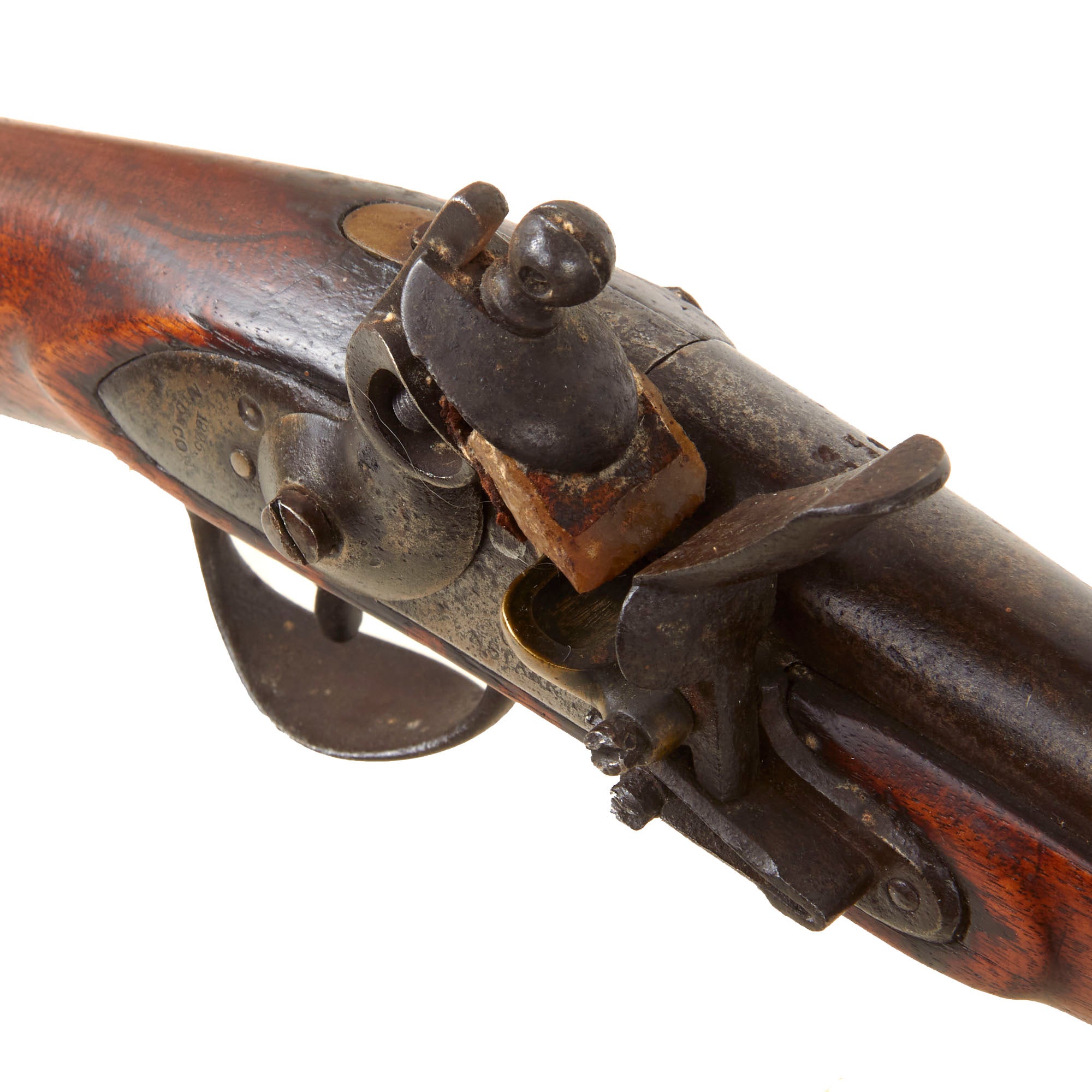 This is a very nice and interesting example of a Model 1817 Common Rifle by Nathan Starr & Co. of Middletown, Connecticut. This example was not converted to percussion and is still in its original flintlock configuration, with the majority of these being converted for use during the Civil War. It definitely shows much wear from service use, with the original browned finish now worn away, and most of the metalwork bearing a mottled oxidized steel patina with staining and past peppering. There is also a bit of more serious oxidation in some places, and the rifle looks to have seen long use and exposure to the elements. The lock is a bit worn, but still has the correct address marking:-