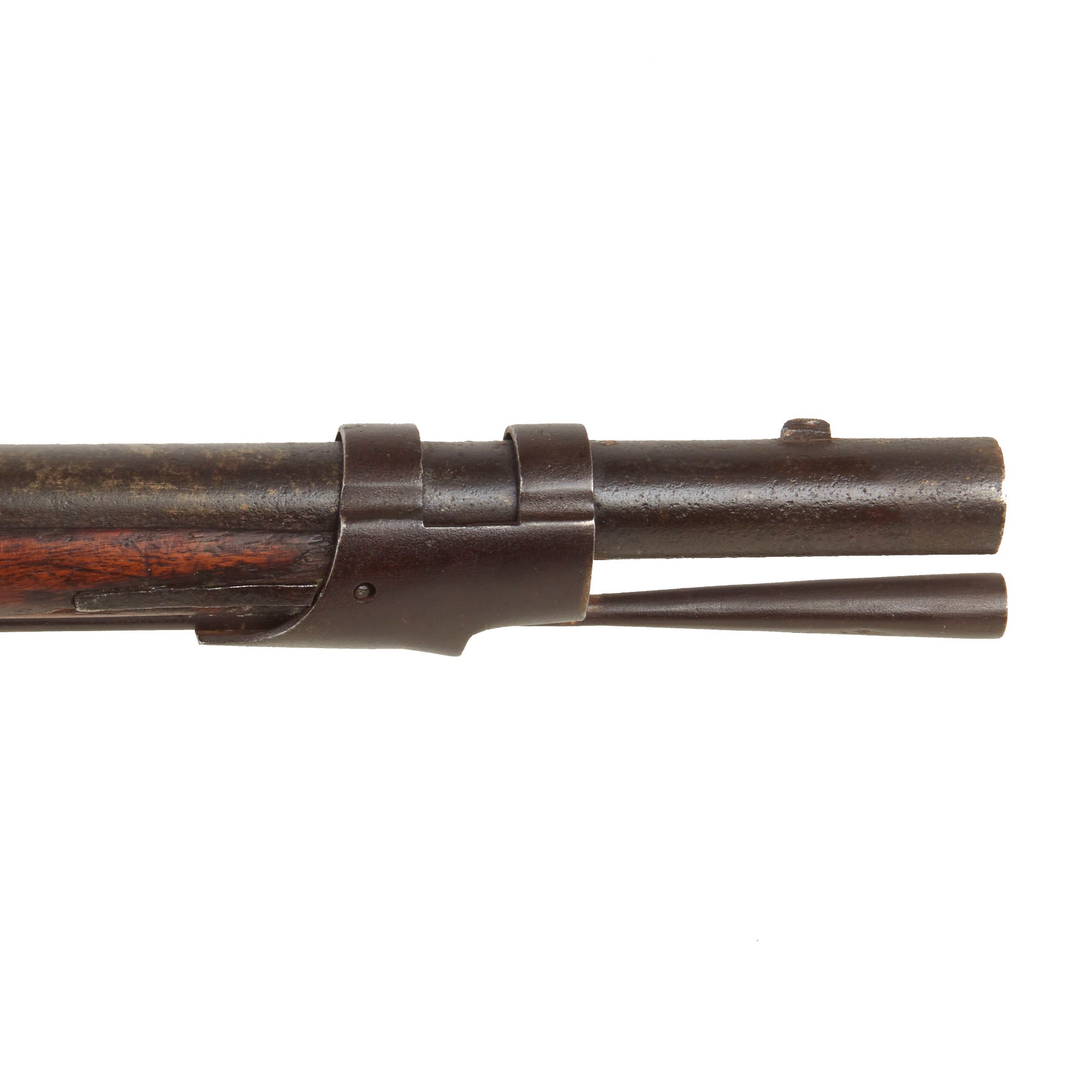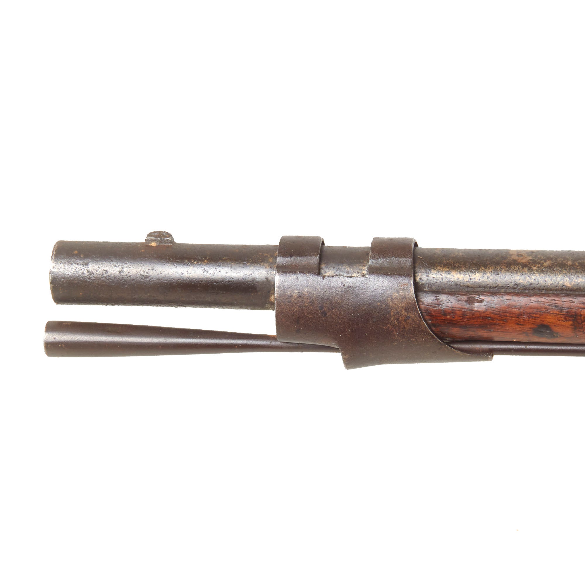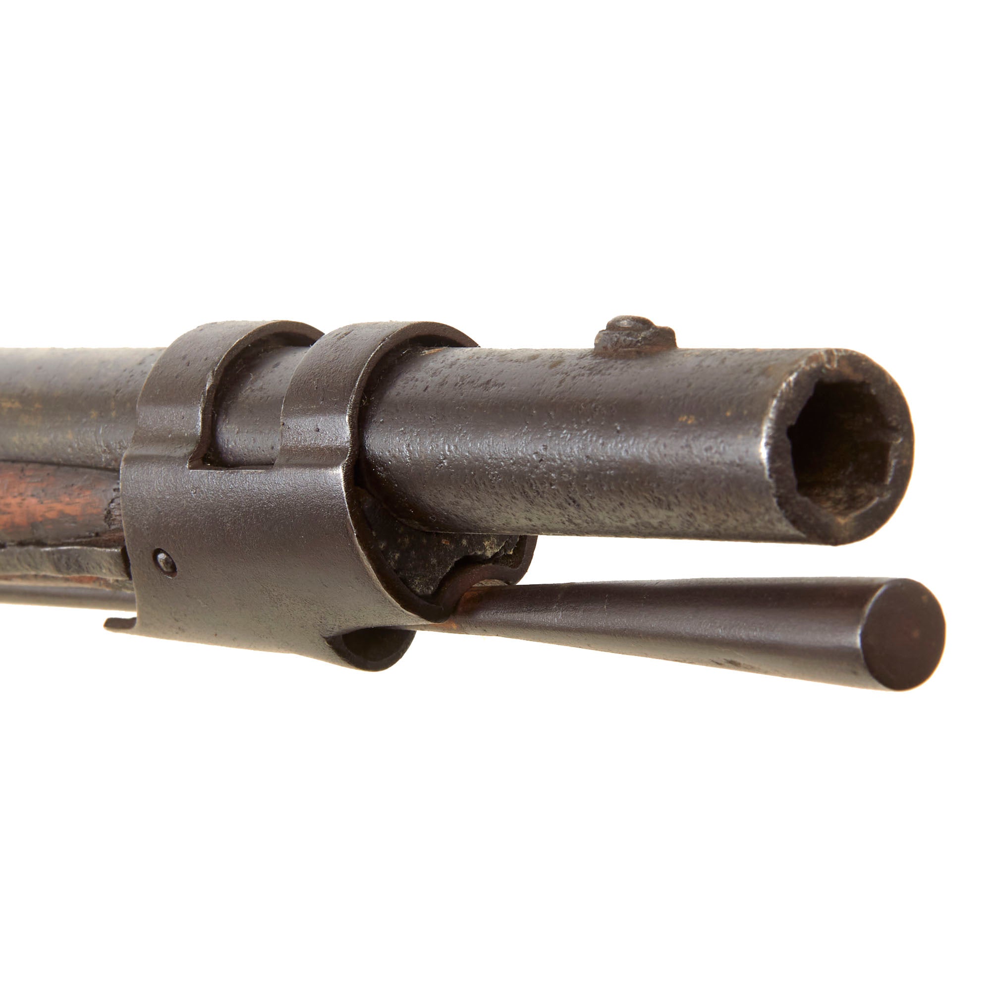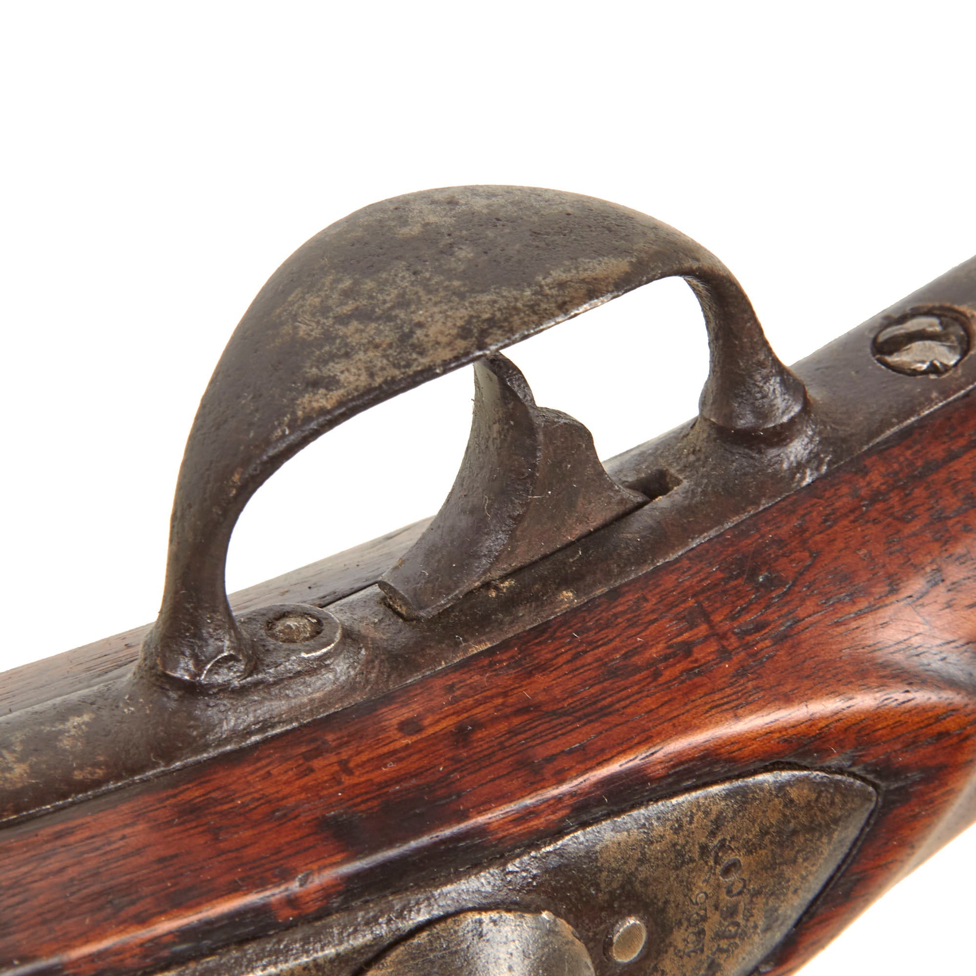 The barrel has some powder burn around the touch hole, which has oxidized and worn the breech area a bit, although the stock is still in good shape around it, which is often eroded. The bore still shows clear rifling, which is the correct seven groove type for the Model 1817 common rifle. It is a simple "cut" type of rifling as used on many early firearms, and the cuts are still clearly visible and deep. There is not any major oxidation or fouling present on the interior, just some wear from service, so it was definitely well cared for.