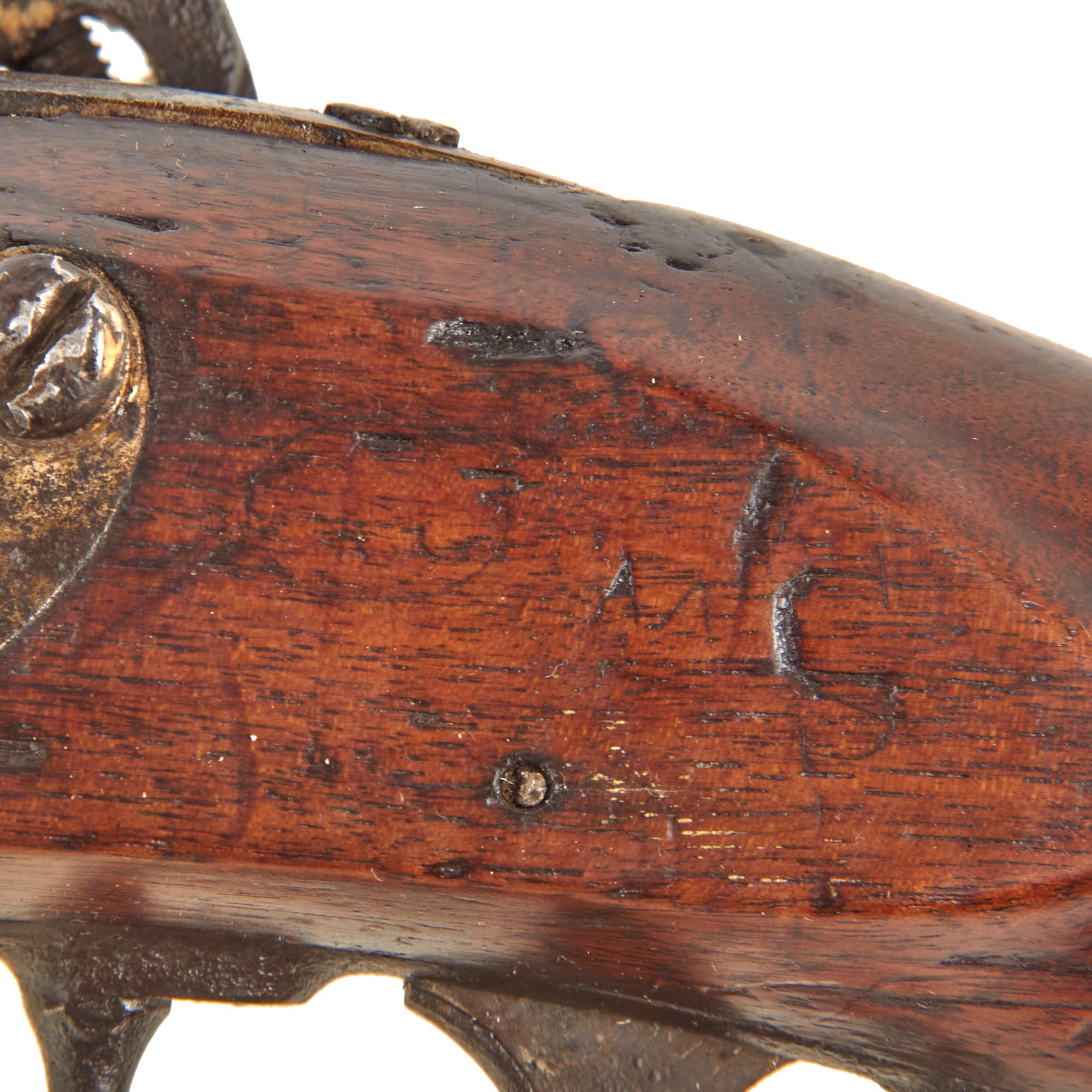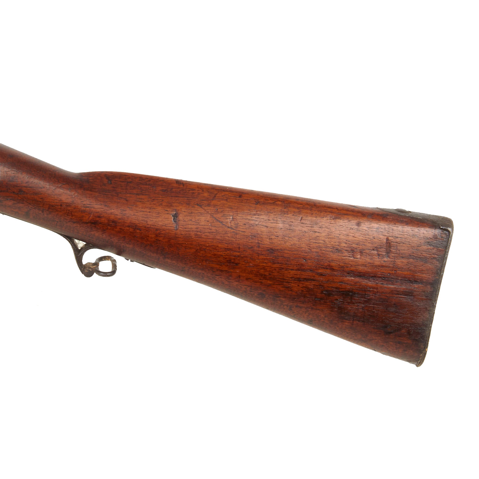Condition wise, it really has a great aged look to it, with the metalwork showing a lovely aged patina from long service and cleaning. The lock is still fully functional, holding correctly at half cock and firing at full, with a strong mainspring. The frizzen is present and moves correctly as well. These originally had a brass-tipped ramrod, so the current installed ramrod looks to be a later replacement, which does not have threads on the narrow end. The iron patch box on the butt stock is in good shape, though it can be difficult to get it to open. The stock shows wear from use, but there isn’t any loss of material or any serious cracks, with the wood holding up very well. There are areas of staining from contact with the stock and iron fittings, but it still has a great red brown color over most of the surface.