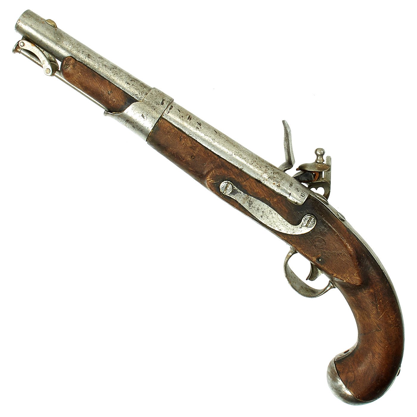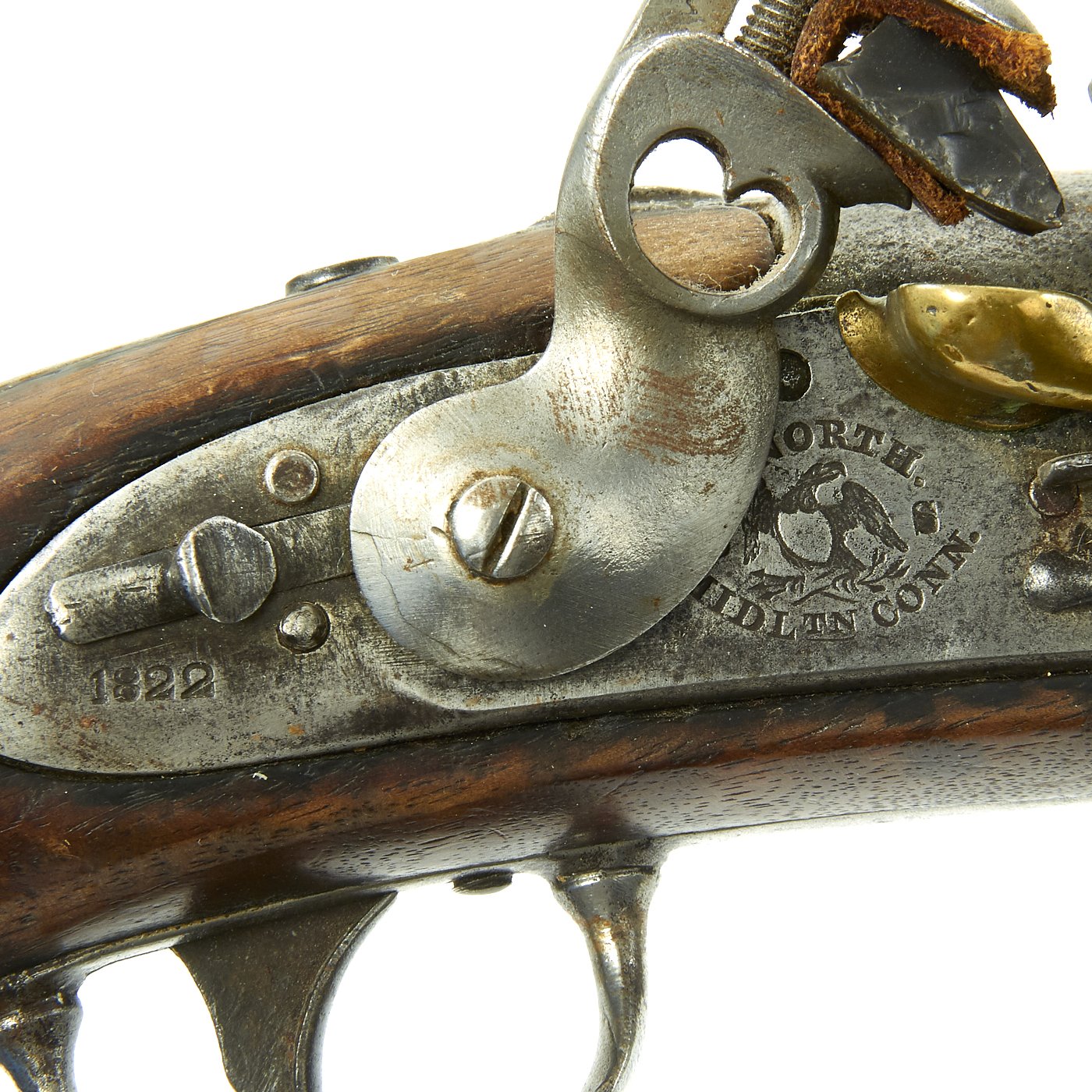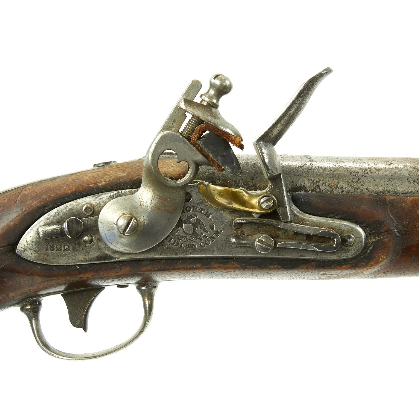 Original Item: Only One Available. This is a totally correct U.S. M-1819 Flintlock pistol made by Simeon North in Middletown, Connecticut, still in the original flintlock configuration. North had a 53 year relationship with the U.S. War Department, and the contract for the Model 1819 pistols was one of the last contracts North had for martial pistols from the U.S. Government. The model 1819 has a longer barrel than the previous model 1816, and features a "captured" ramrod which cannot be easily lost, as well as a half-cock safety on the lock. Many of these pistols were converted to percussion later in the 19th century, but this one escaped such treatment.
