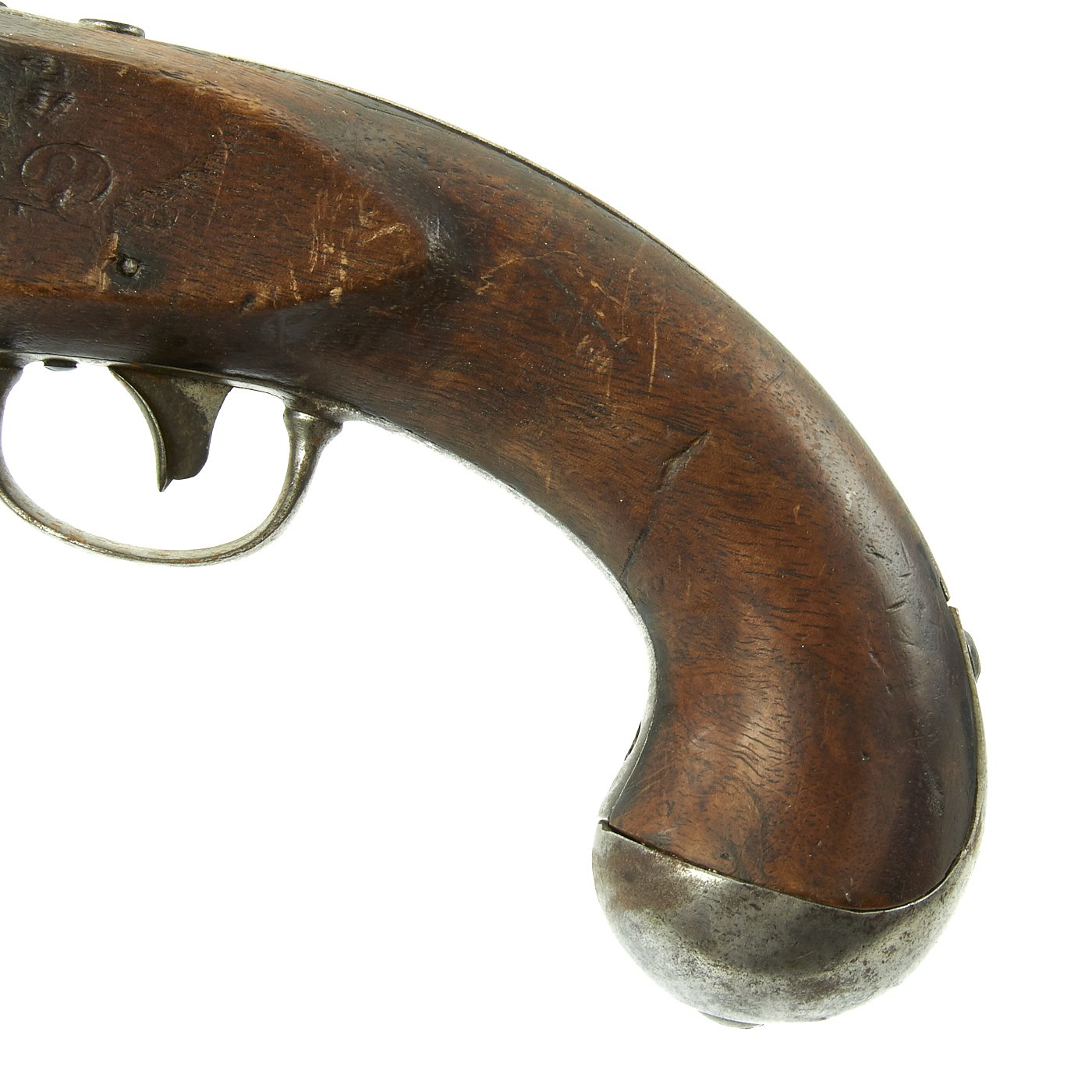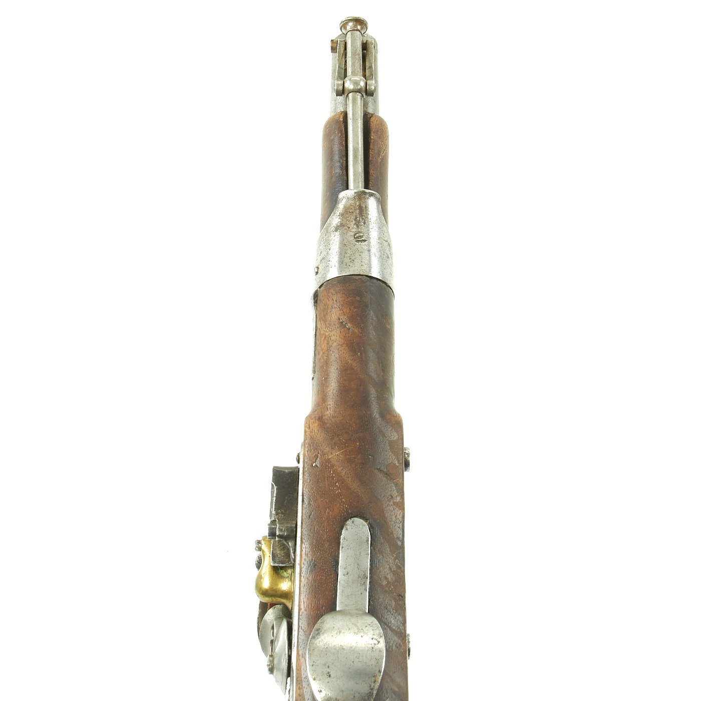 The wood stock bears the ghost of it's Government inspector's Cartouche in an oval just behind the side plate. Steel and iron surfaces shows old staining from rust and pitting but the pistol is still in tight working condition, with the lock holding properly at half cock, and firing at full.