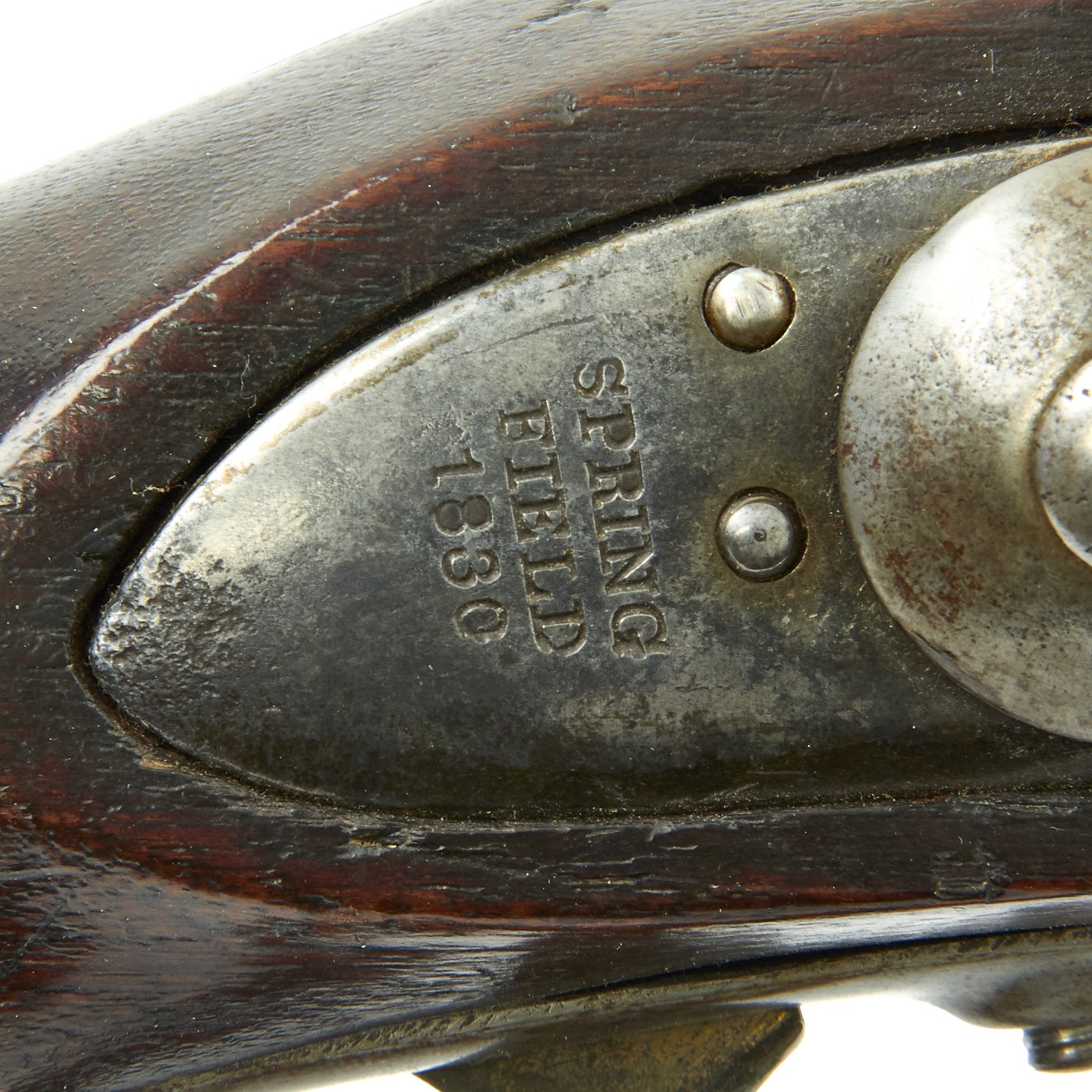 This example was originally manufactured at the Springfield Armory in 1830, as indicated by markings on the tail of the lock plate: