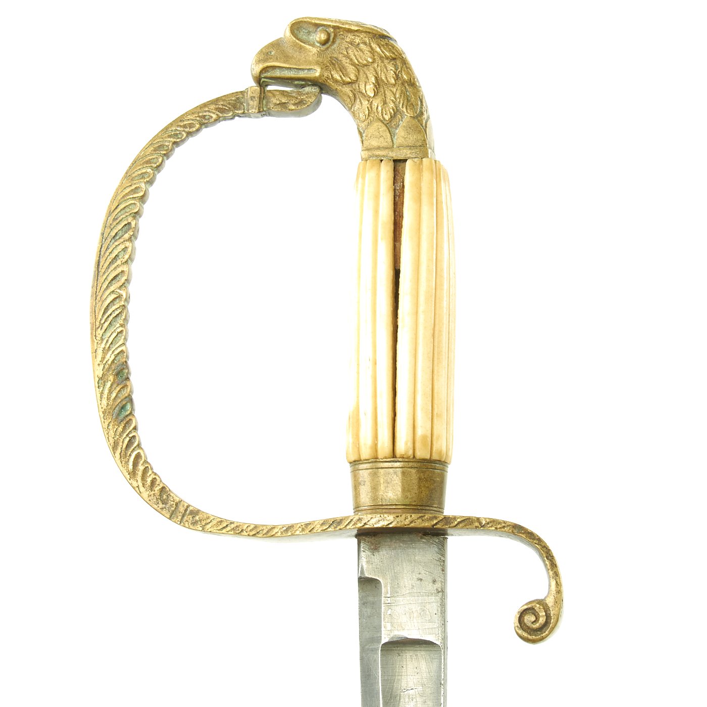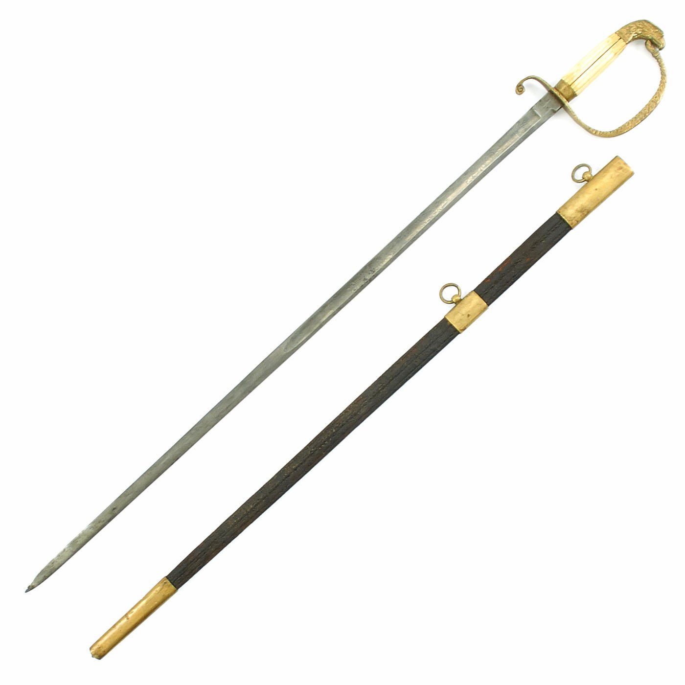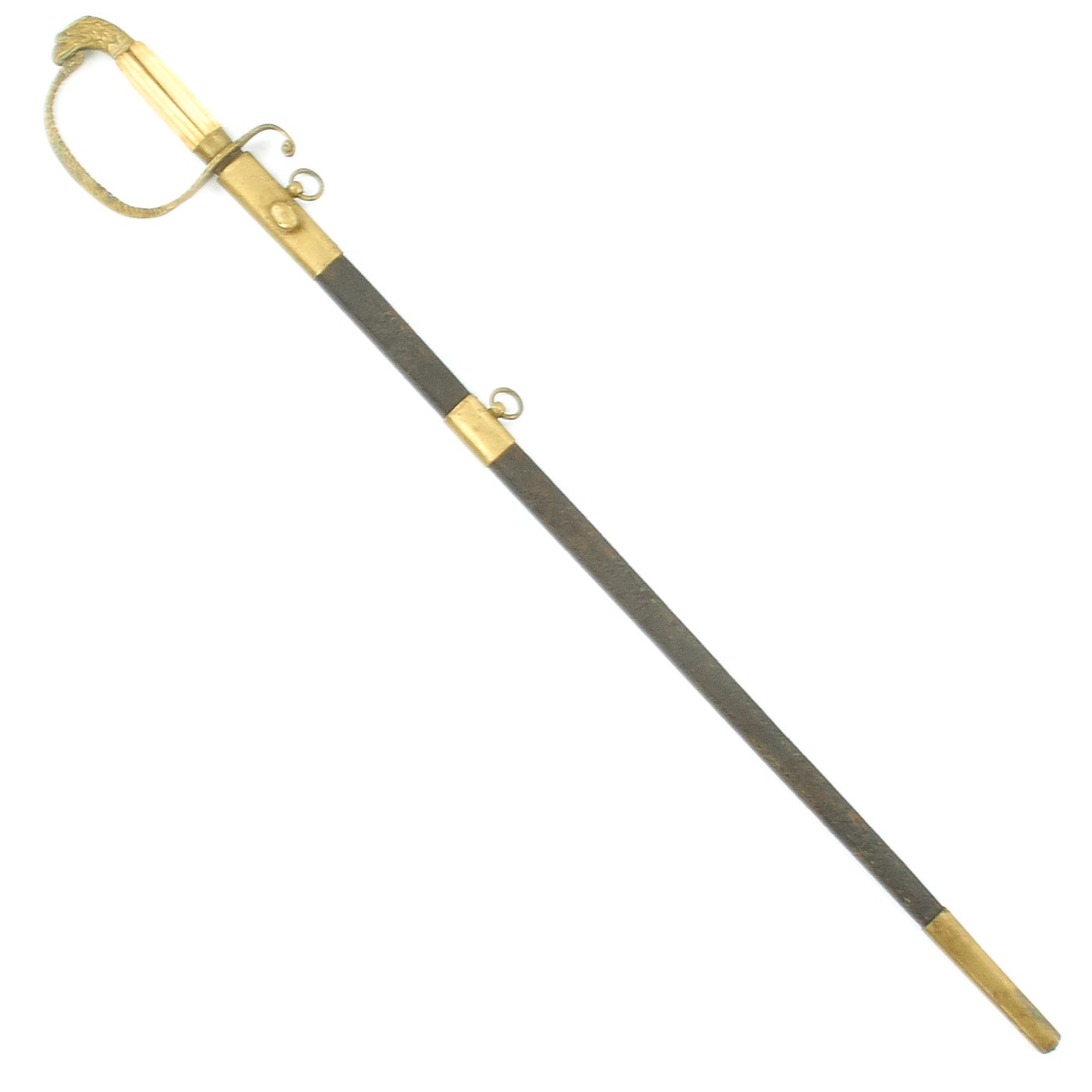 Original item: Only One Available. Here we have a very smart original Eagle Headed and ivory gripped U.S. Officer's sword, typical of the type made in the 1830s and later. The sword is all brass mounted with a standard "D" hand guard and a a very nice "closed mouth" Eagle pommel. The grip is fluted ivory or bone, and has split down the middle on both sides, so it is loose on the tang. The hand guard is also somewhat loose, and the original gilding on the brass is all but gone.