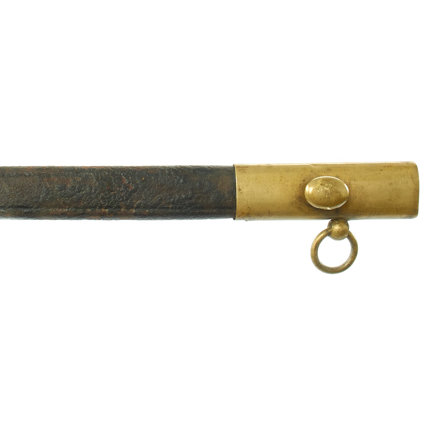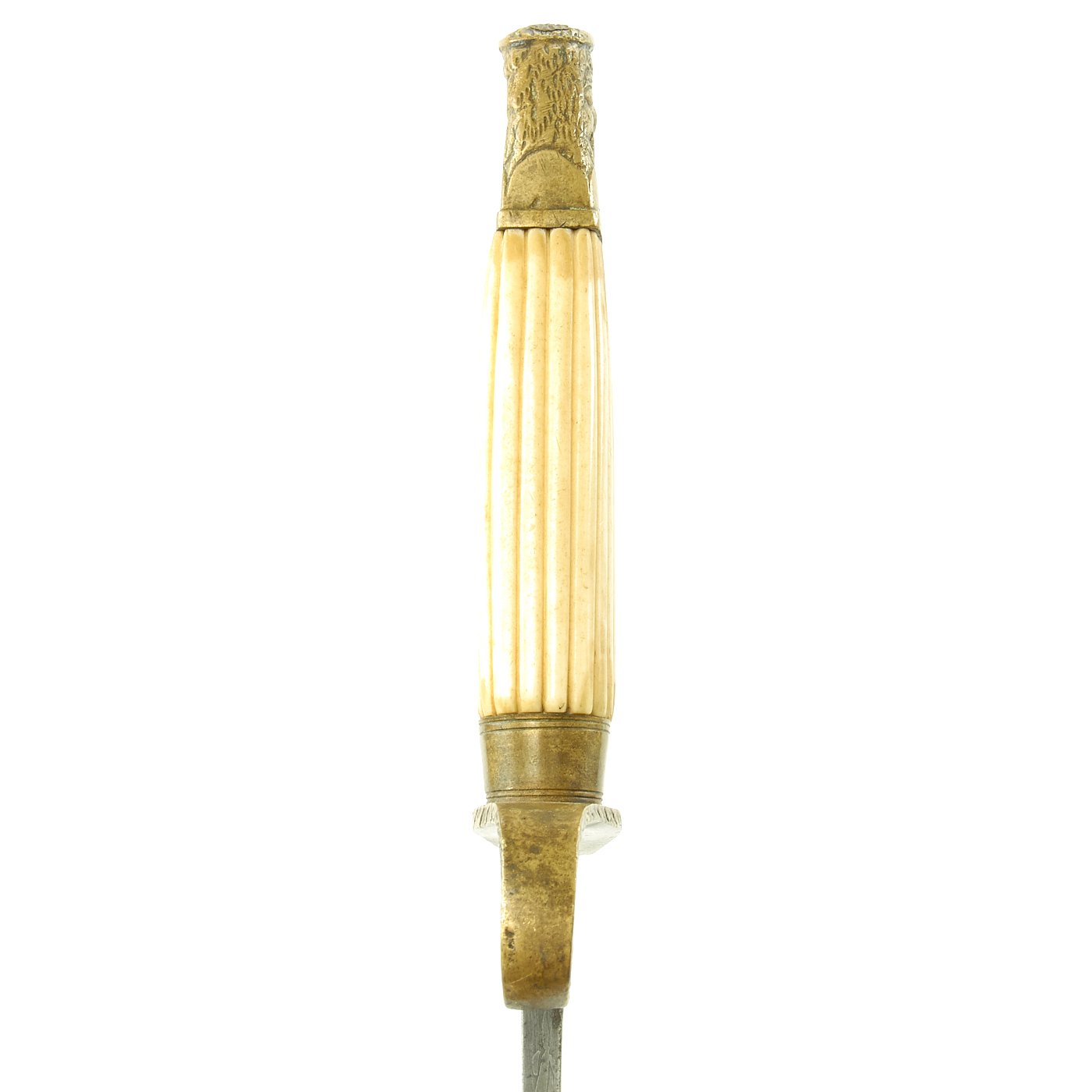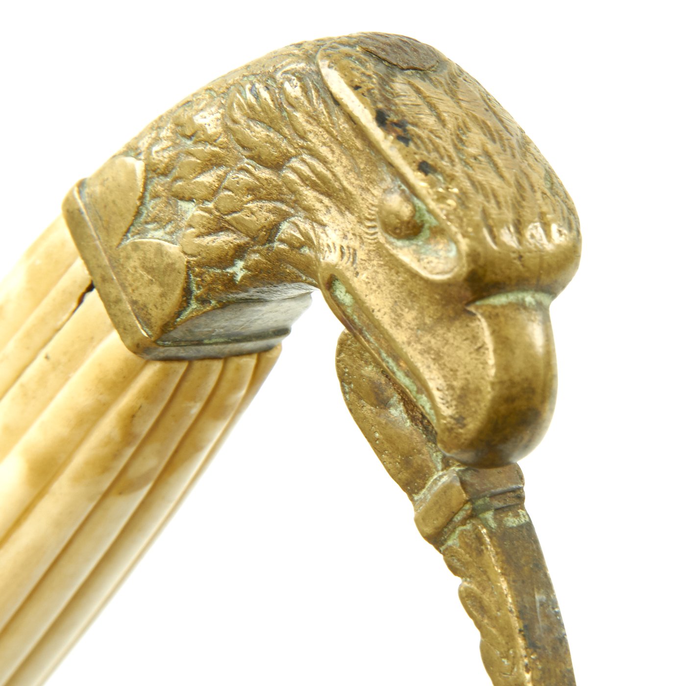Original item: Only One Available. Here we have a very smart original Eagle Headed and ivory gripped U.S. Officer's sword, typical of the type made in the 1830s and later. The sword is all brass mounted with a standard "D" hand guard and a a very nice "closed mouth" Eagle pommel. The grip is fluted ivory or bone, and has split down the middle on both sides, so it is loose on the tang. The hand guard is also somewhat loose, and the original gilding on the brass is all but gone.