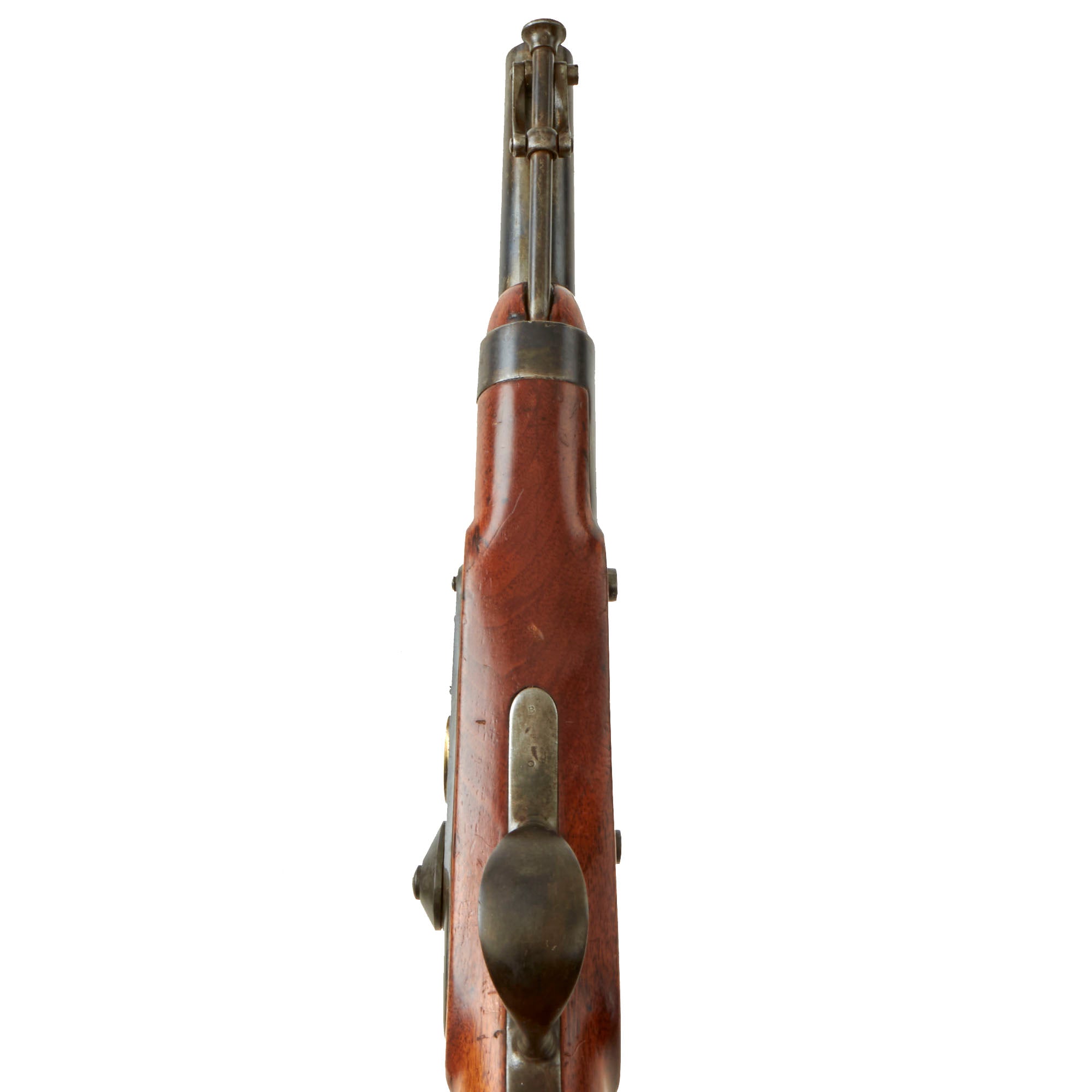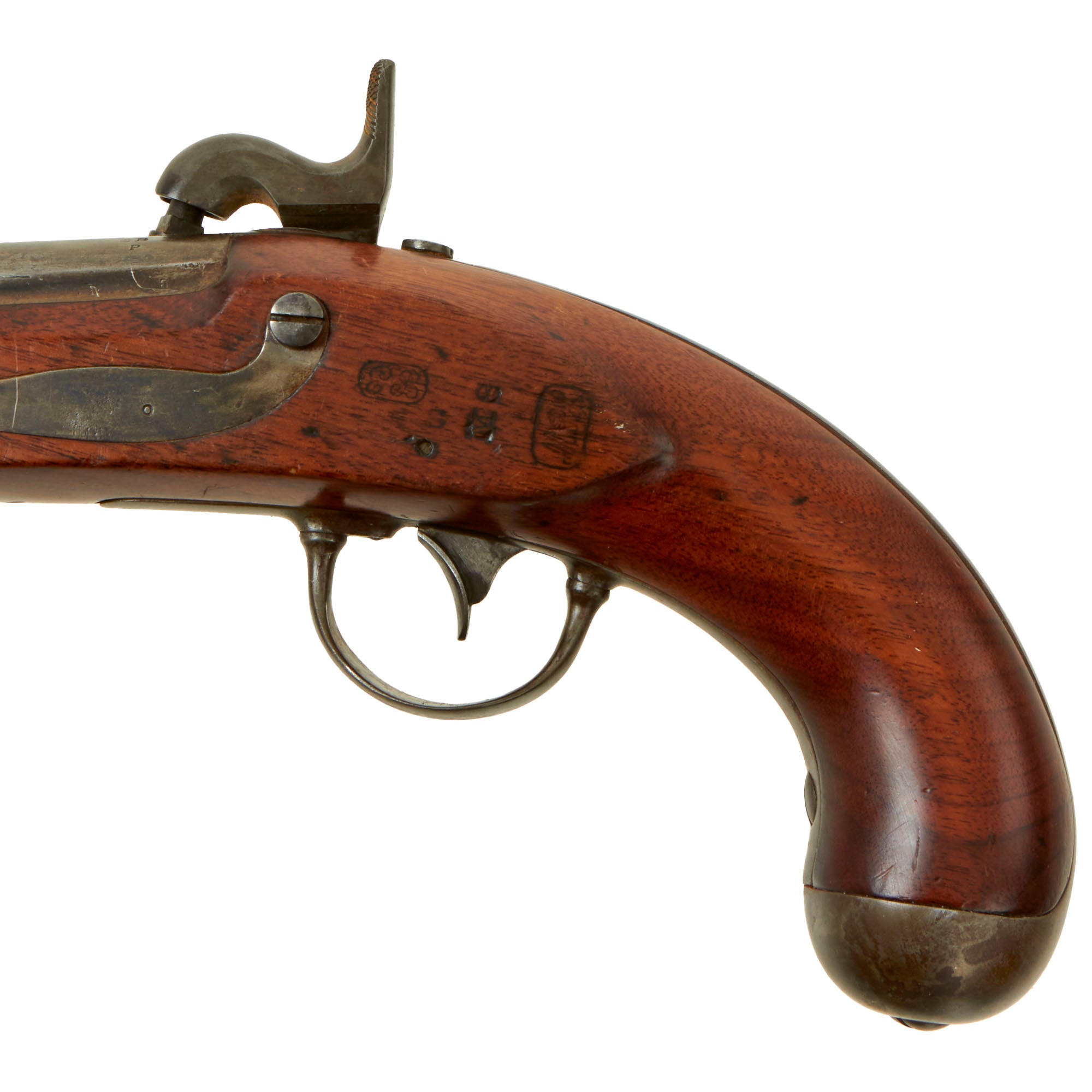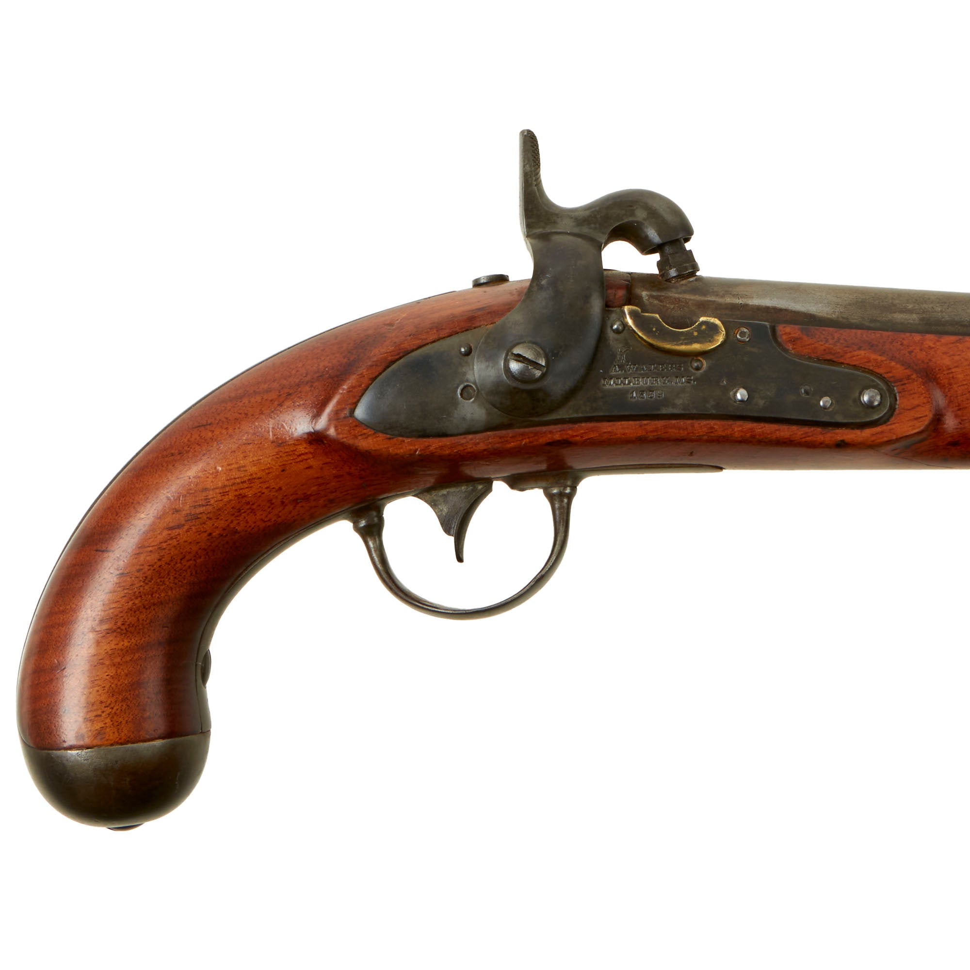 Comes complete with its "trapped" swivel Ram Rod for easier use by mounted cavalry troops when reloading. The pistol measures 14" overall, with a smooth bore barrel of 8 1/2", which is marked MS / U.S. / EB / P on the breech, for inspector Elizur Bates, who inspected waters pistols from 1838-1846. Some years after production, probably in the early 1850s, it was converted to percussion, after which it only saw light use, most likely in the Civil War. There are still the remains of the brass pan attached to the lock plate, as is correct. The barrel is a "cone-in-barrel" or "Belgian" style conversion, with the cap nipple cone attached directly to the barrel