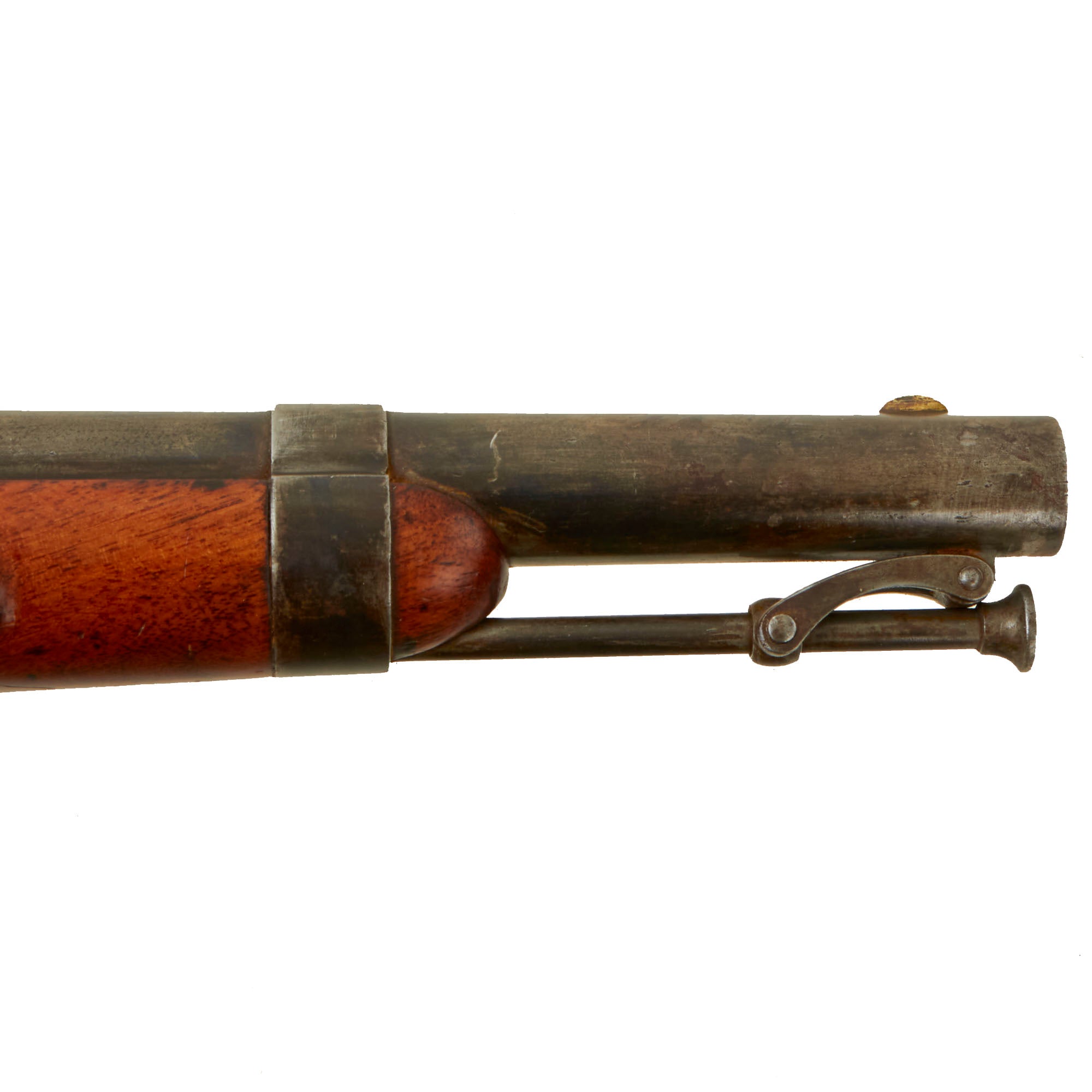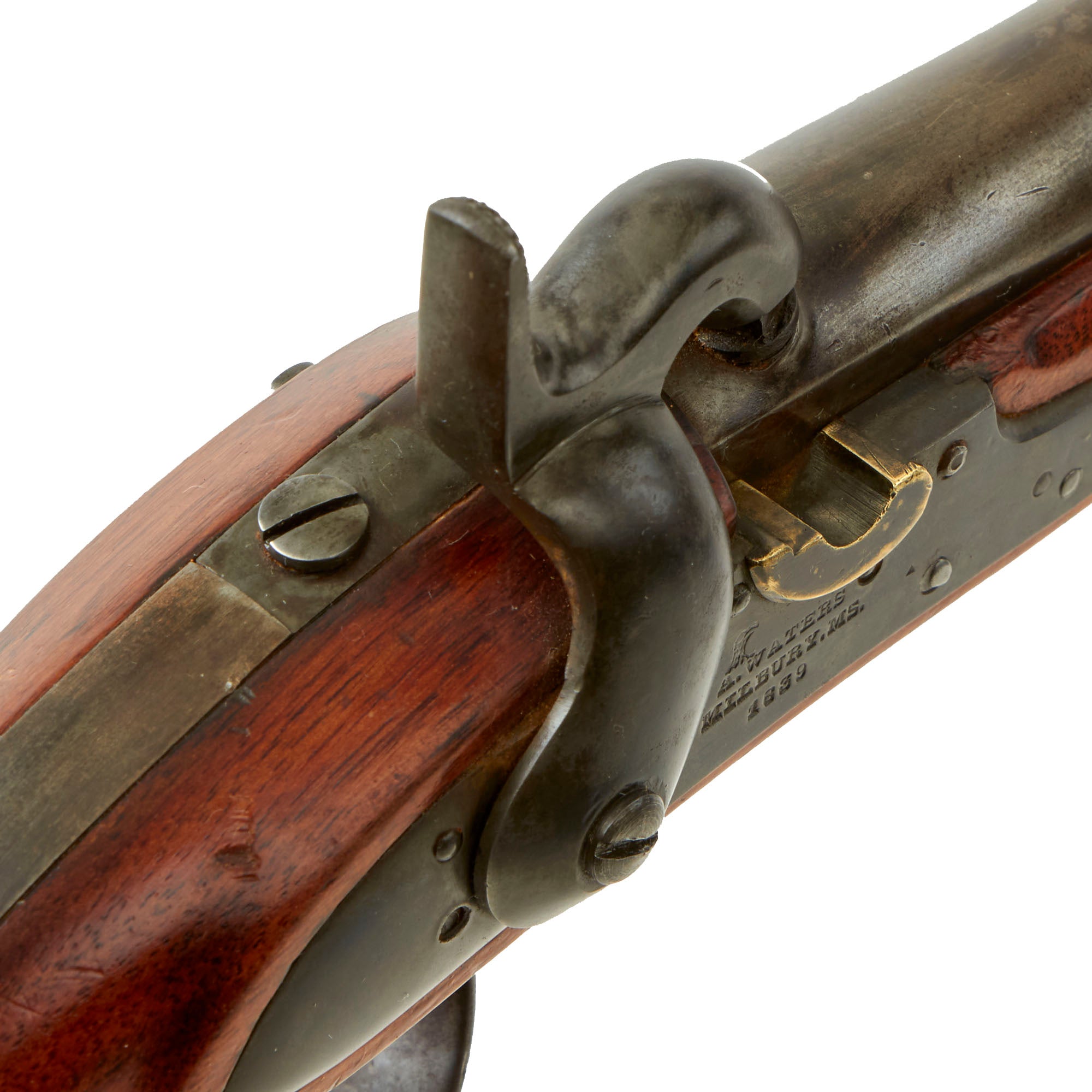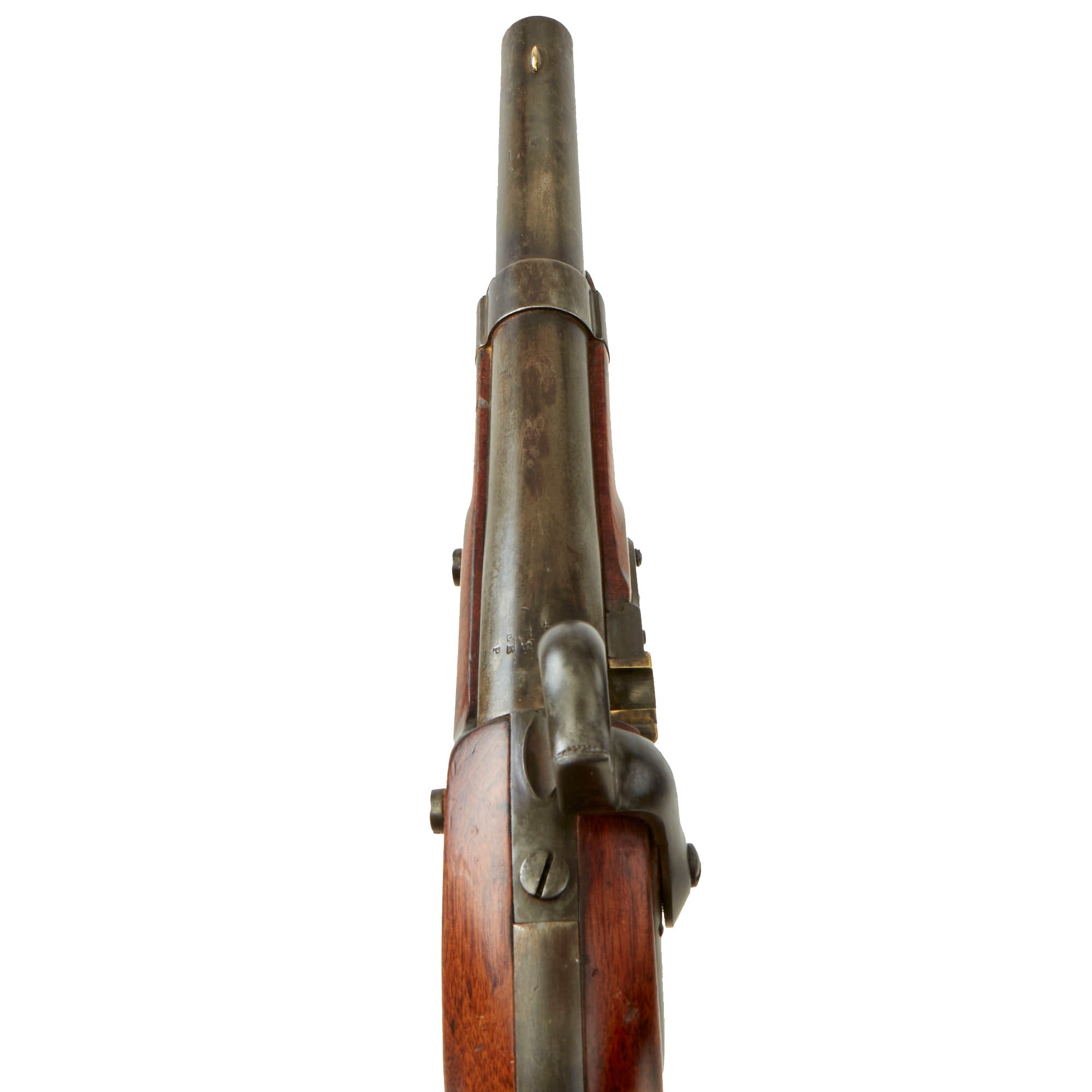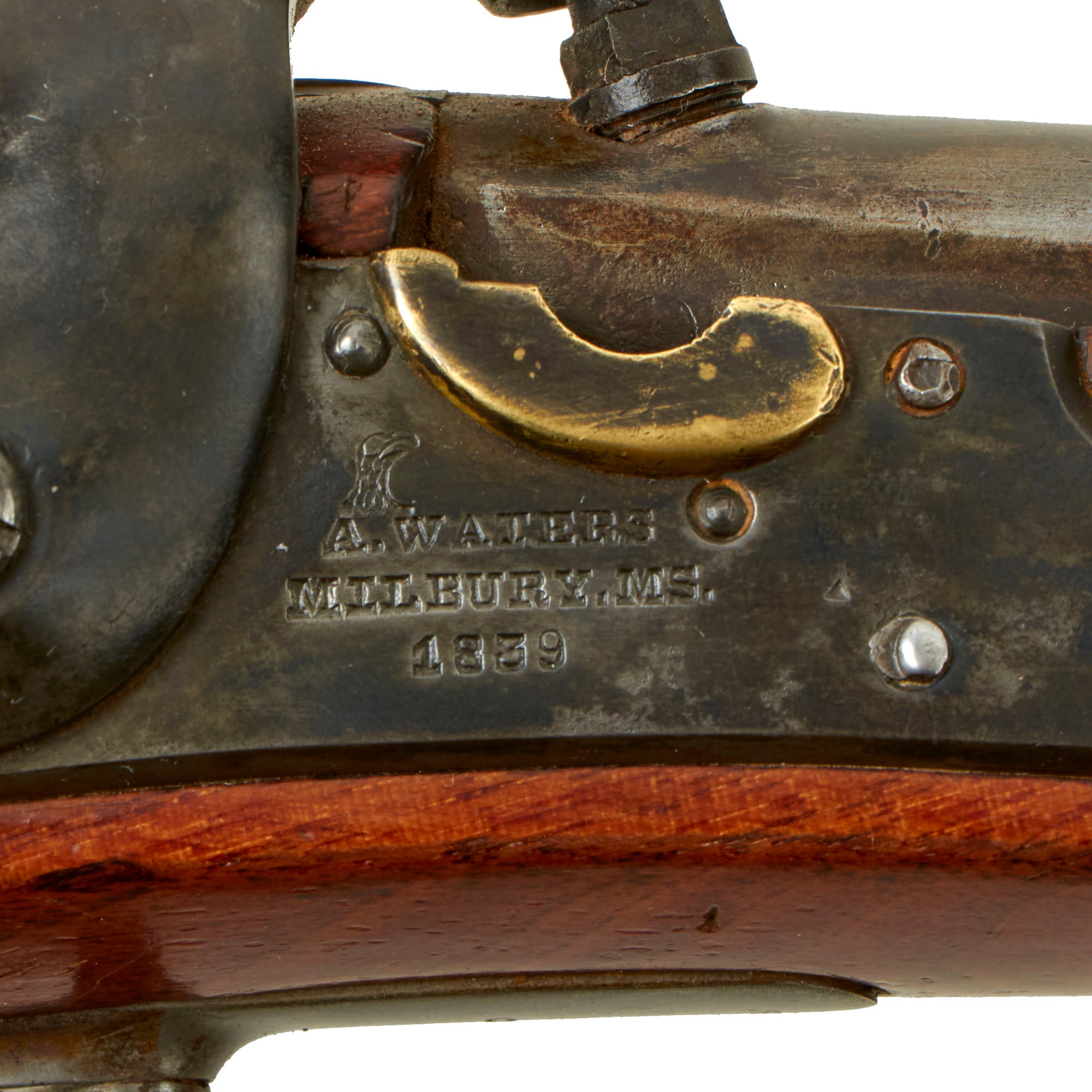 Comes complete with its "trapped" swivel Ram Rod for easier use by mounted cavalry troops when reloading. The pistol measures 14" overall, with a smooth bore barrel of 8 1/2", which is marked MS / U.S. / EB / P on the breech, for inspector Elizur Bates, who inspected waters pistols from 1838-1846. Some years after production, probably in the early 1850s, it was converted to percussion, after which it only saw light use, most likely in the Civil War. There are still the remains of the brass pan attached to the lock plate, as is correct. The barrel is a "cone-in-barrel" or "Belgian" style conversion, with the cap nipple cone attached directly to the barrel