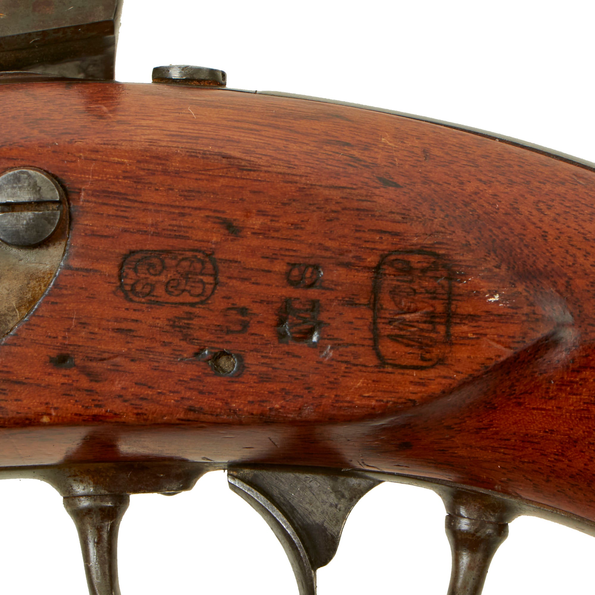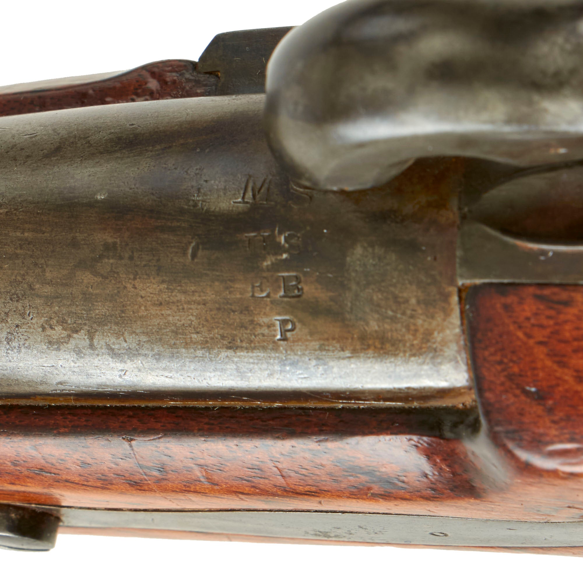 The stock is in very good condition, with the expected wear from service. There are no cracks or major damage that we can see. The grain is lovely, and the surface has a very nice glow. It does look to have been polished and cleaned, which has removed some of the wood. However, it is still marked at the rear of the flat portion of the stock with a stylized "boxed" EB, another inspection mark for Elizur Bates. There is also MPL, for inspector Major Mann Paige Lomax, U.S. Army, who inspected Waters and H. Johnson Pistols from 1837-1843.