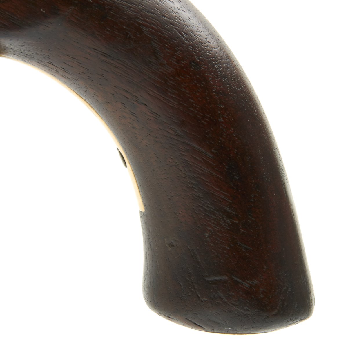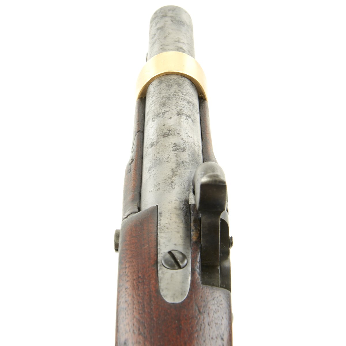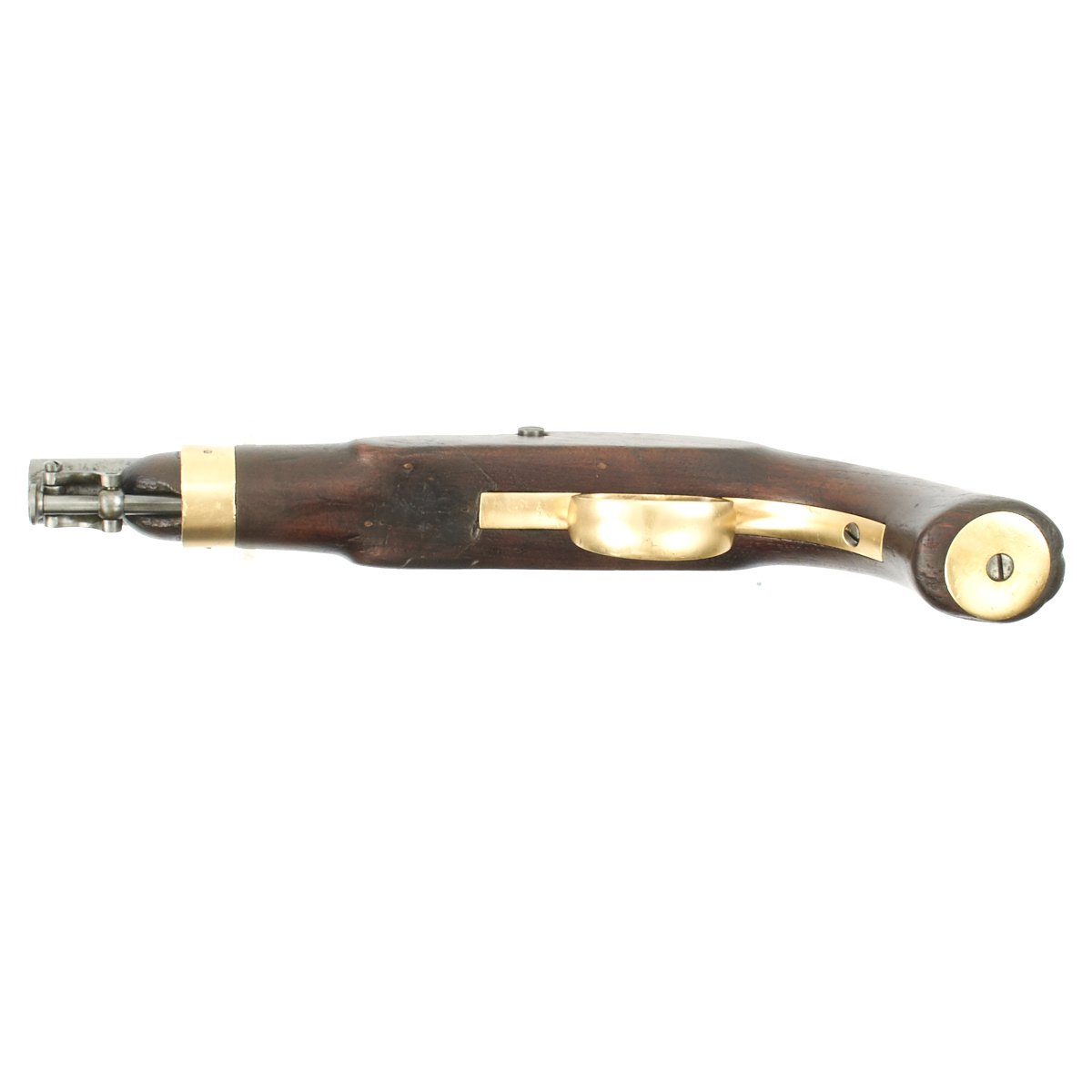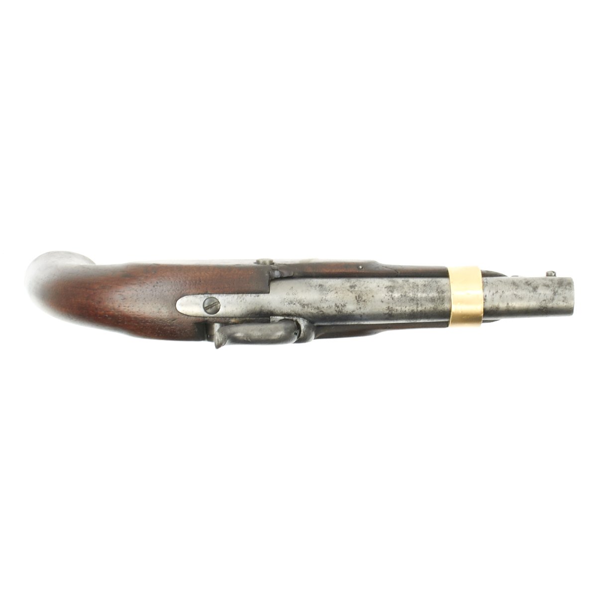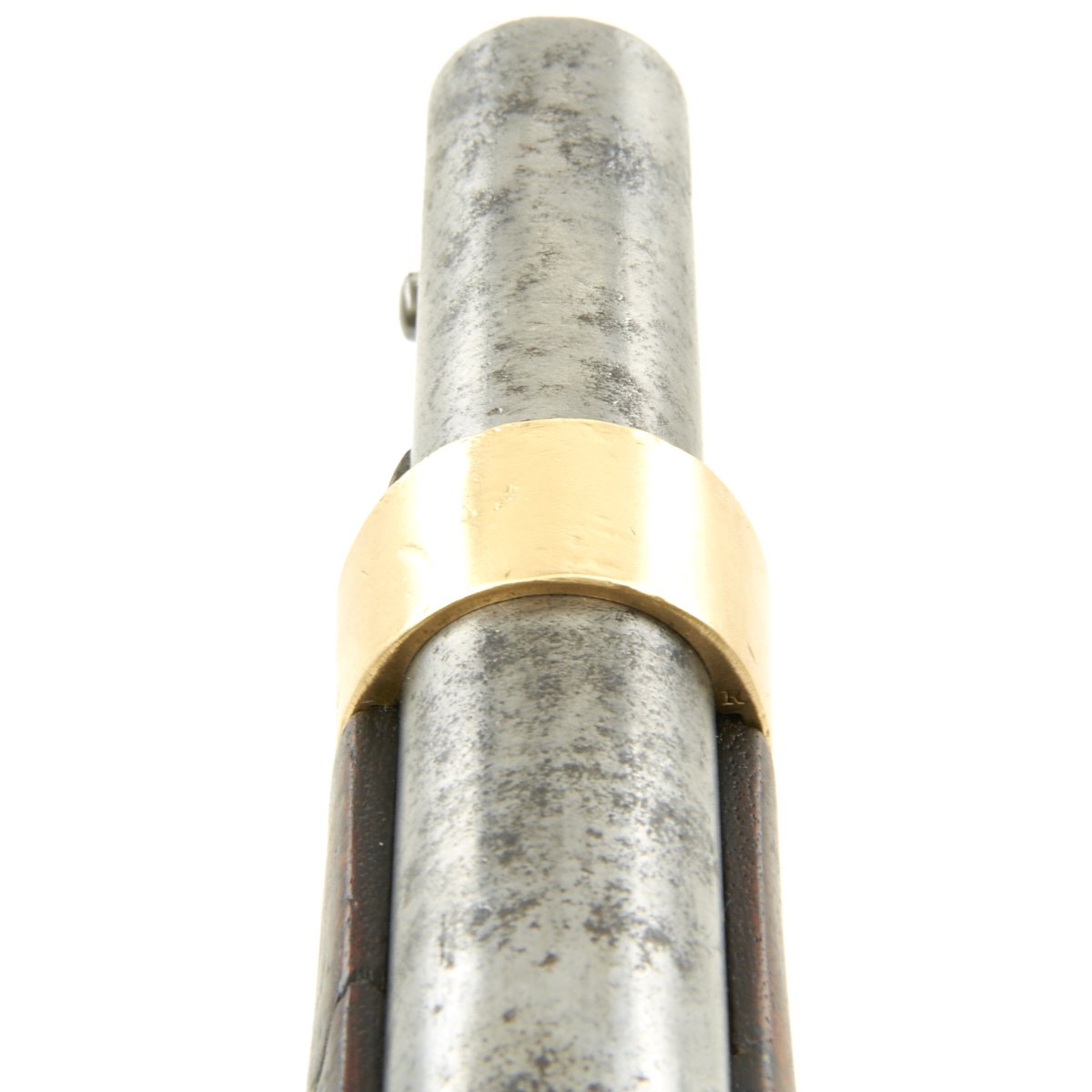 Across the tail of the lock plate wad stamped U.S.N. over the manufacture date of 1845. Also, the barrel is proof marked by the cap nipple with U.S.N. / 1845 / R.P./ P. The butt cap, trigger guard and single barrel band are all made of brass and the pistol is fitted with a "trapped" swivel ramrod which the sailor could not lose.