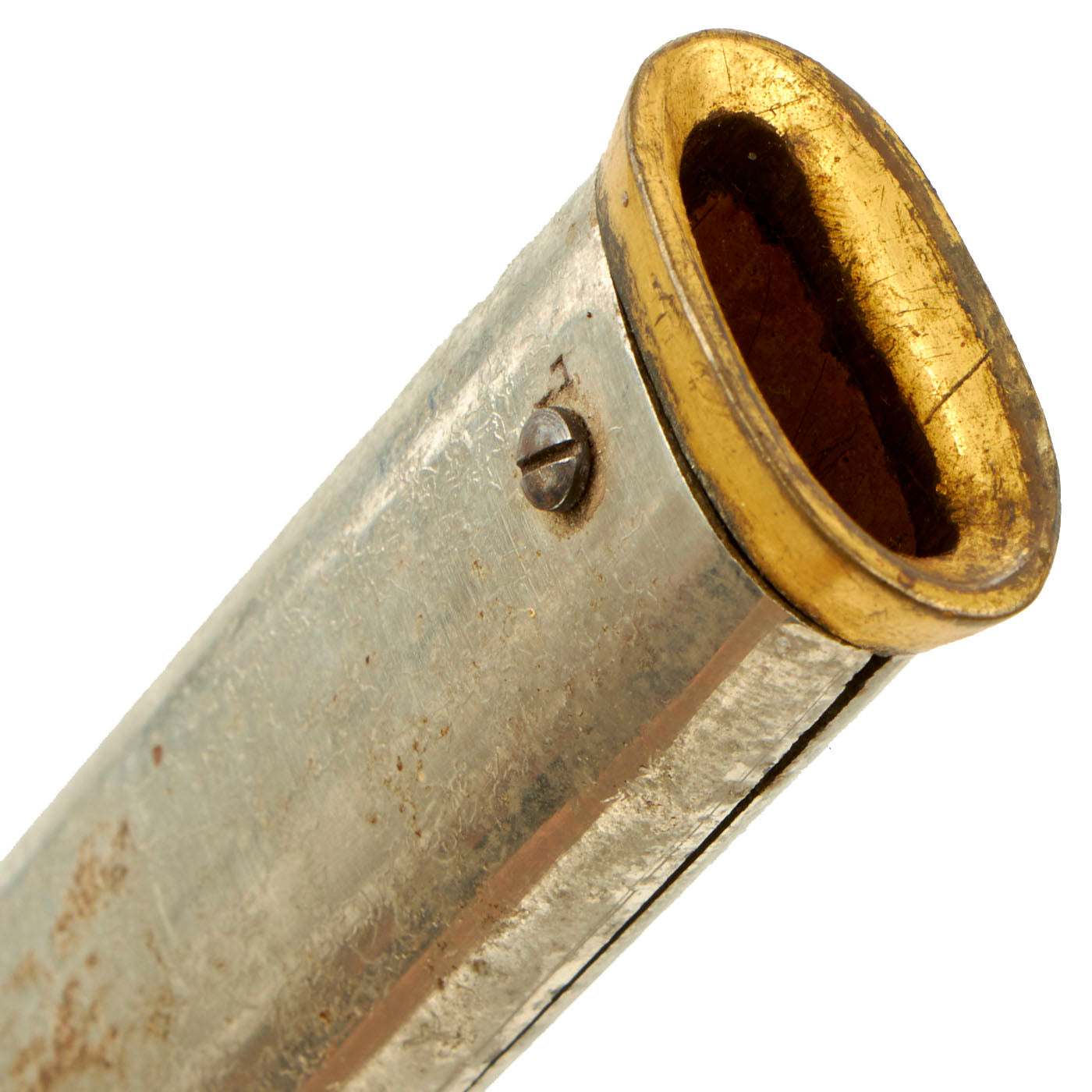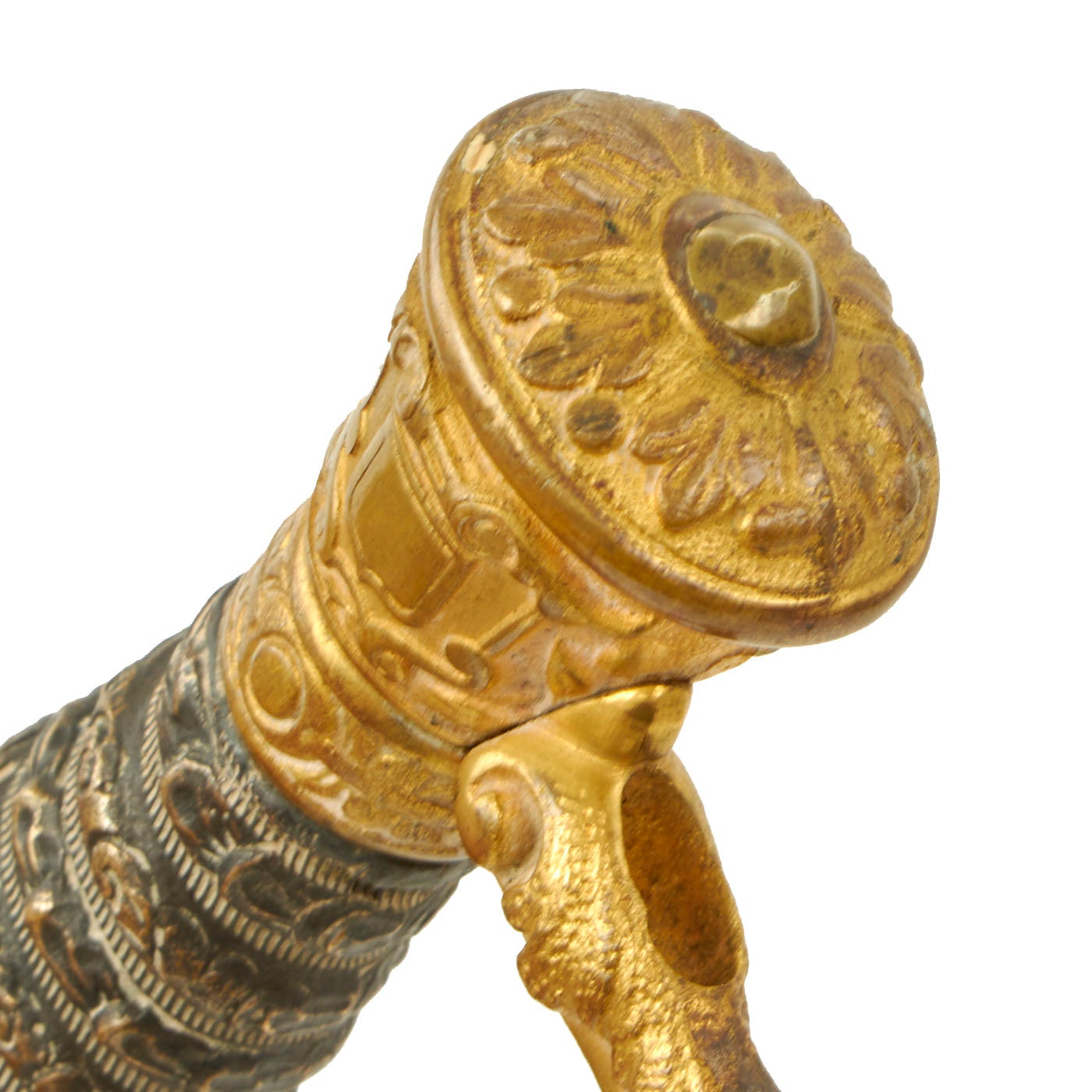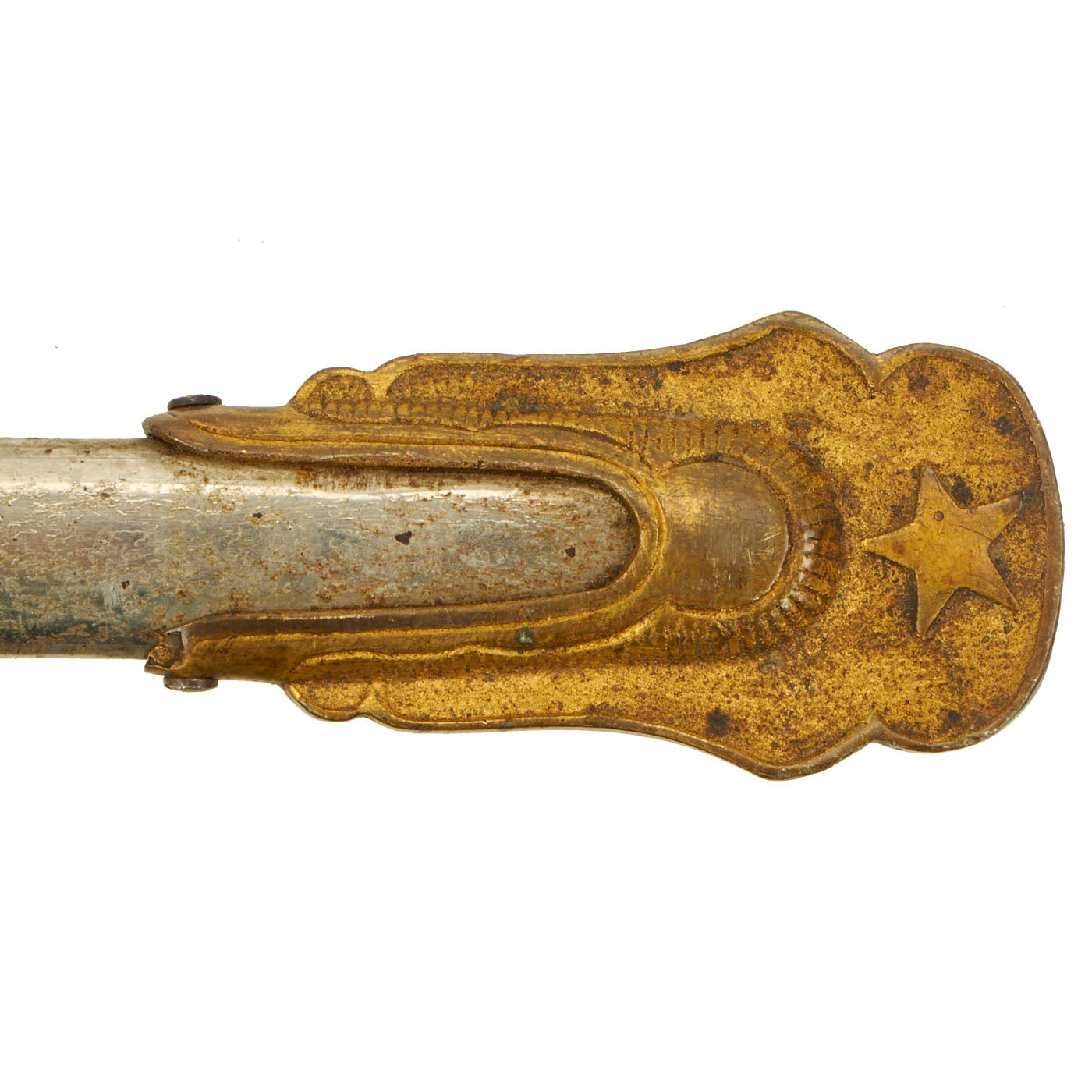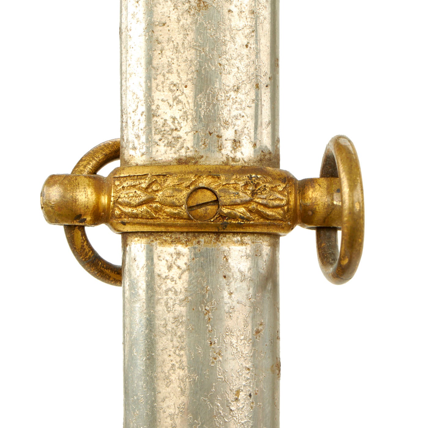 The Sword hilt and handle is brass, with the handle having a separate brass wrap to mimic the wire used on the leather handled versions. Steel scabbard has a pleasing, dark gray/brown patina and is adorned with two brass mounts and a brass drag; the brass throat is still present. Both mounts exhibit a floral display. The top mount sports two rings while the lower mount has only one. The brass drag features a bold star on one side and a set of draped flags on the other. Both sword mounts and the drag are tight. Much of the plating is still present on the scabbard and there are no dents or damage present that we can see.