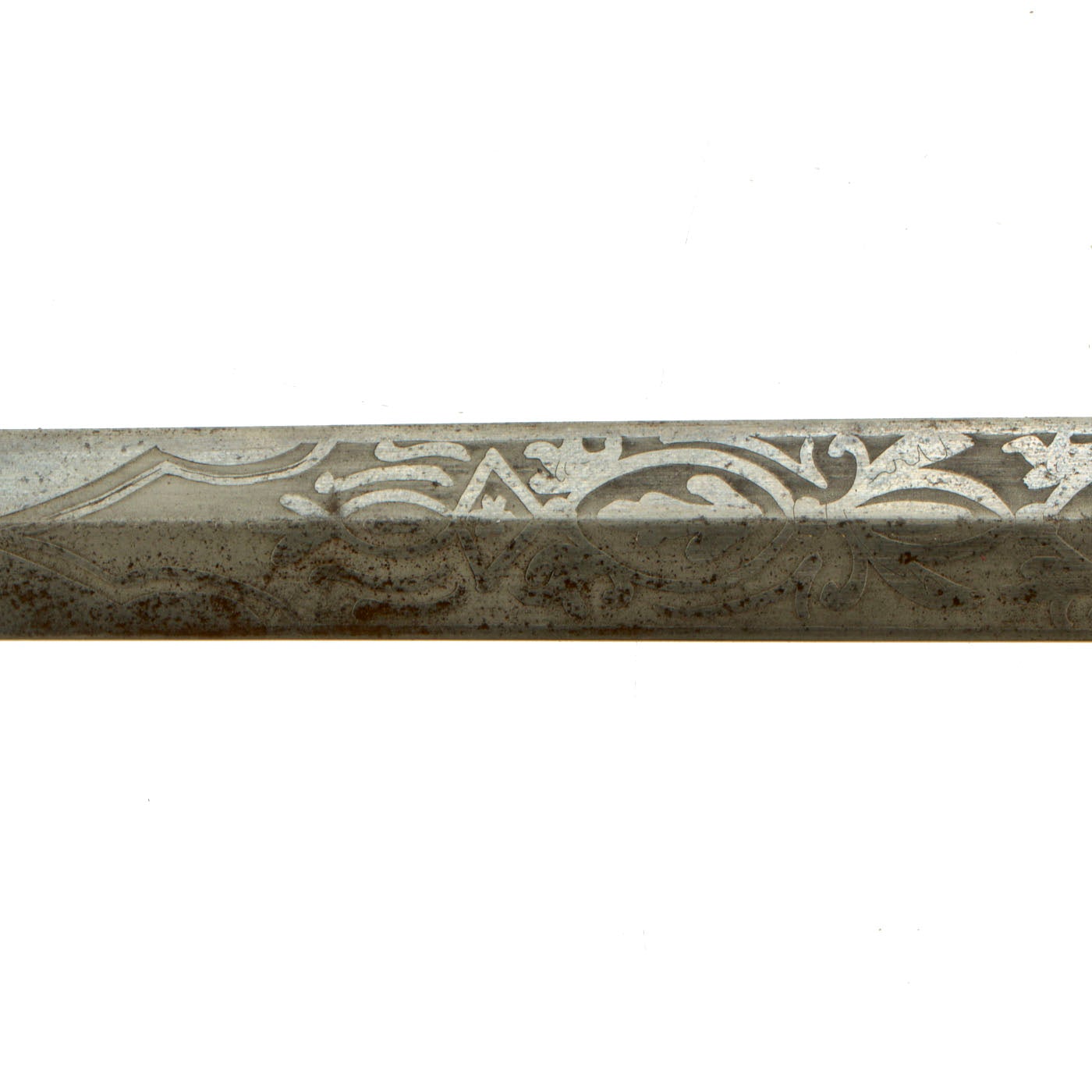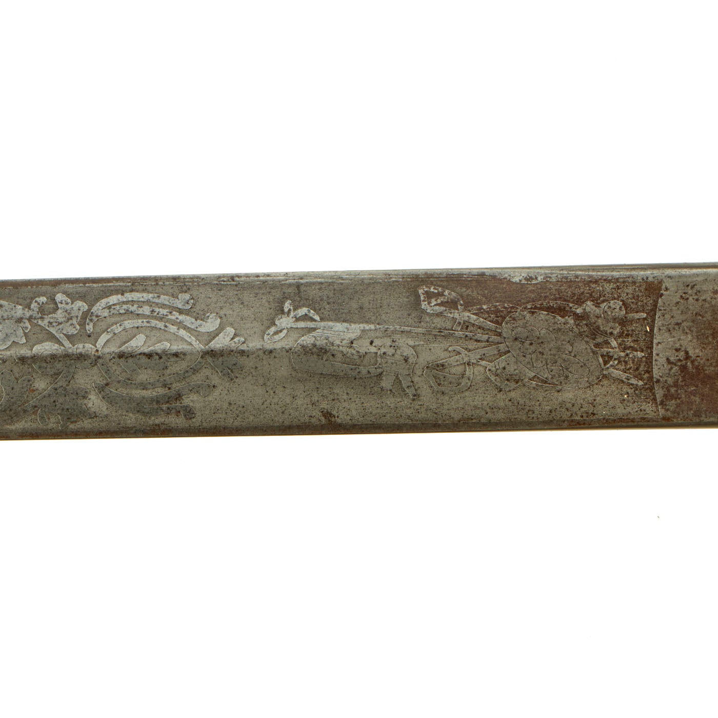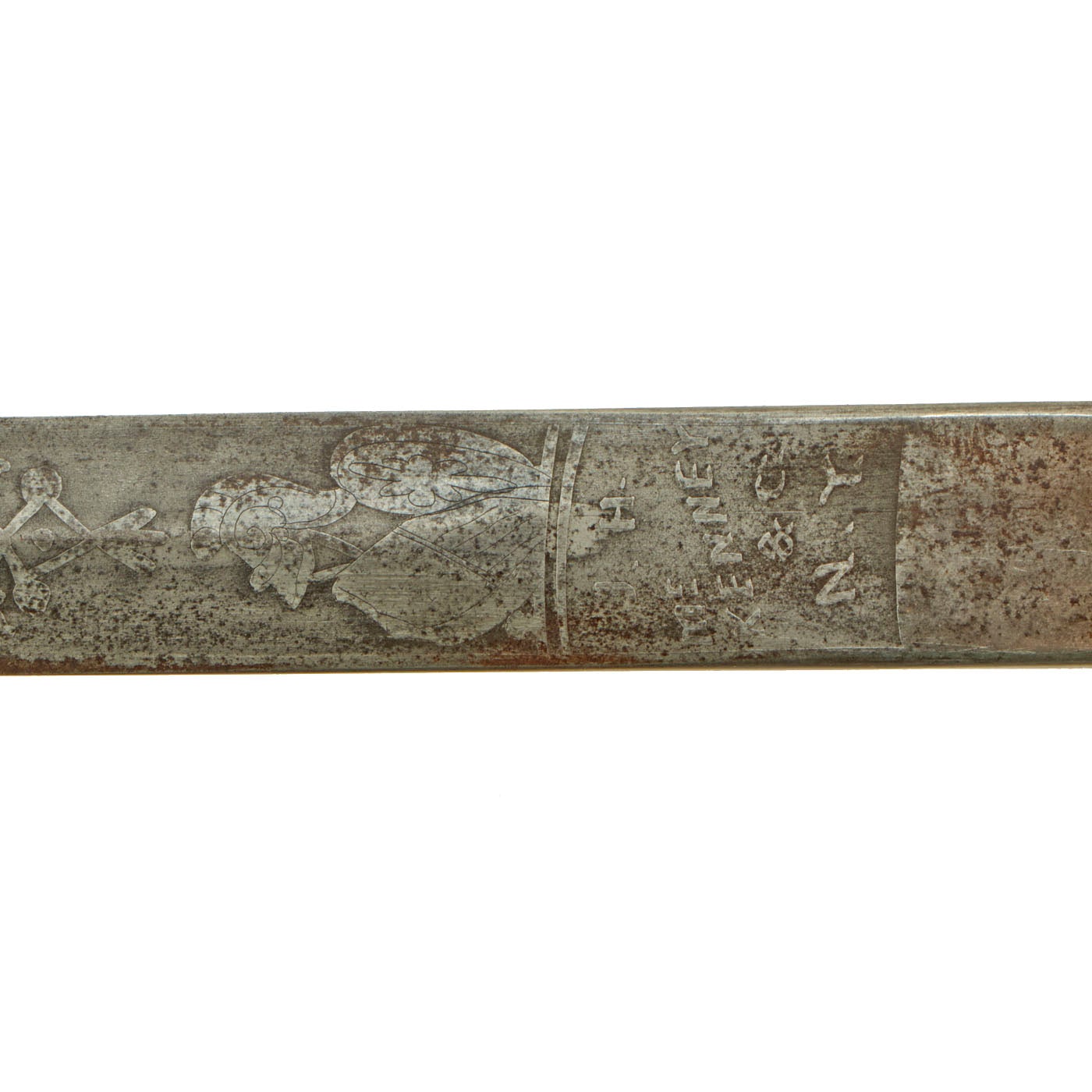 This post-war M1860 sword specimen is an edged weapon that was designed mostly for ceremonial use. The straight, double-edged steel blade measures 31” long and features a diamond-shaped cross section. Blade is embellished on both sides with etched foliate and a military panoply of arms. On the ricasso shows the maker J. H. / Mc / KENNEY / & Co. / N. Y.. Blade is semi-bright with scattered age discoloration spots.