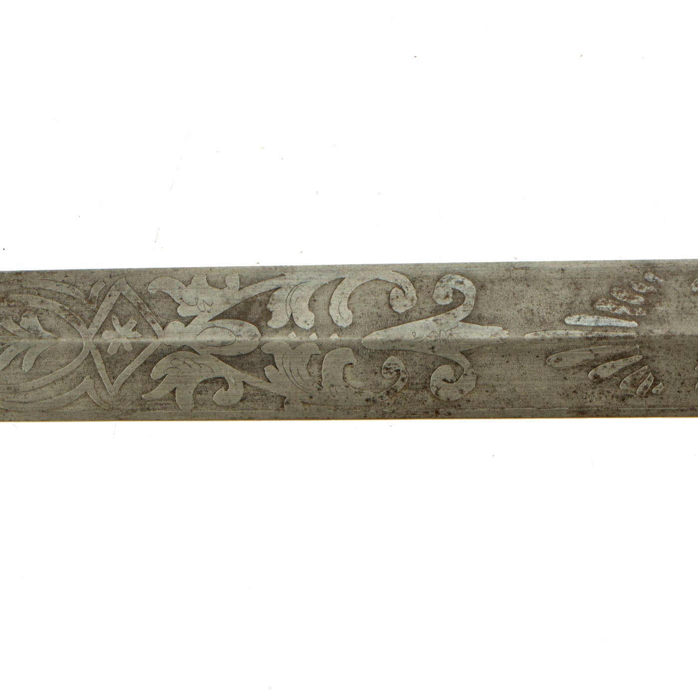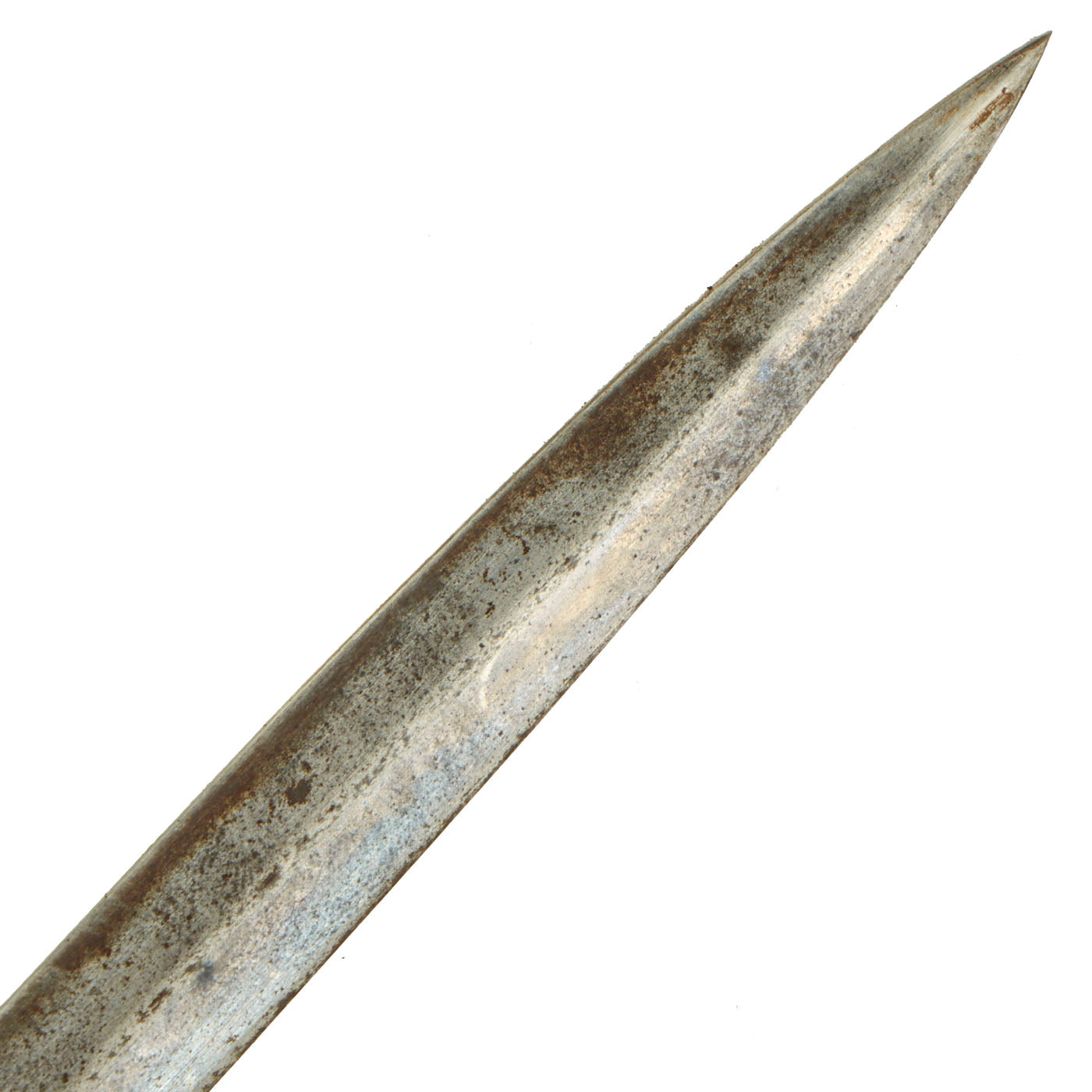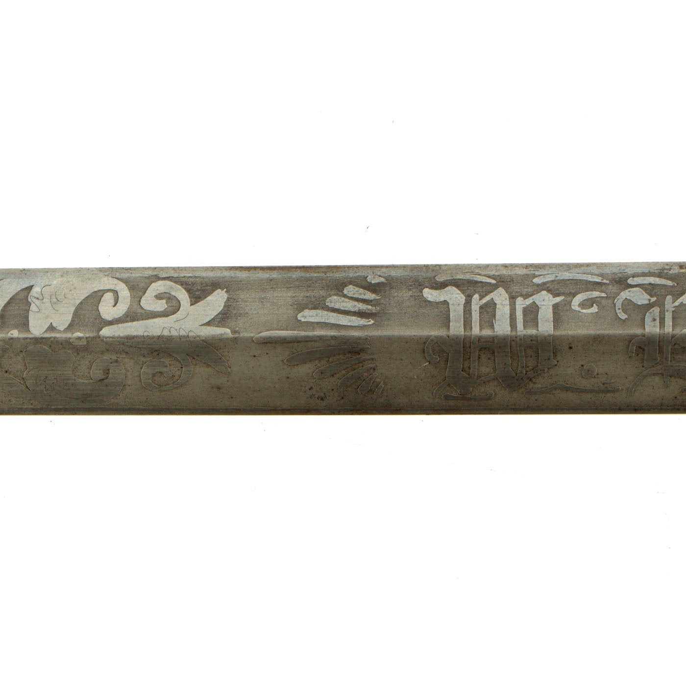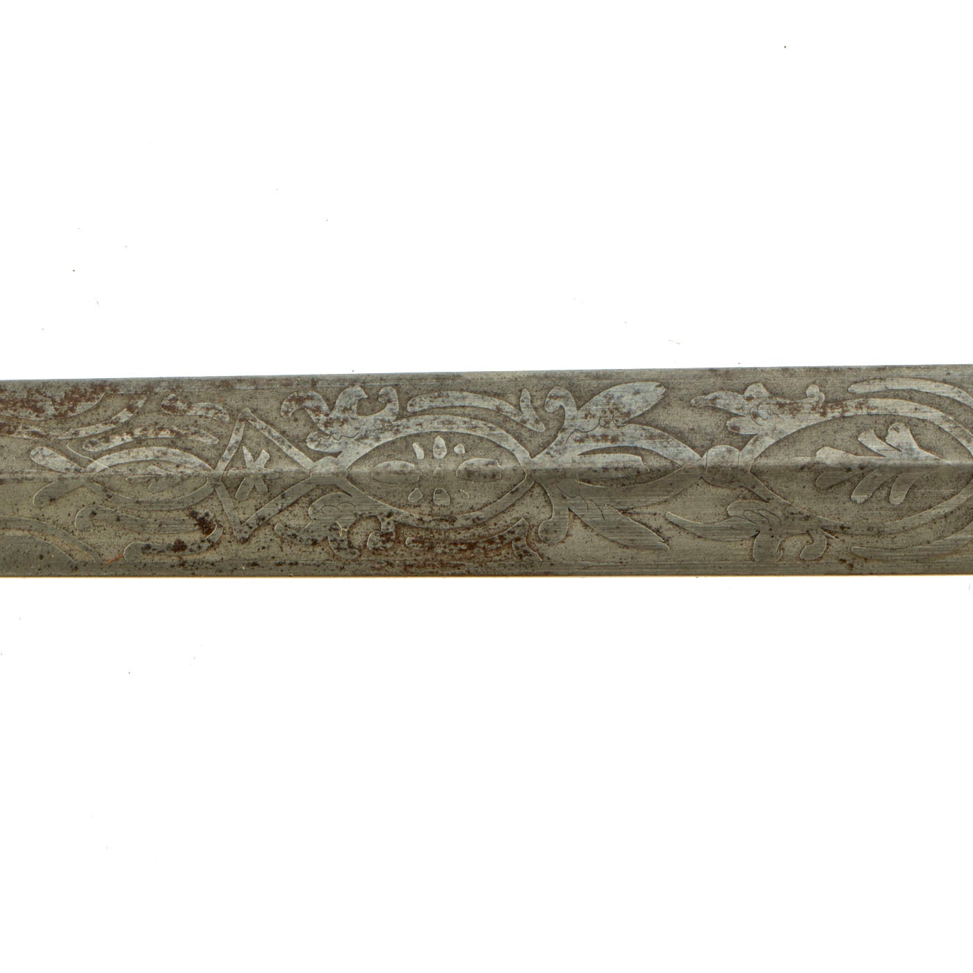 This post-war M1860 sword specimen is an edged weapon that was designed mostly for ceremonial use. The straight, double-edged steel blade measures 31” long and features a diamond-shaped cross section. Blade is embellished on both sides with etched foliate and a military panoply of arms. On the ricasso shows the maker J. H. / Mc / KENNEY / & Co. / N. Y.. Blade is semi-bright with scattered age discoloration spots.