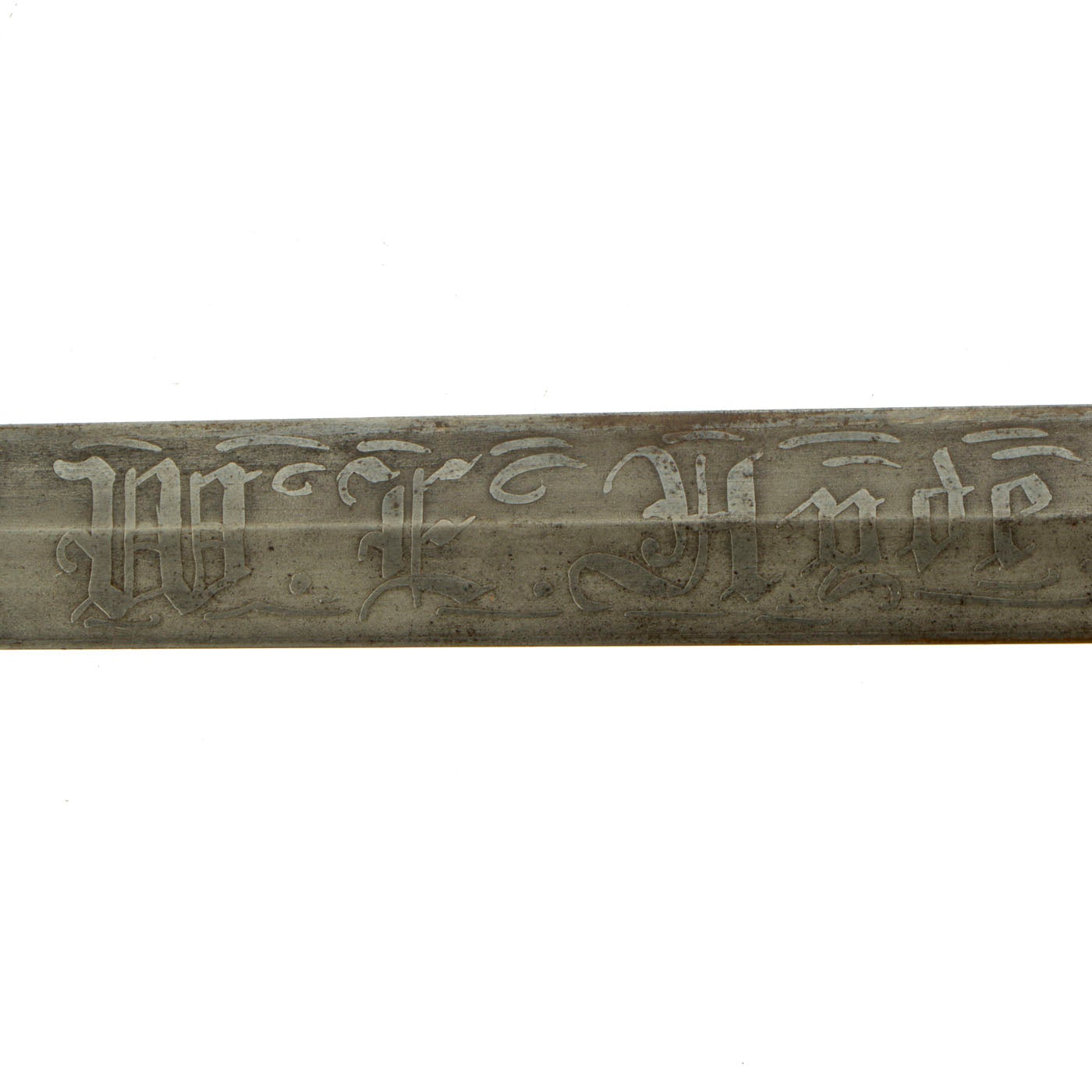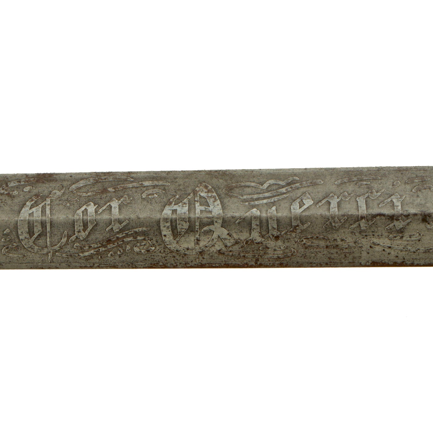 Floral engraved motifs are present on both sides of the blade. On the right side of the blade is an etched name W. E. Hyde and on the left is Cor Querri. We have not conducted any research on these names, but one could possibly find more on him if one wished to do so.