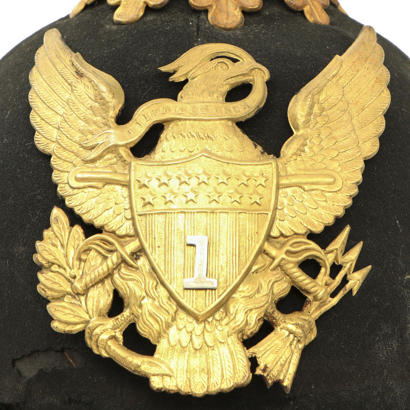 The Helmet plate displays the Great Seal of the United States, with the American Eagle with a banner in it's beak stating: E PLURIBUS UNUM. The "crossed swords" below the shield indicate that it is a for a cavalry unit, and the number 1 in the center of the "shield" is for the 1st Cavalry Regiment. From the looks of the front plate, it is not the first plate on this helmet, which is why it doesn't match the chin scale hangers.