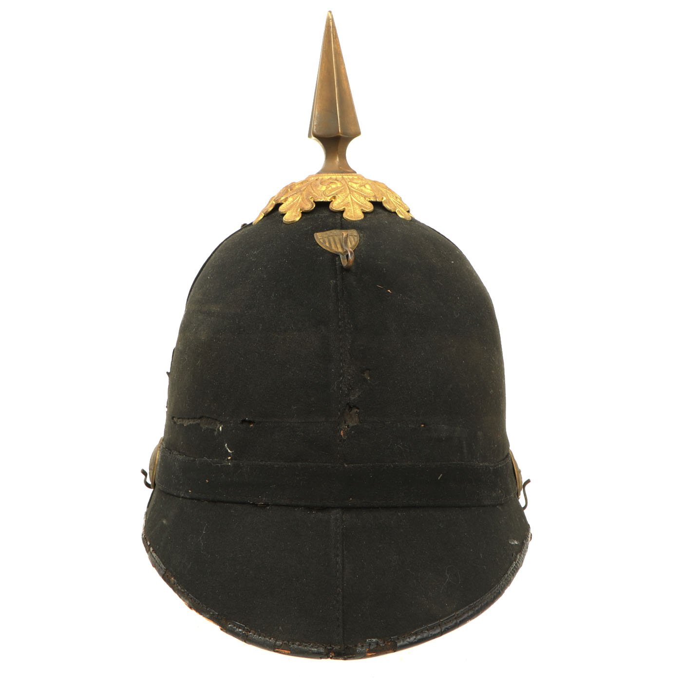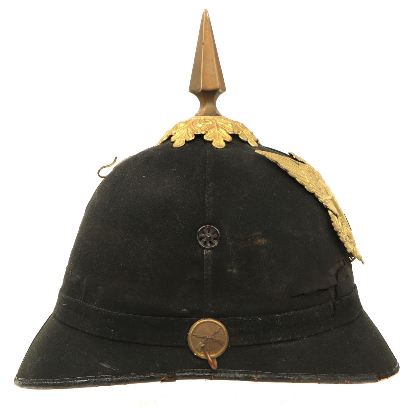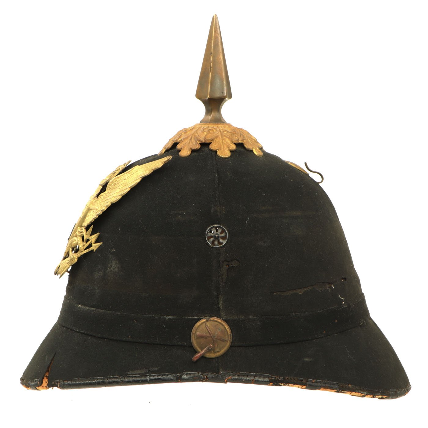 This helmet dates to the 1880s, and it really is quite striking. This is not the type of helmet that was worn in the field, but instead one intended for use with the "dress" uniform for ceremonial occasions. It beautifully made from cork covered with black fabric, with a partial makers label inside under the spike fixture. From research, we have found only one company that it could be made by:-