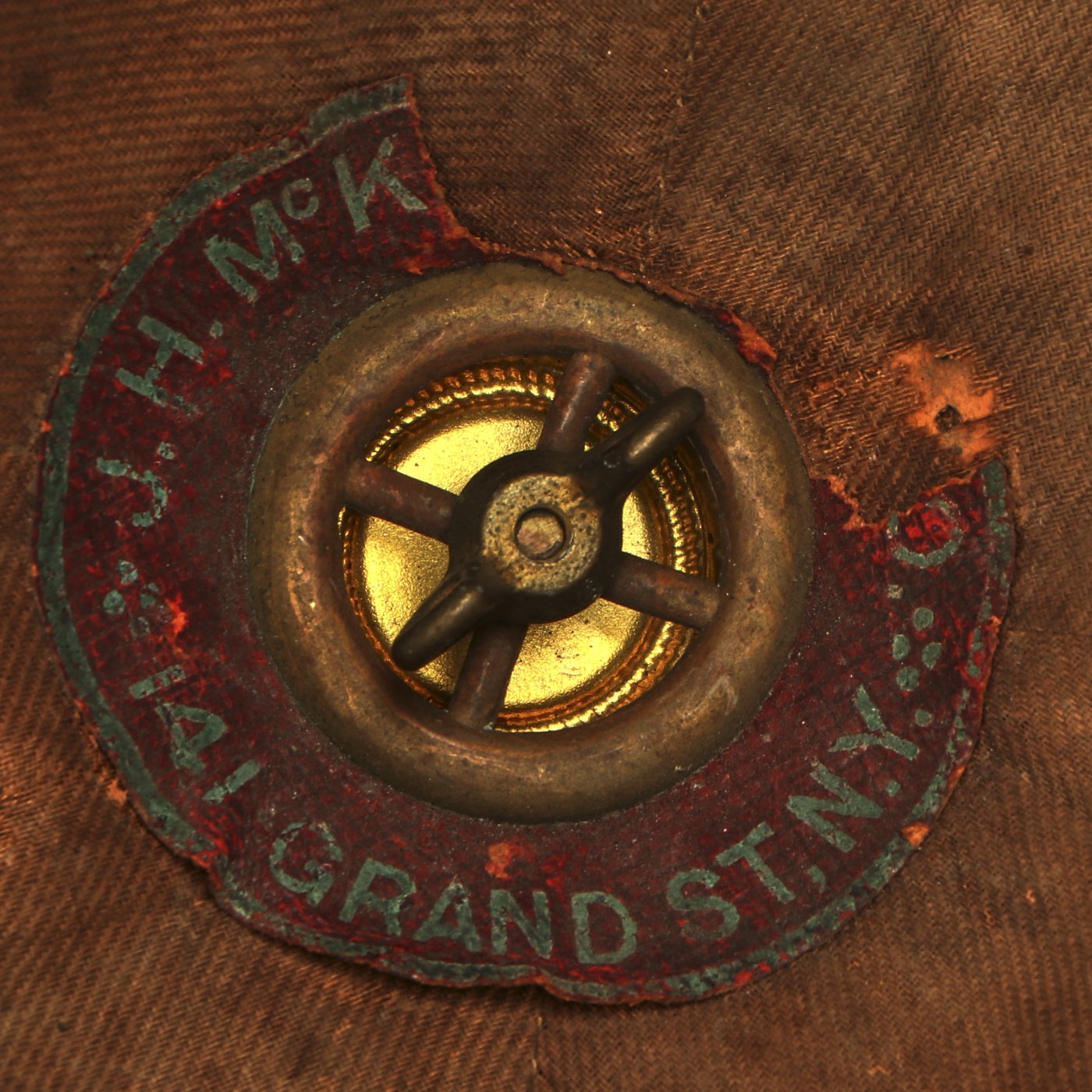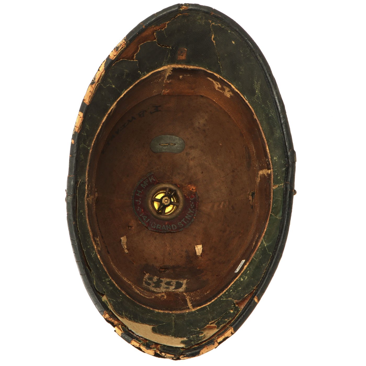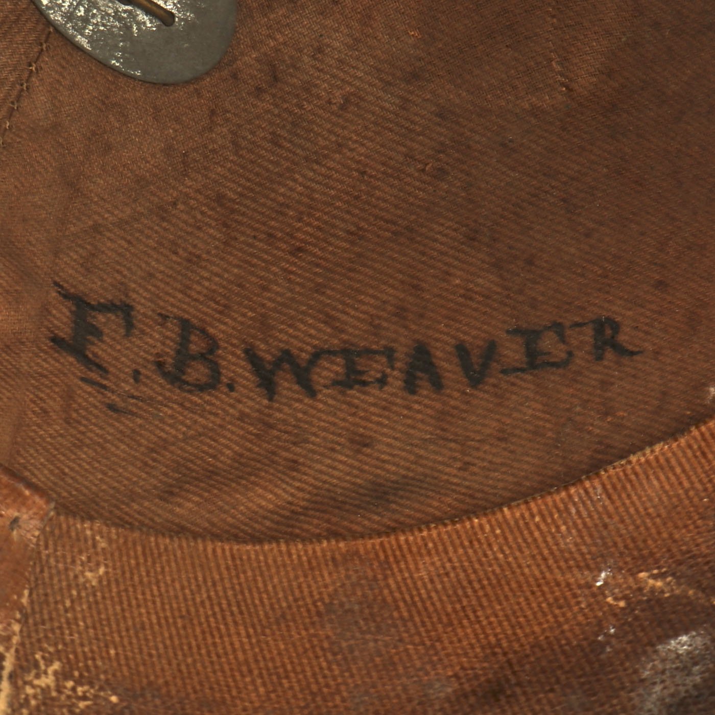 This company later became Baker & McKenney, and then Ridabock Co., so this is definitely a very early example. On the interior it is also size marked 7 with a small label on the back, and is marked with a stenciled number 38, as well as with the name F.B. WEAVER. There are a few other markings we cannot make out, but this is definitely a helmet with a great history, and some wonderful research potential!