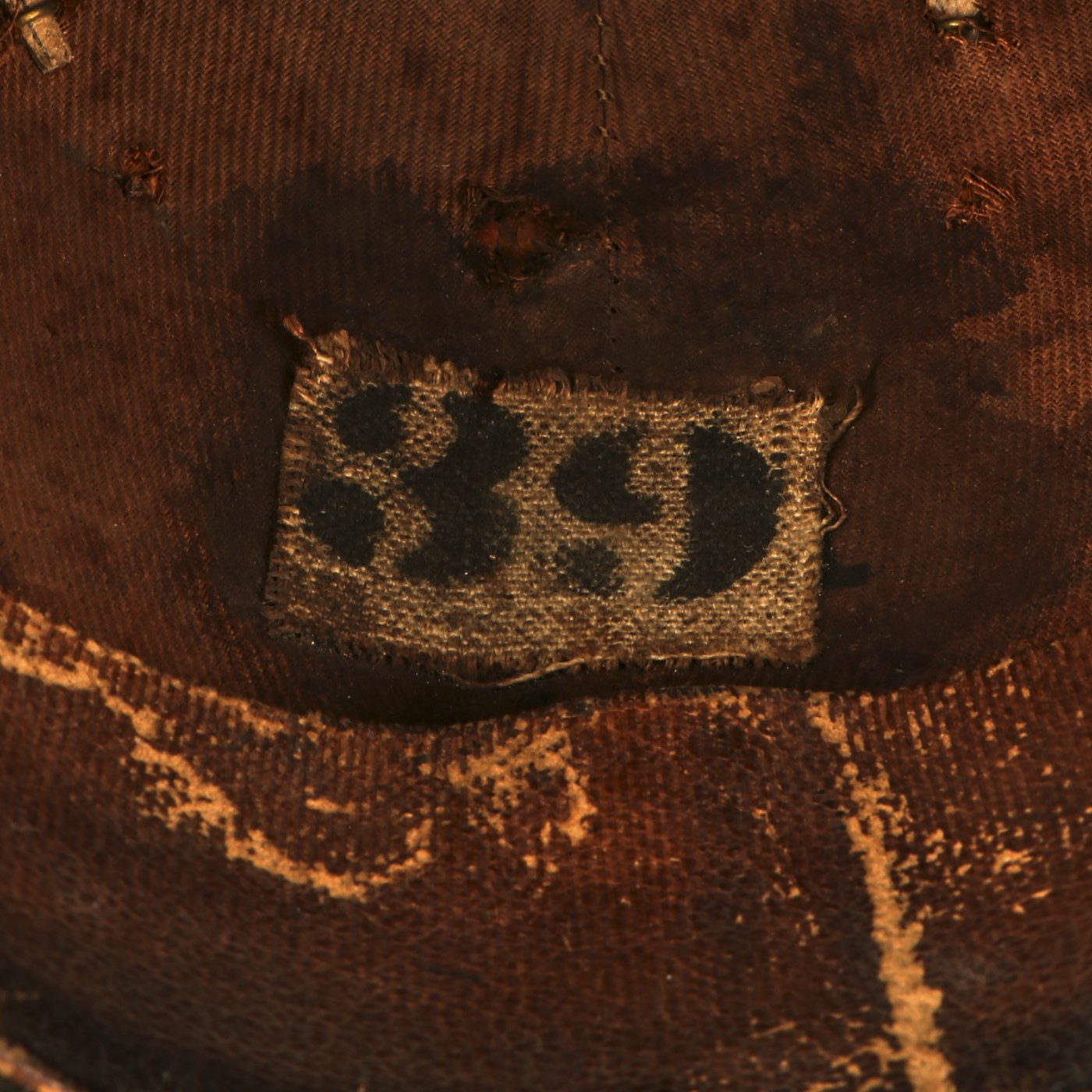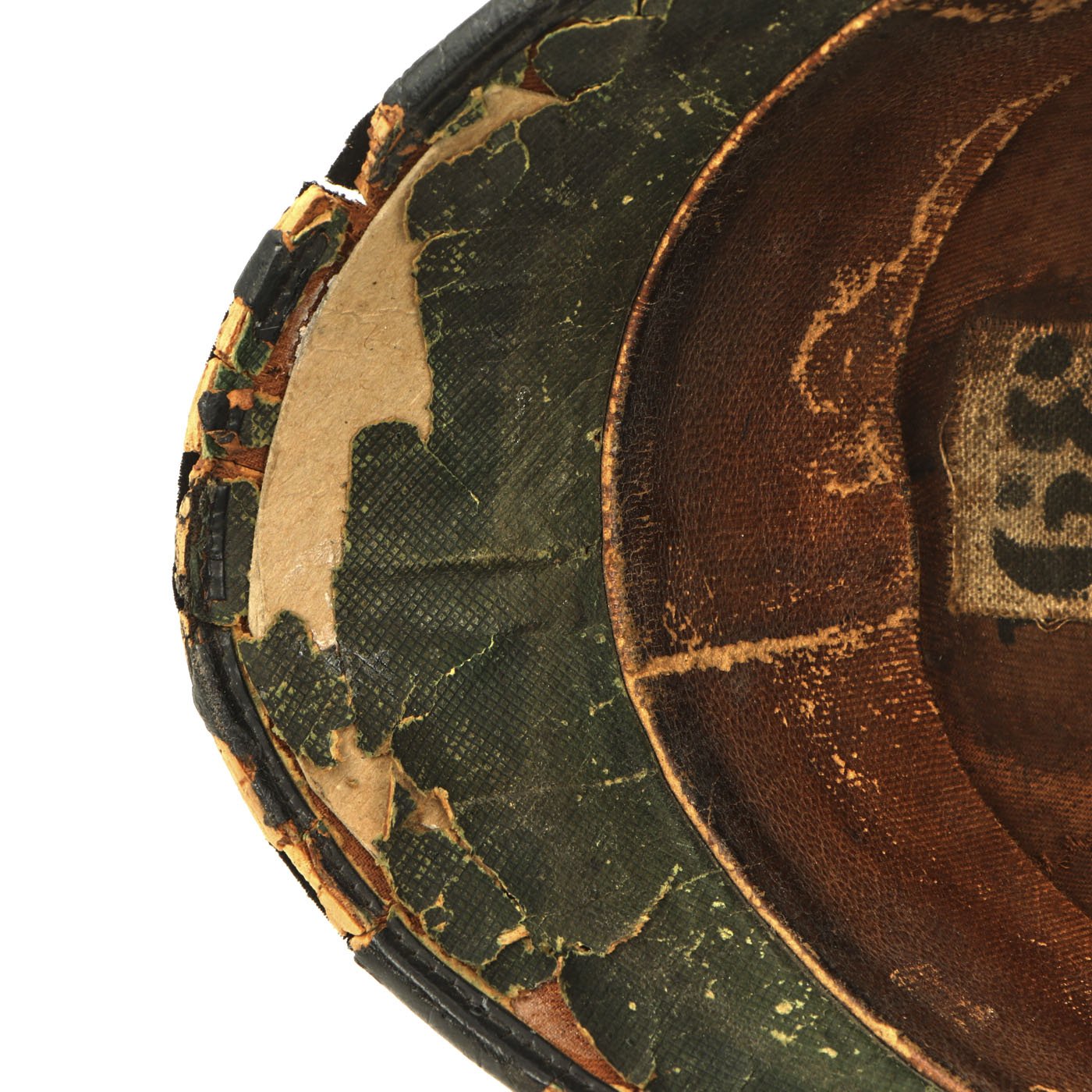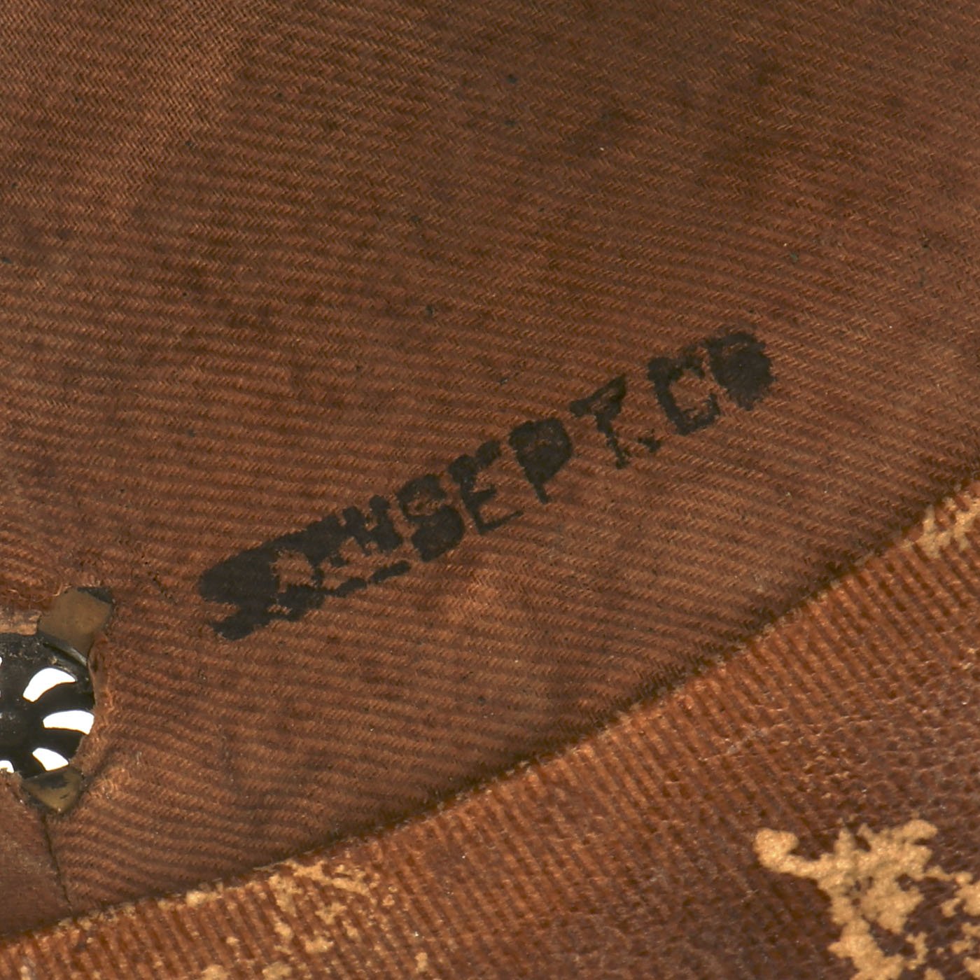 The brass ring chin scales are unfortunately completely missing, and the interior liner is somewhat worn, with a few small tears. However it still retains the infantry "crossed rifles" chin scale hangers on the sides, as well as the "Shield" hanger on the rear.