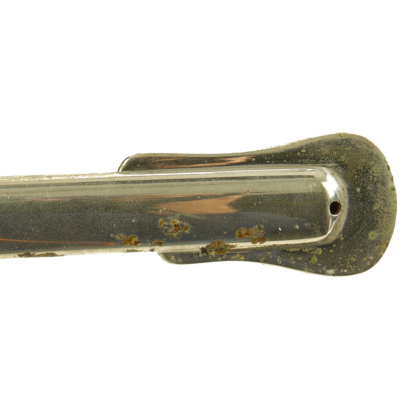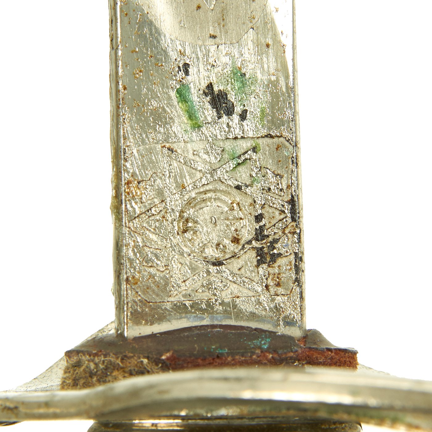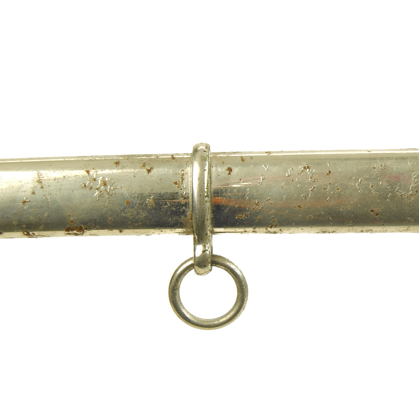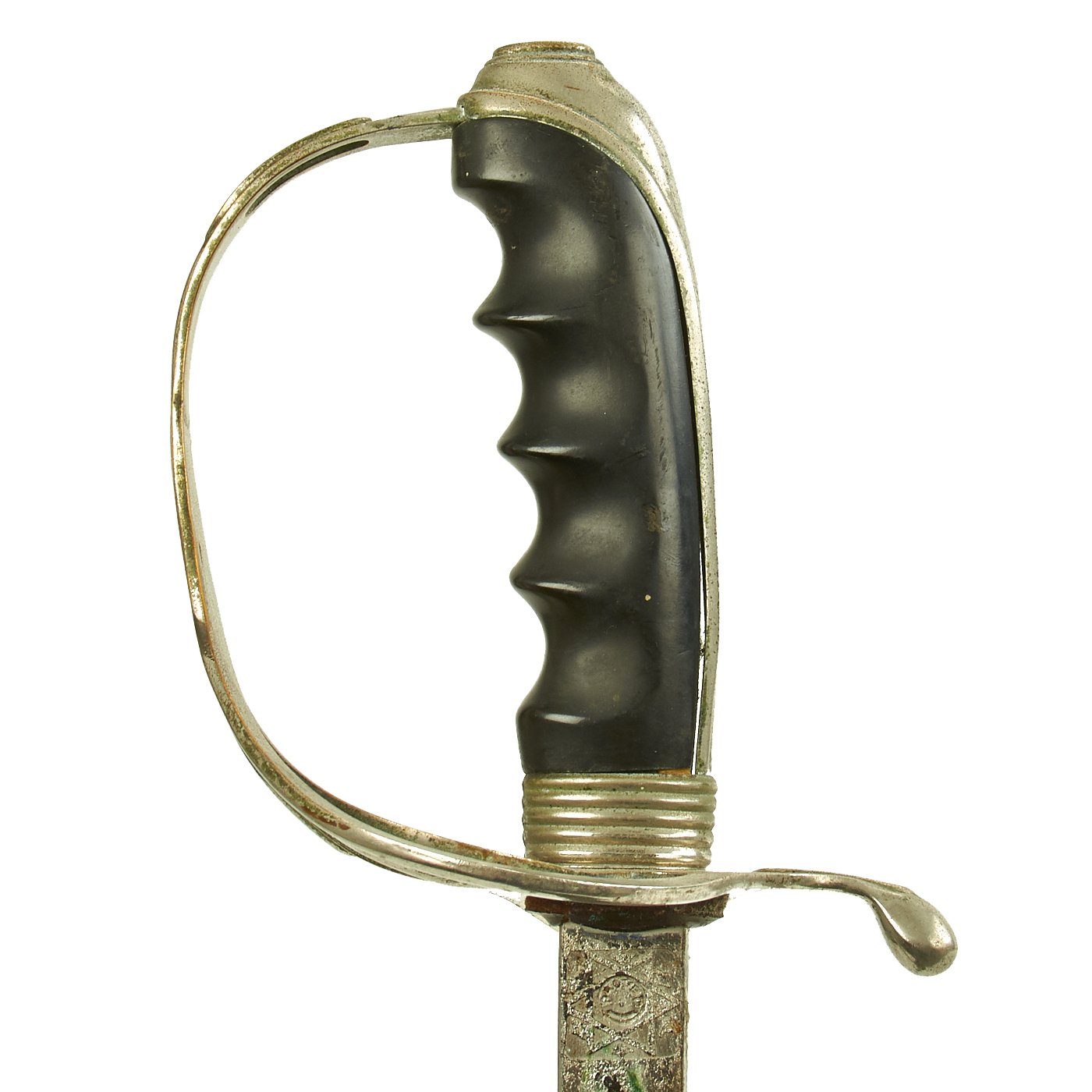There is a large panel on one side, where usually the officer's name or initials would be etched or engraved, but this example was never personalized in that fashion. Condition is very good, though there is some oxidation and wear to the nickel plate, which has started to bubble up and flake on the scabbard. There is also some wear through on the hilt, which is tight on the tang, with no wobble. The leather blade buffer is still present.