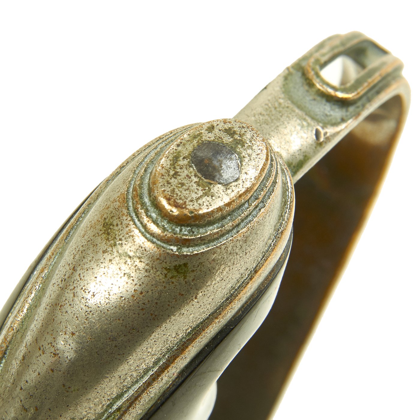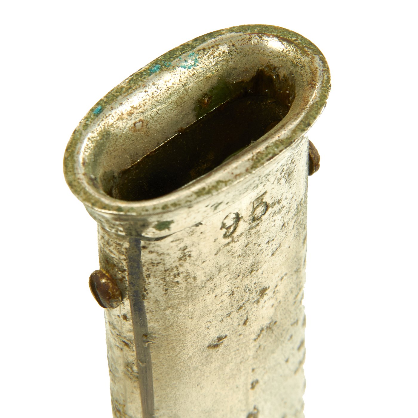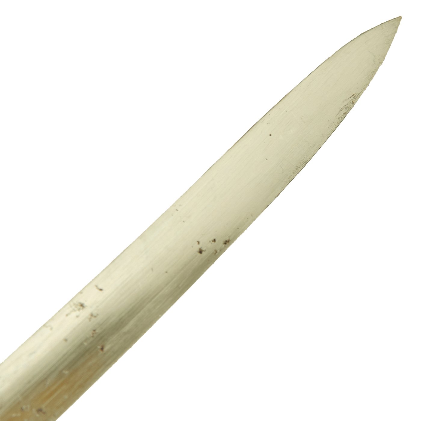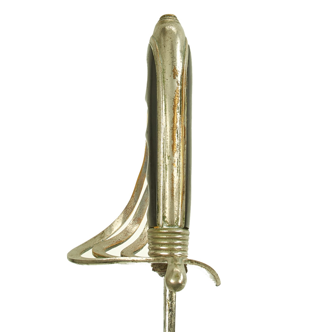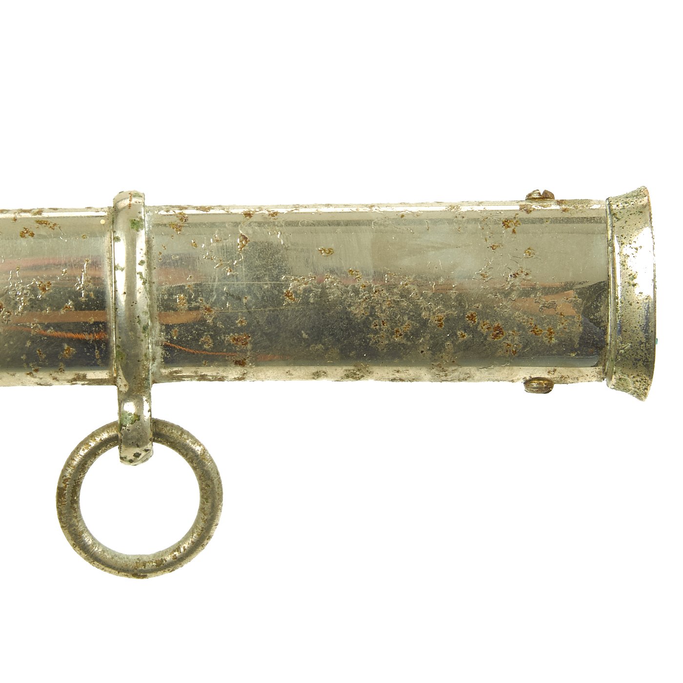 There is a large panel on one side, where usually the officer's name or initials would be etched or engraved, but this example was never personalized in that fashion. Condition is very good, though there is some oxidation and wear to the nickel plate, which has started to bubble up and flake on the scabbard. There is also some wear through on the hilt, which is tight on the tang, with no wobble. The leather blade buffer is still present.