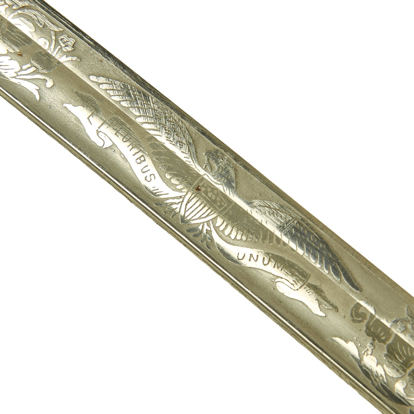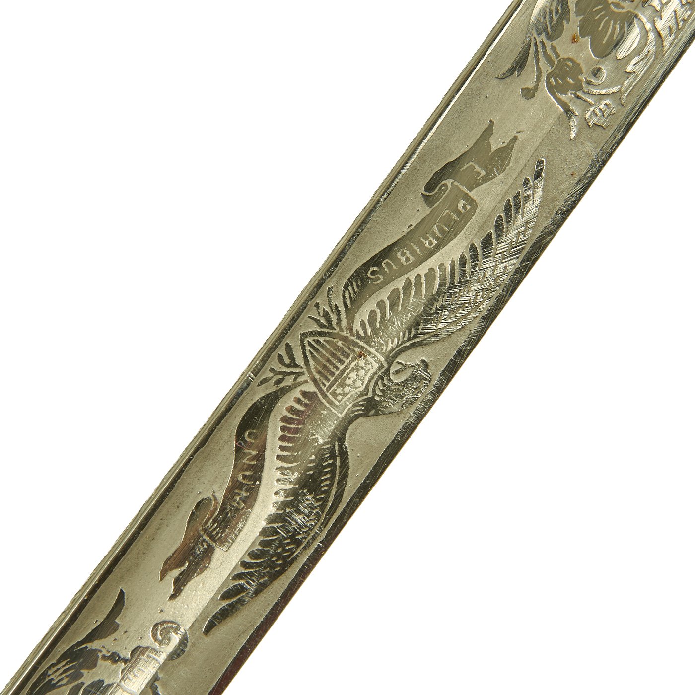 This fine example looks to be from the mid 20th century, possibly WWII era, and is in very nice condition. As with most, it is fully nickel plated, with a triple-etched slightly curved blade, and a nickel plated steel scabbard. The etching on the blade shows the standard heraldry of the U.S. Army with U.S. and E PLURIBUS UNUM, and various stands of arms.