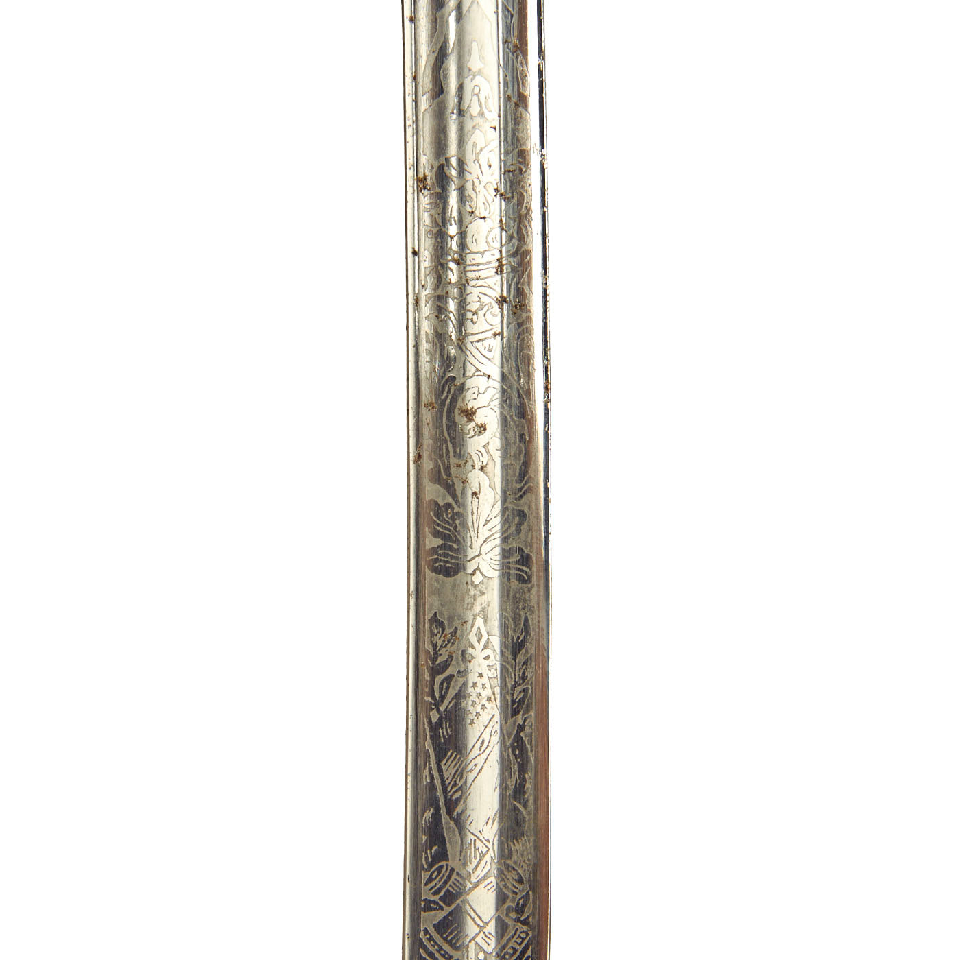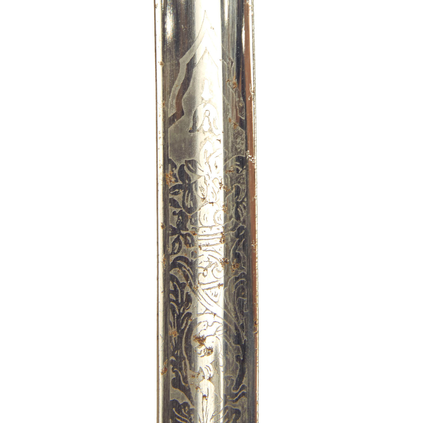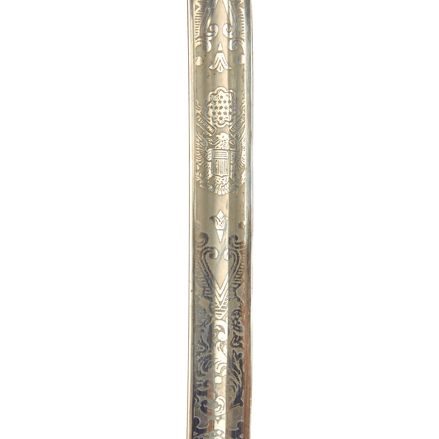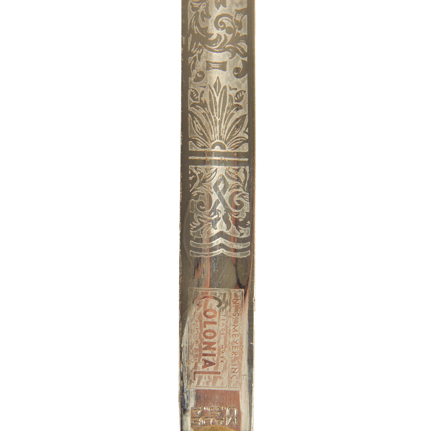 This fine example looks to be from the mid 20th century, possibly WWII era, and is in very nice condition. As with most, it is fully nickel plated, with a triple-etched slightly curved blade, and a nickel plated steel scabbard. The etching on the blade shows the standard heraldry of the U.S. Army with U.S. and E PLURIBUS UNUM, and various stands of arms.