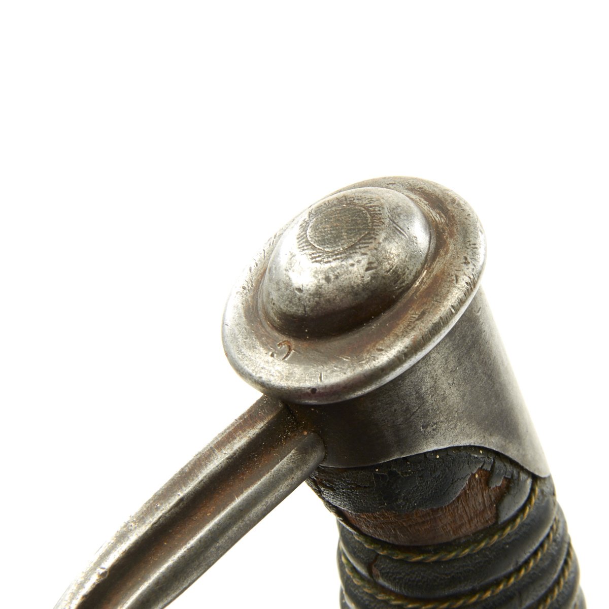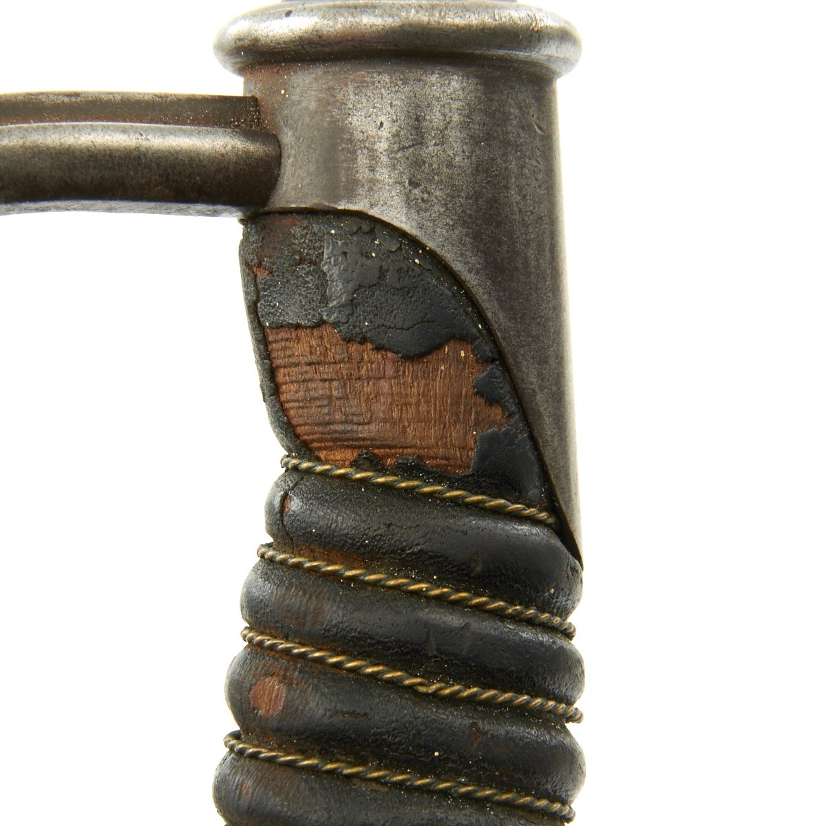 The scabbard is in very good shape, with a few small dents we can see, and a wonderful worn patina. The leather grip is in good shape, with some cracking, and still has the original wire wrapping, thought it is a bit loose. Some of the leather has flaked off near the bottom of the grip, but it does not detract much overall from the piece.