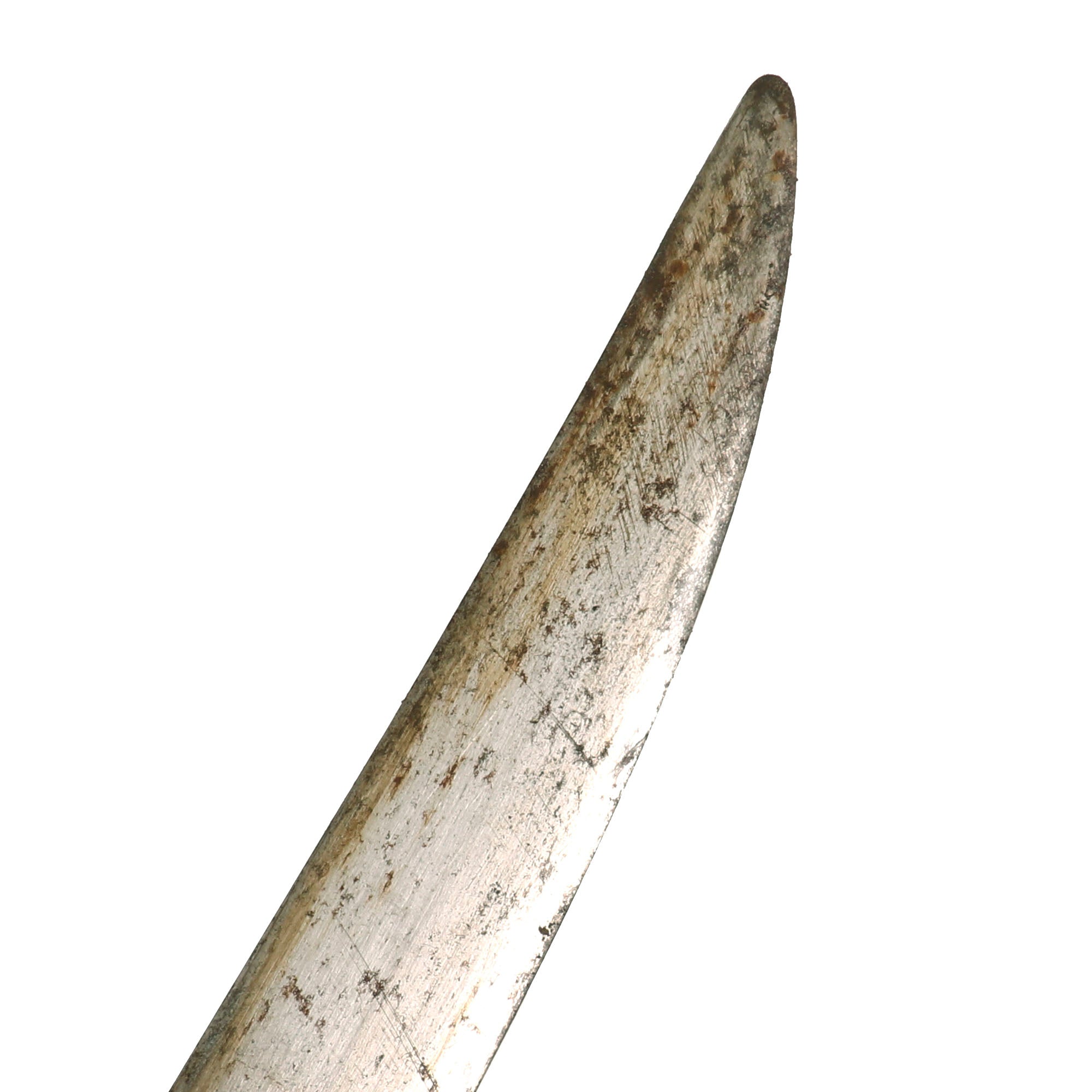 The blade on this example is in good condition, with a nice patina, and there are no real dents or nicks in the edge. These blades were seldom used in actual combat, and were almost ceremonial, even right after they were approved. There are some areas of staining with some light rust on the blade. The hilt has a nice dull steel patina, unfortunately covered with areas of rust peppering. The leather grip is in good shape, with some cracking, and still has the original wire wrapping. Some of the leather has flaked off of the grip, but it does not detract much overall from the piece.