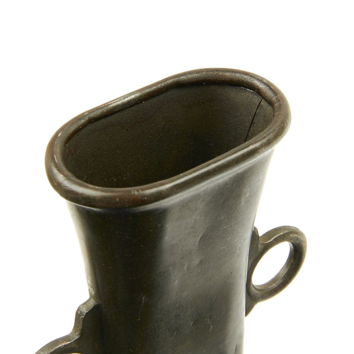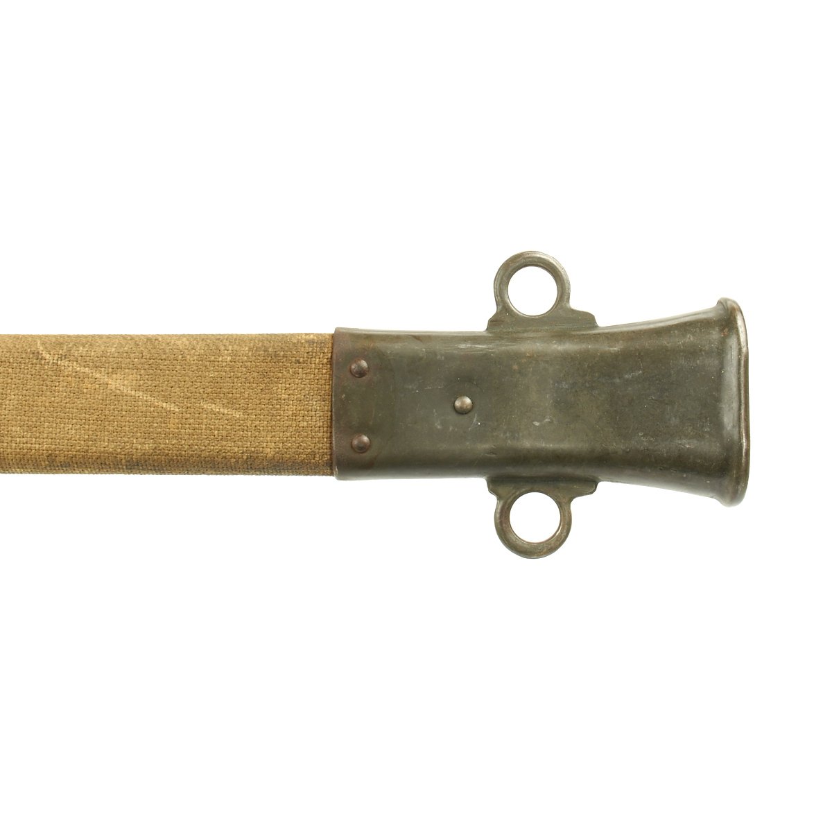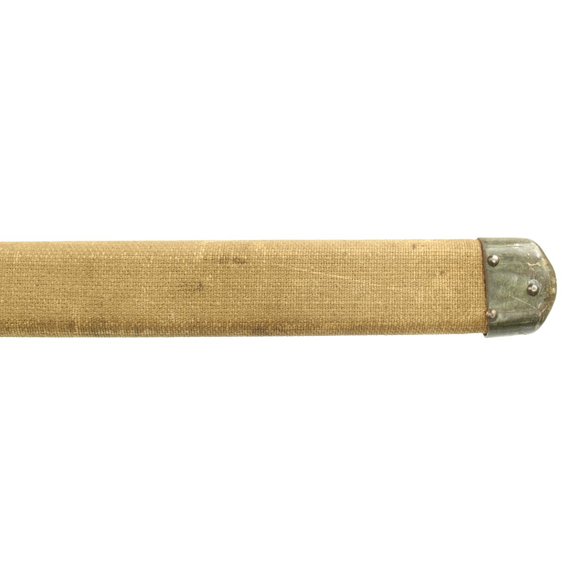 The scabbard has a wooden body covered in khaki canvas with a large wide steel throat and a plain drag both of which are darkened like the grip. Canvas covering is in excellent condition. One area is about 6.00 inches up from the drag and meas. approx. 2.00 inches long. The other is on the opposite side about 9.00 inches below the throat and measures. approx. 3.00 inches.
