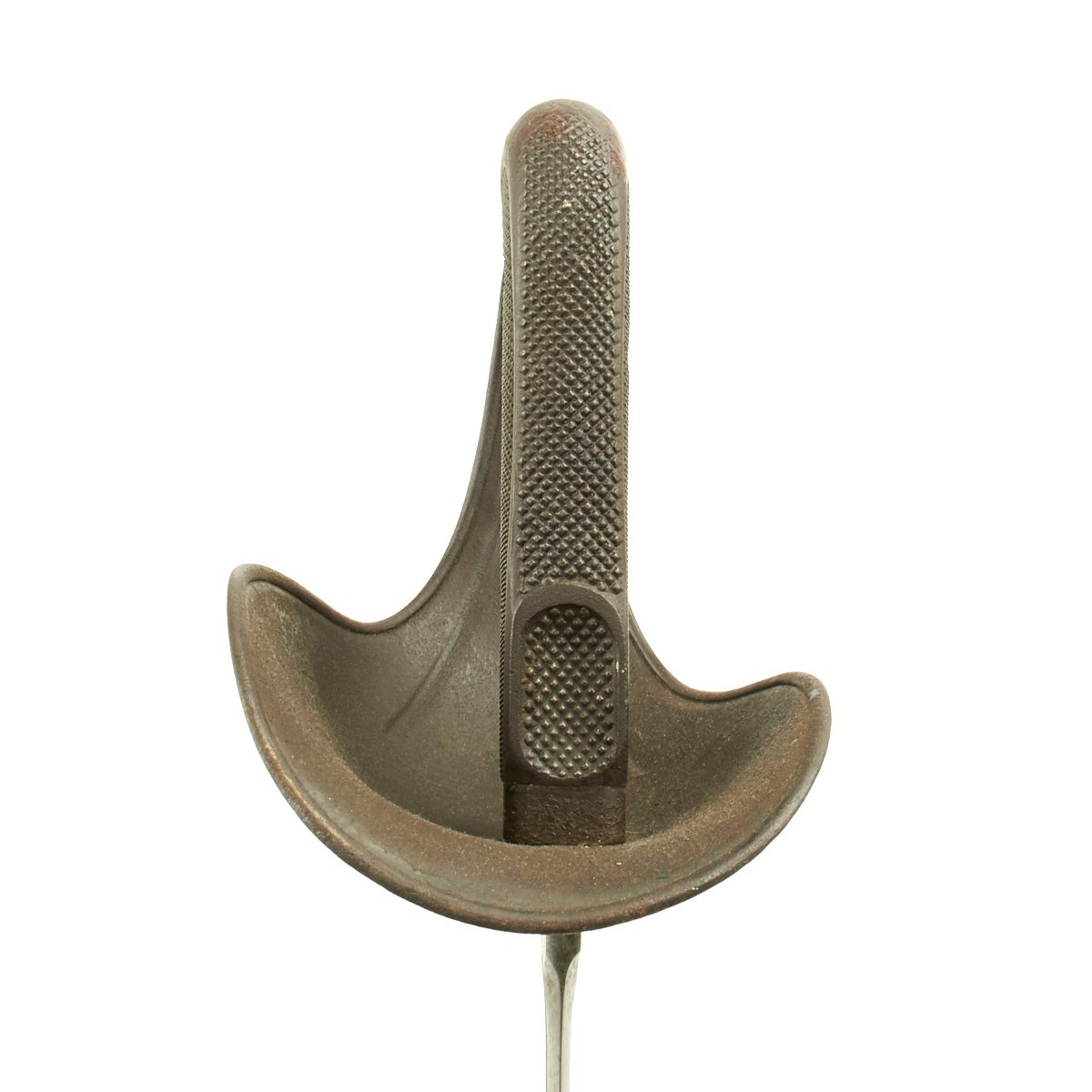 - It has a blued steel (some were nickel plated) "cup-hilt" and a black composition grip.