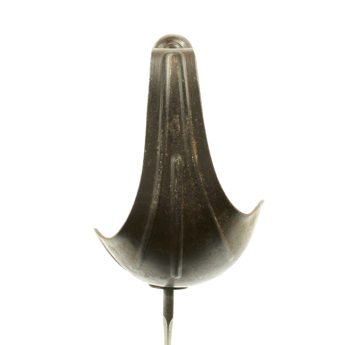 The grip is made of steel with a crosshatched surface for better grip. The top of the grip just behind the guard has a recessed area for resting the thumb. The pommel is smooth and convex. There is a screw through the pommel cap and two lateral screws holding the grip together. The guard is made of a single heavy sheet of steel molded into a full basket with three ridges in the area of the knucklebow. Both the grip and the guard are blackened. All is in excellent condition.
