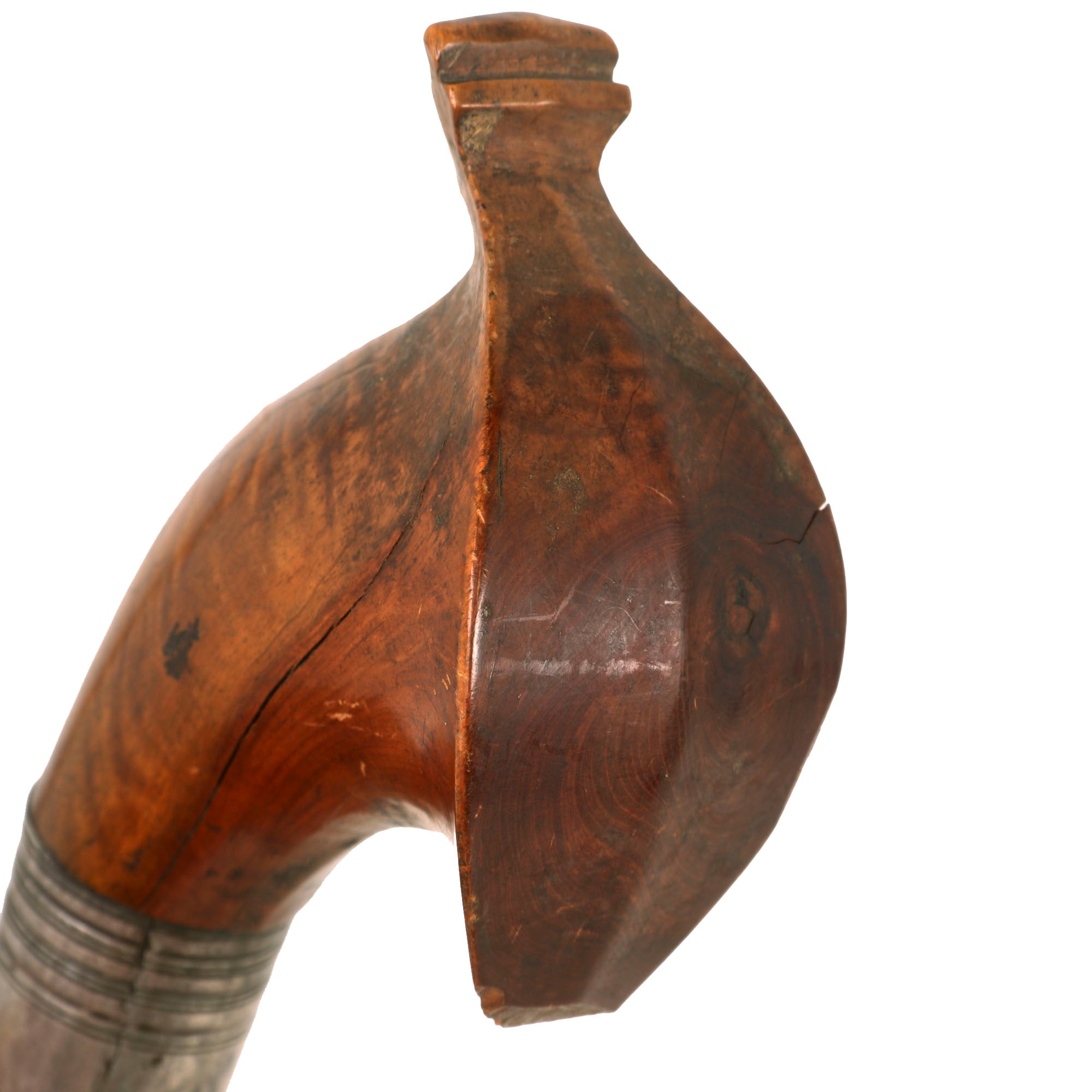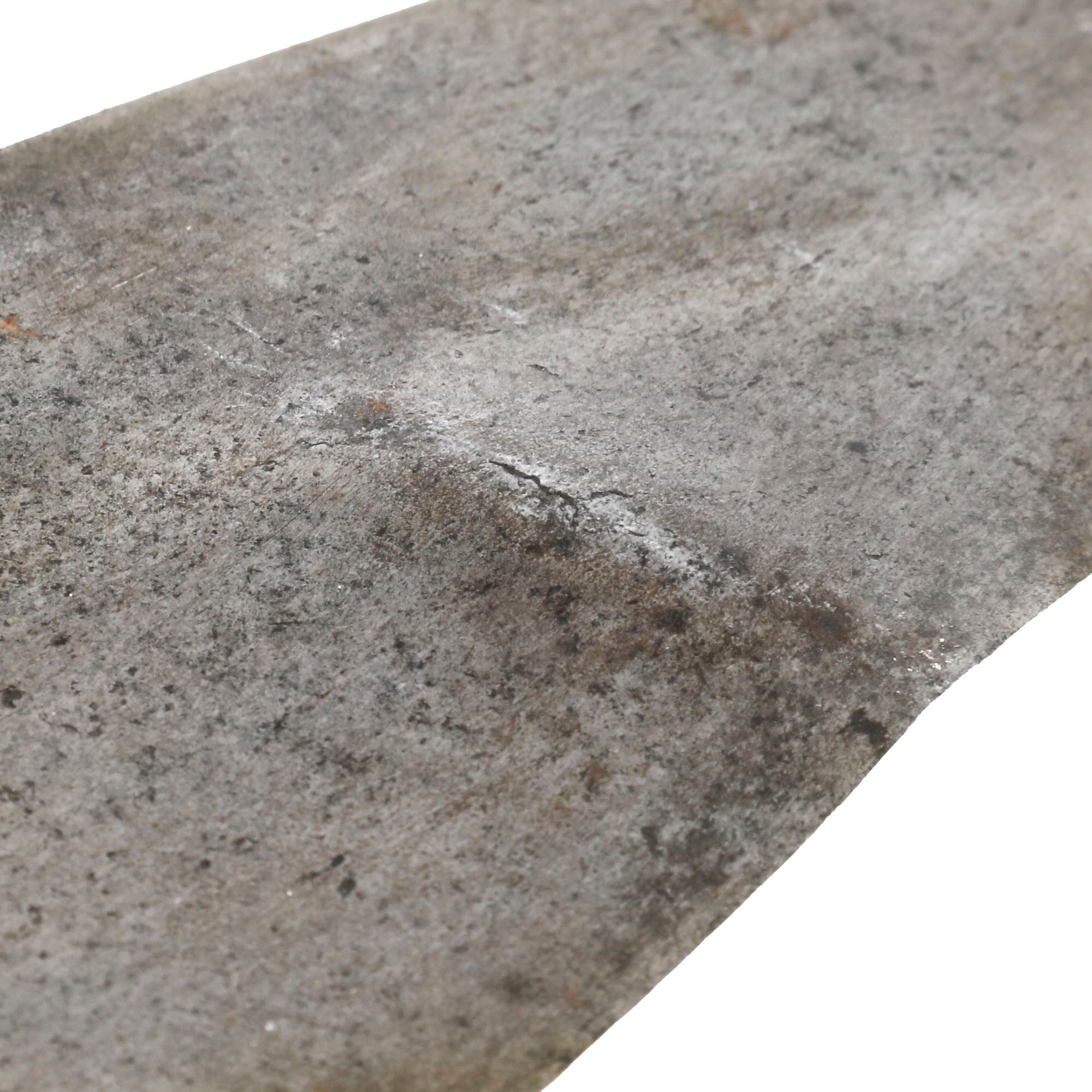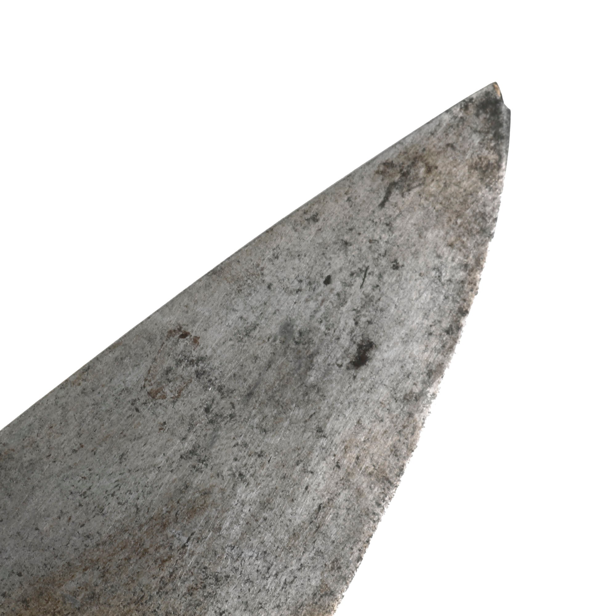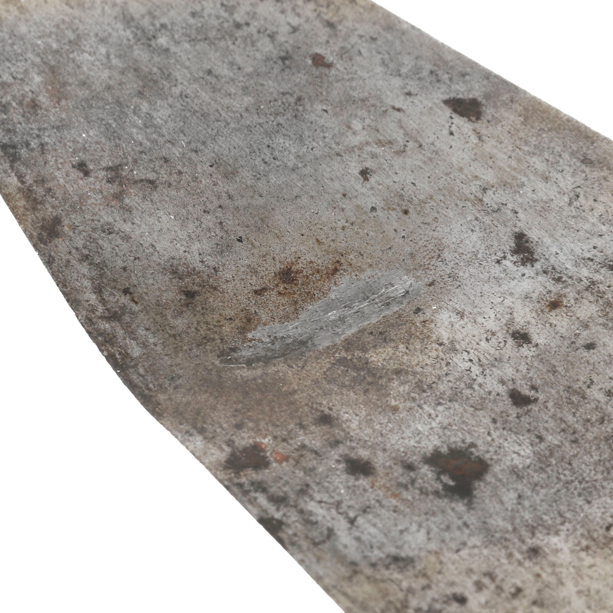 The barong measures 20⅝” in overall length with a 13¼” blade. The tip is a bit dented, and the bullet strike is very characteristic. The wooden handle is in good shape with some cracks as shown, as well as a dowel repair.