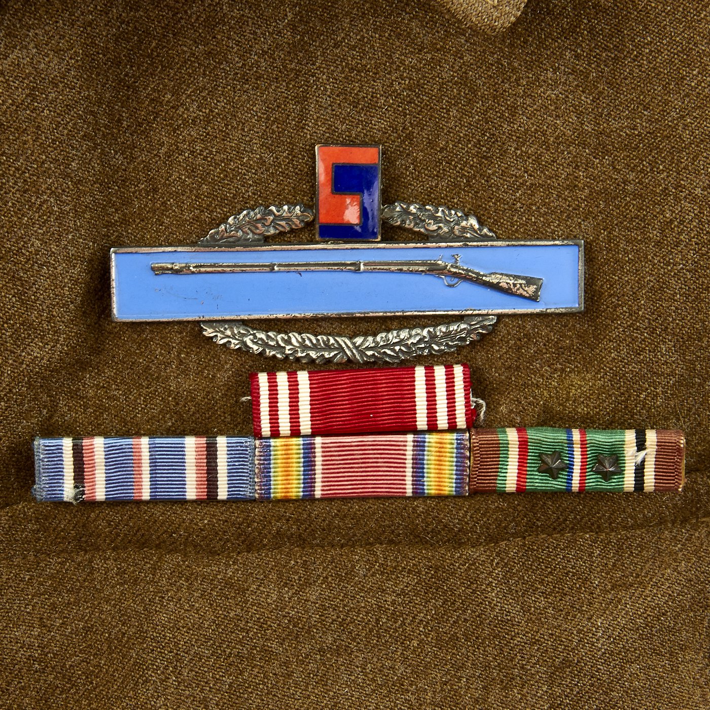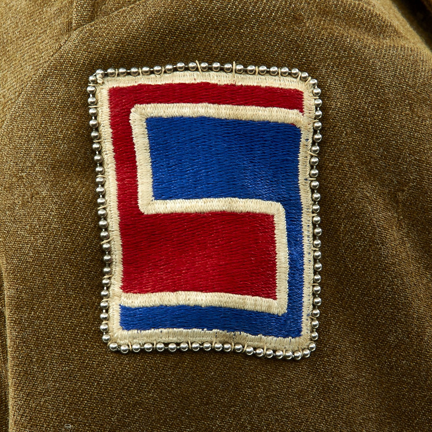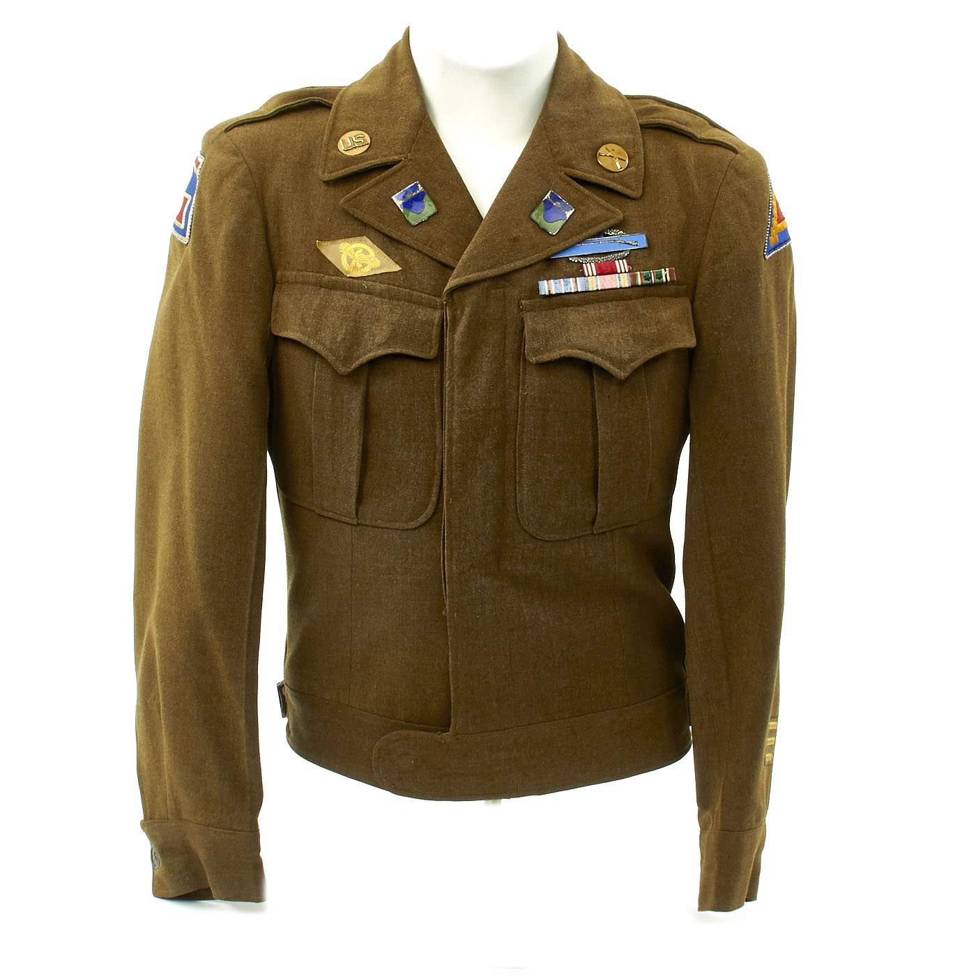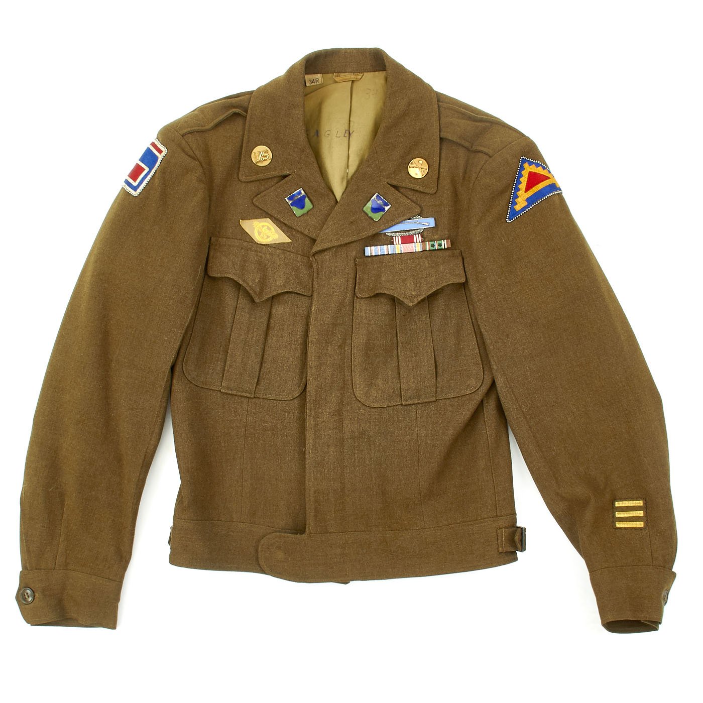 - WWII Ike jacket with dog tag chain border Seventh United States Army insignia patch to left shoulder, dog tag chain border 69th infantry division insignia patch to right shoulder, enamel distinctive unit insignia lapel pins, unique Combat Infantryman Sterling Badge with 69th ID enamel insignia to center. Medal ribbons: Army Good Conduct Medal, American Campaign Medal, World War Two Victory Medal, European-Africa-Middle Eastern Campaign Medal with two campaign stars. Ruptured duck patch and 3 overseas service bars on left shelve for 18+ months served overseas. Jacket is size 34R and named YEAGLEY in ink cross the interior lining by the neck.