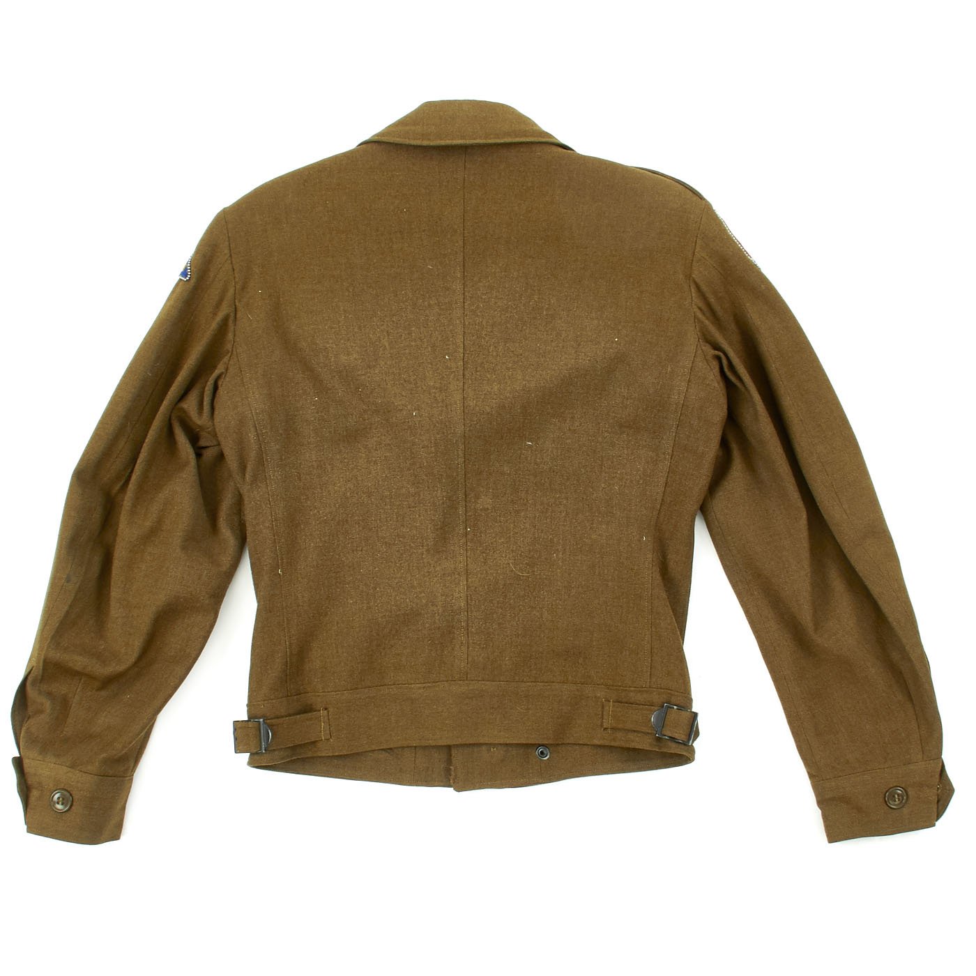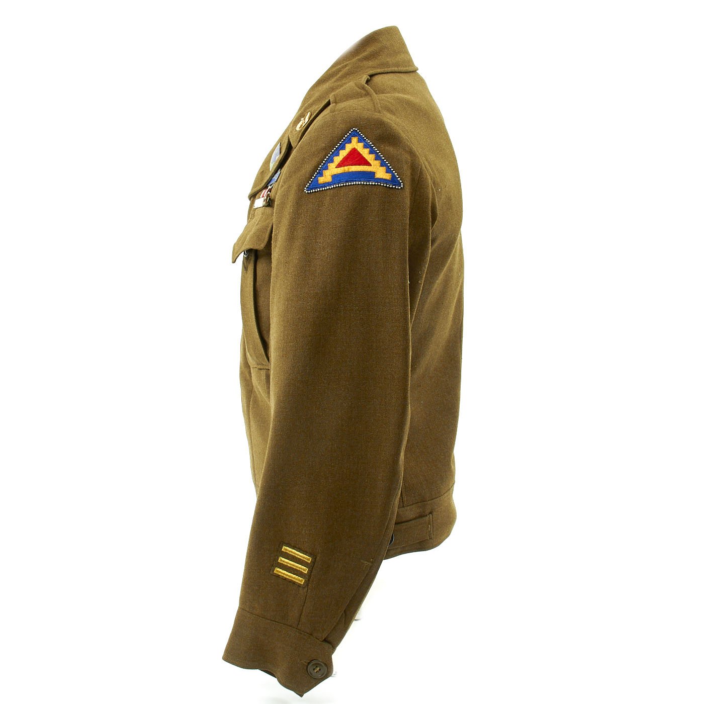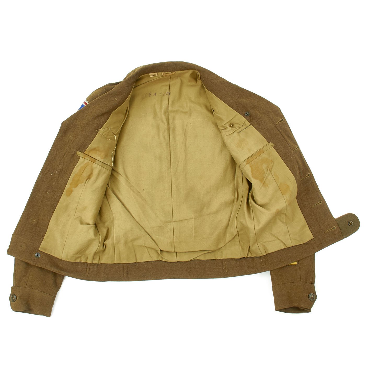 - WWII Ike jacket with dog tag chain border Seventh United States Army insignia patch to left shoulder, dog tag chain border 69th infantry division insignia patch to right shoulder, enamel distinctive unit insignia lapel pins, unique Combat Infantryman Sterling Badge with 69th ID enamel insignia to center. Medal ribbons: Army Good Conduct Medal, American Campaign Medal, World War Two Victory Medal, European-Africa-Middle Eastern Campaign Medal with two campaign stars. Ruptured duck patch and 3 overseas service bars on left shelve for 18+ months served overseas. Jacket is size 34R and named YEAGLEY in ink cross the interior lining by the neck.