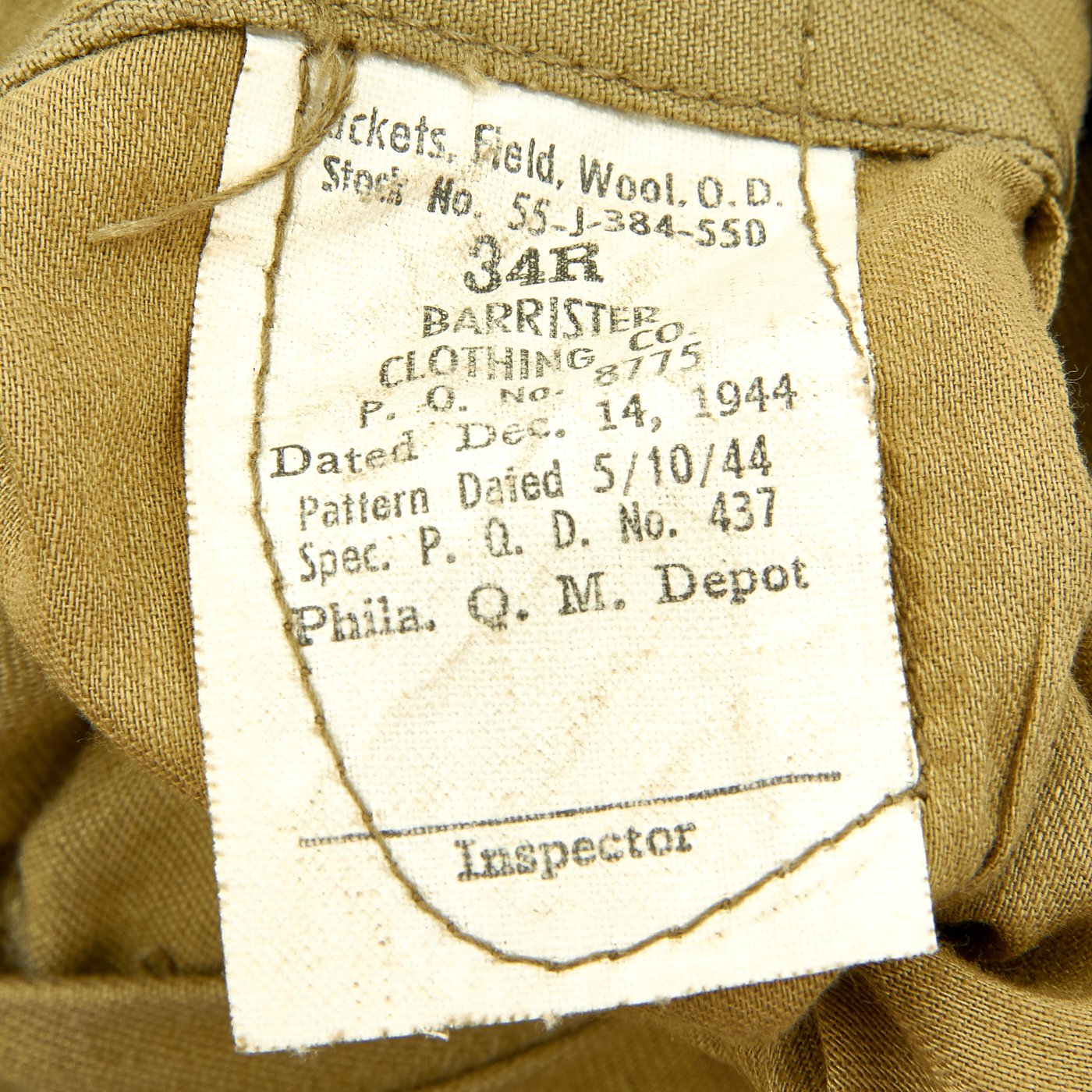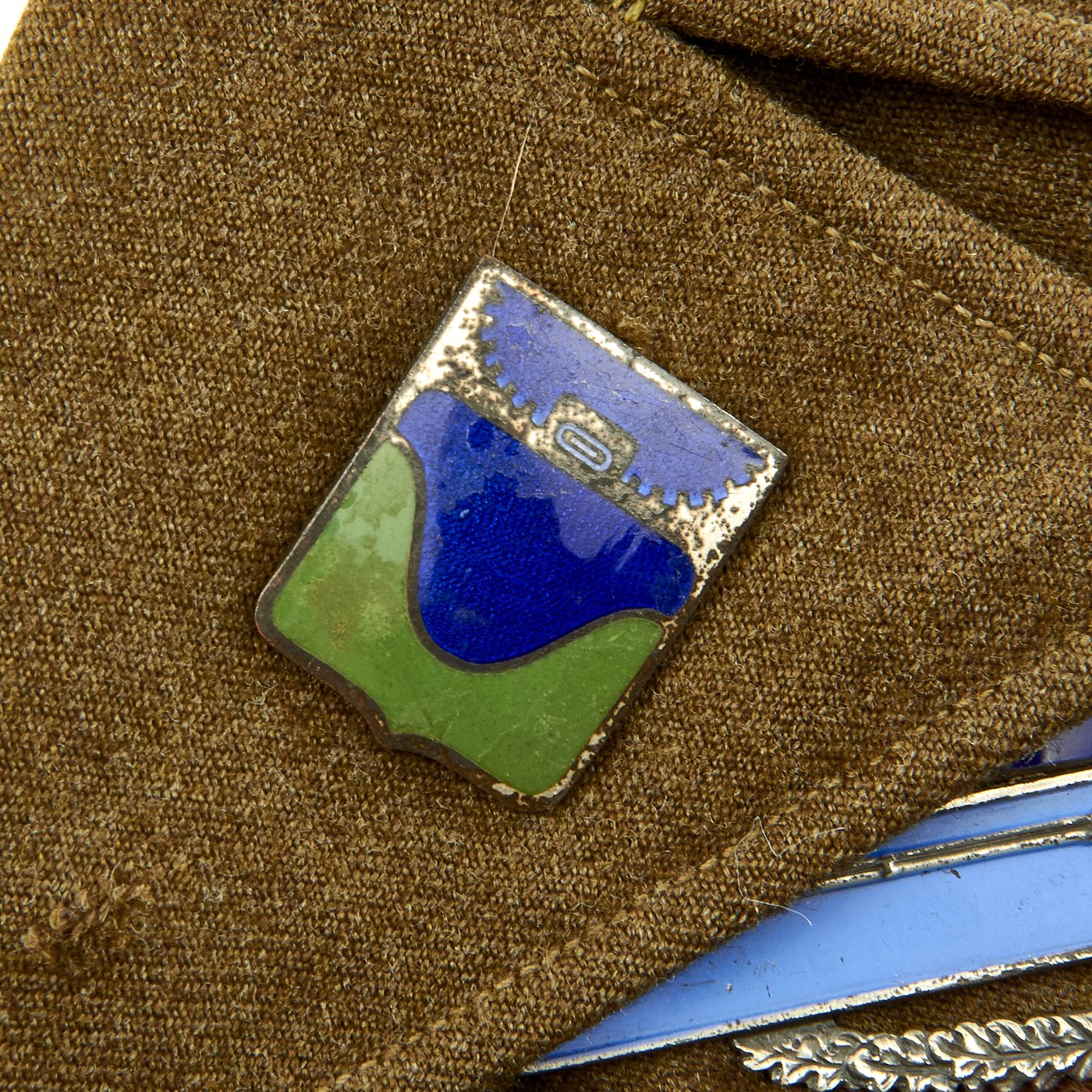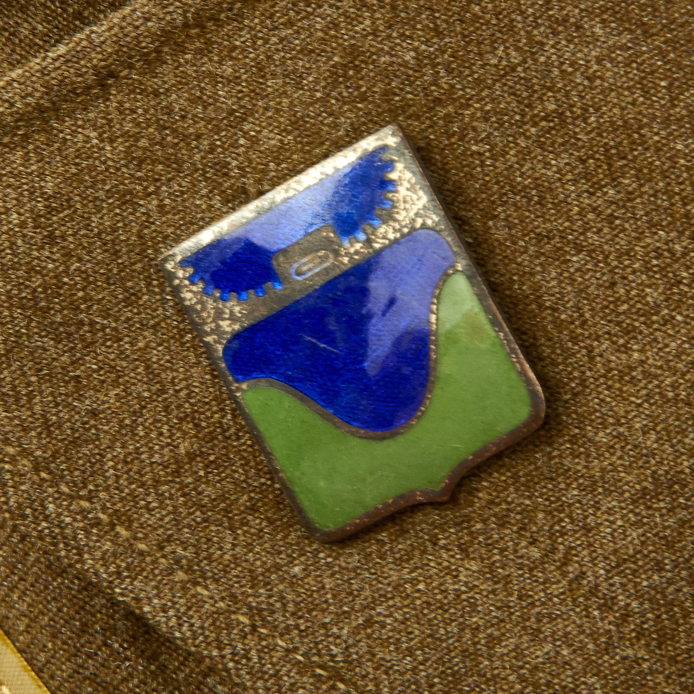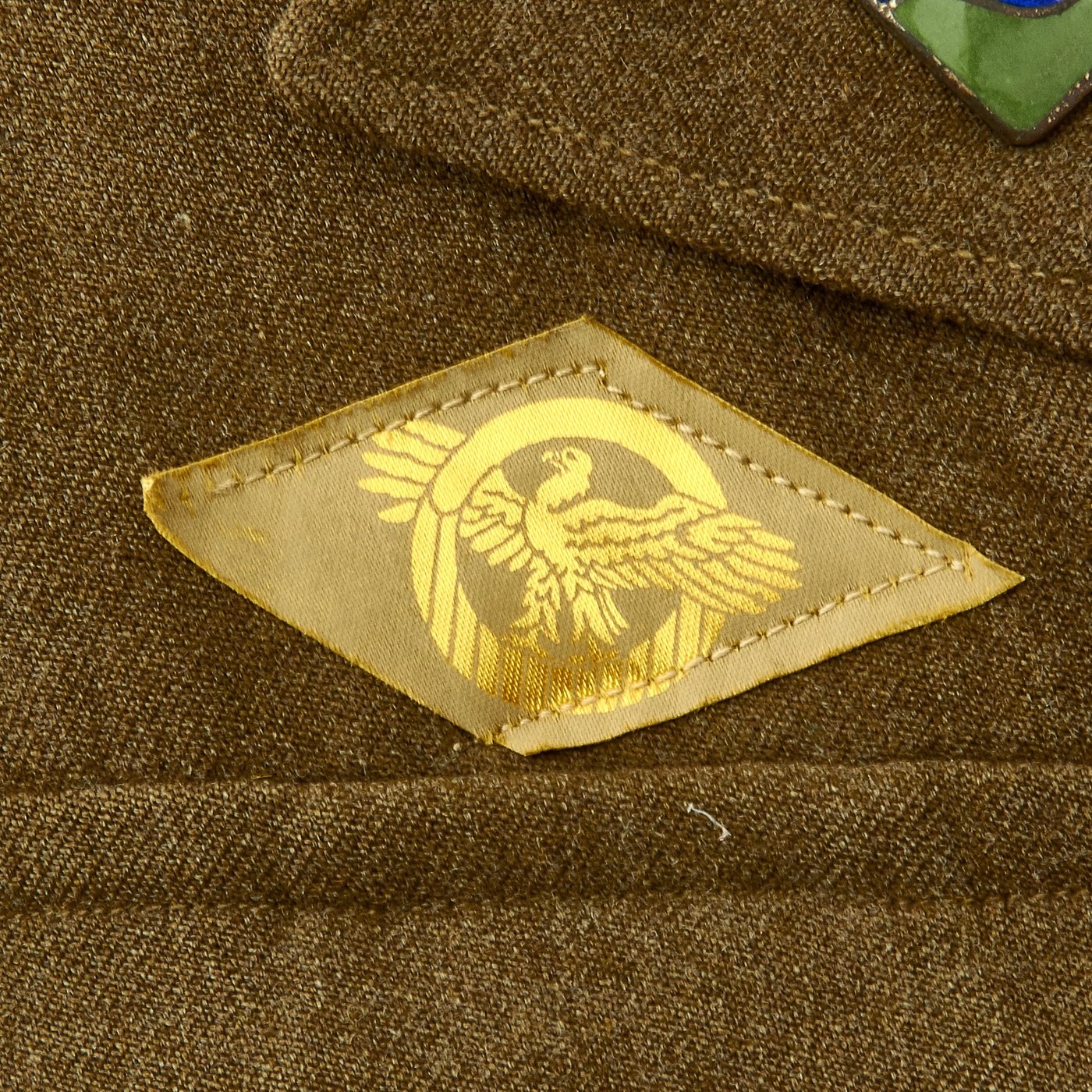 - WWII Ike jacket with dog tag chain border Seventh United States Army insignia patch to left shoulder, dog tag chain border 69th infantry division insignia patch to right shoulder, enamel distinctive unit insignia lapel pins, unique Combat Infantryman Sterling Badge with 69th ID enamel insignia to center. Medal ribbons: Army Good Conduct Medal, American Campaign Medal, World War Two Victory Medal, European-Africa-Middle Eastern Campaign Medal with two campaign stars. Ruptured duck patch and 3 overseas service bars on left shelve for 18+ months served overseas. Jacket is size 34R and named YEAGLEY in ink cross the interior lining by the neck.