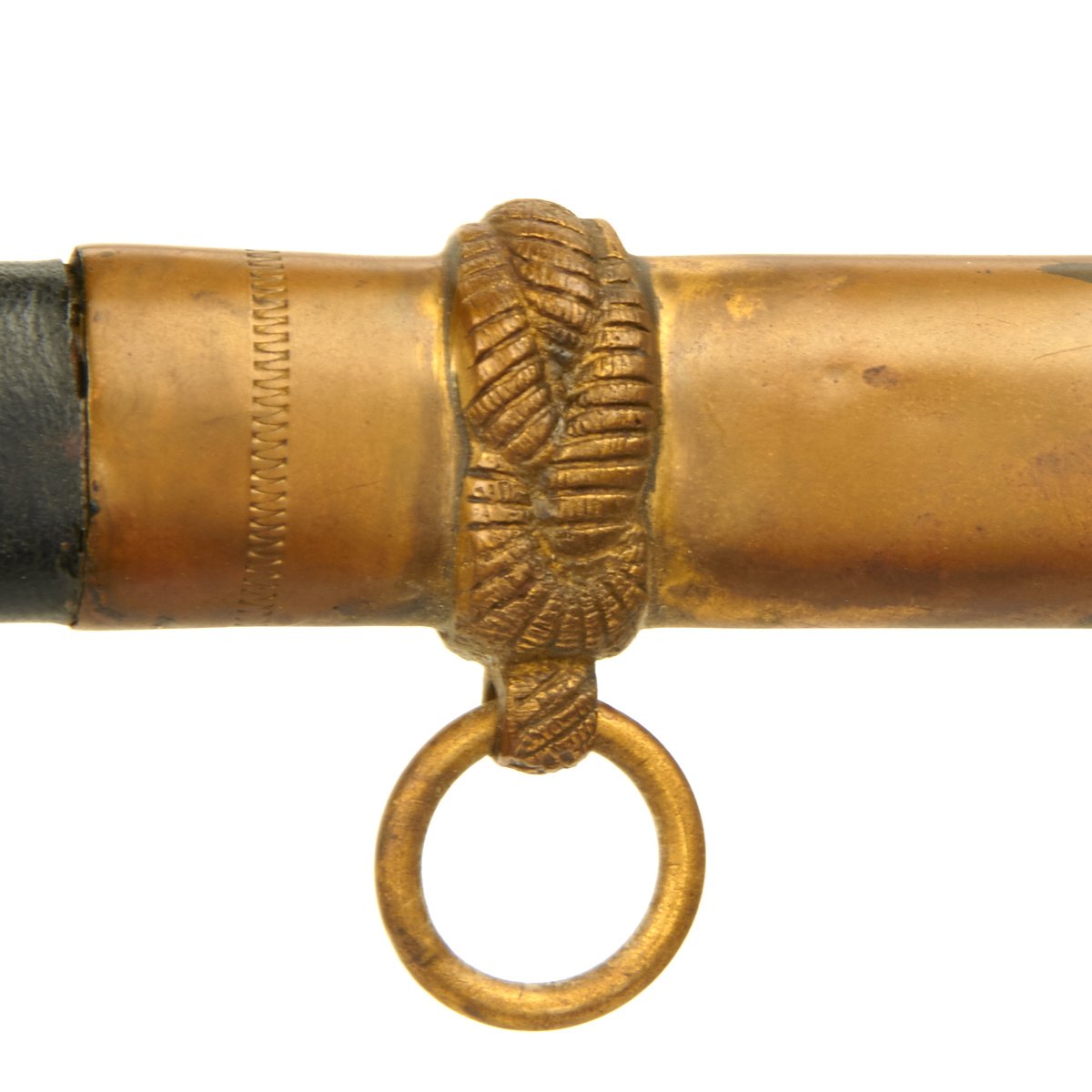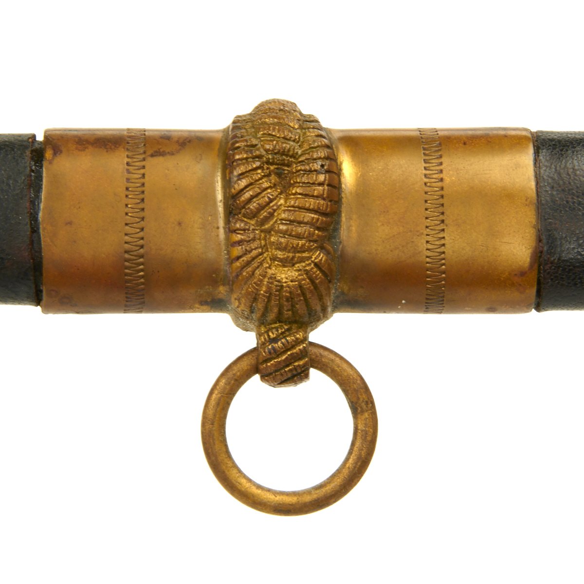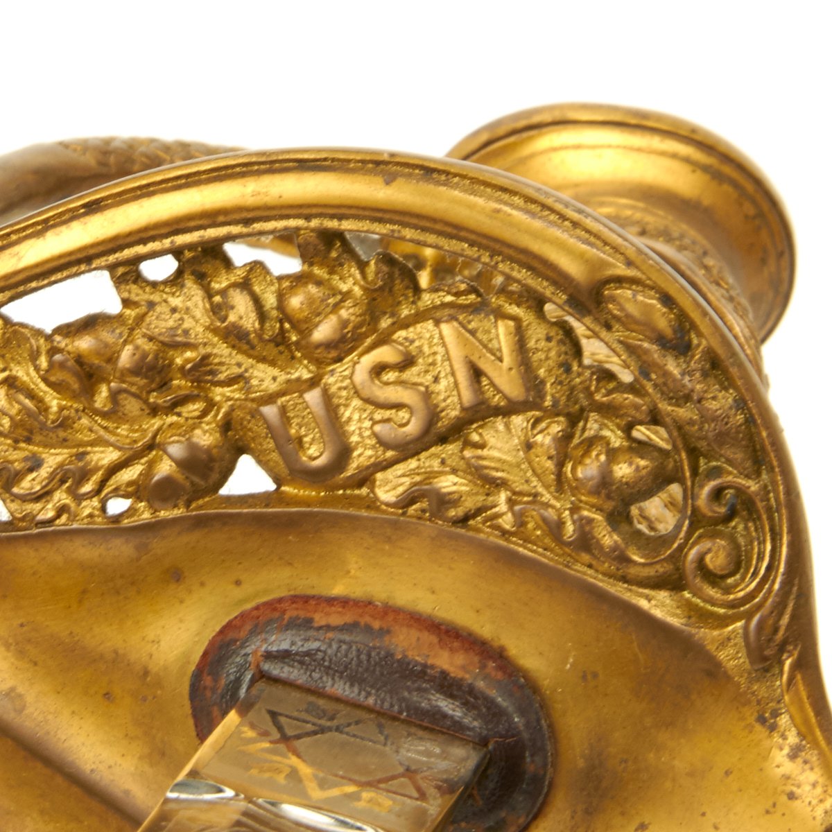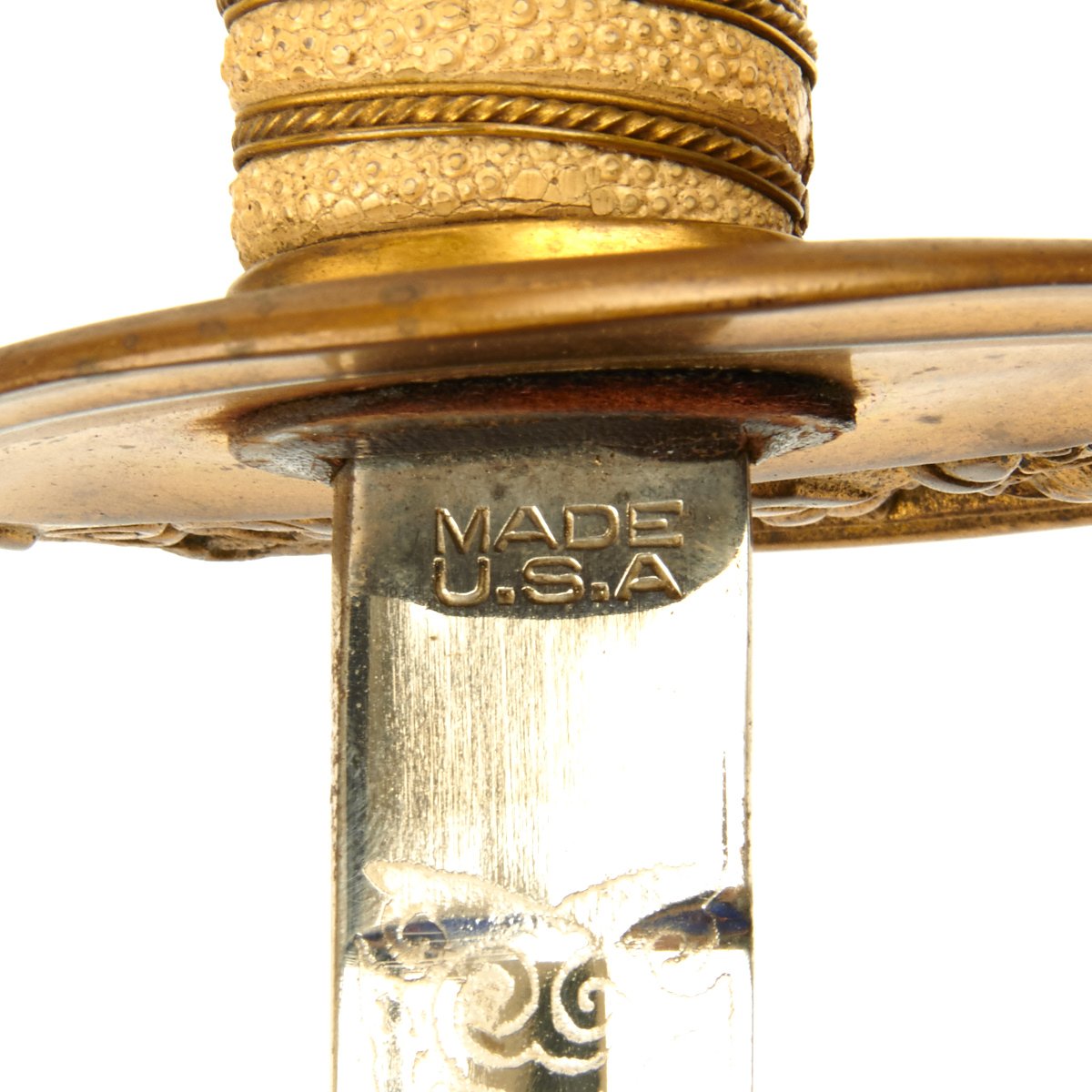 Original Item: One-of-a-kind. This is a post war U.S. Navy Officer sword, originally a gift for a USNA graduate, and has come straight out of the attic. Gilt brass mounts to both sword and scabbard. Heavily Nickel plated engraved and embossed 34" blade displaying the officer name and initials S.V. Cappetta. Overall length of the Sword is 40". The blade stamped MADE U.S.A Contained in its original stiff leather covered scabbard with gilt brass mounts. The hilt is florally embossed including USN. Offered in very good aged condition.