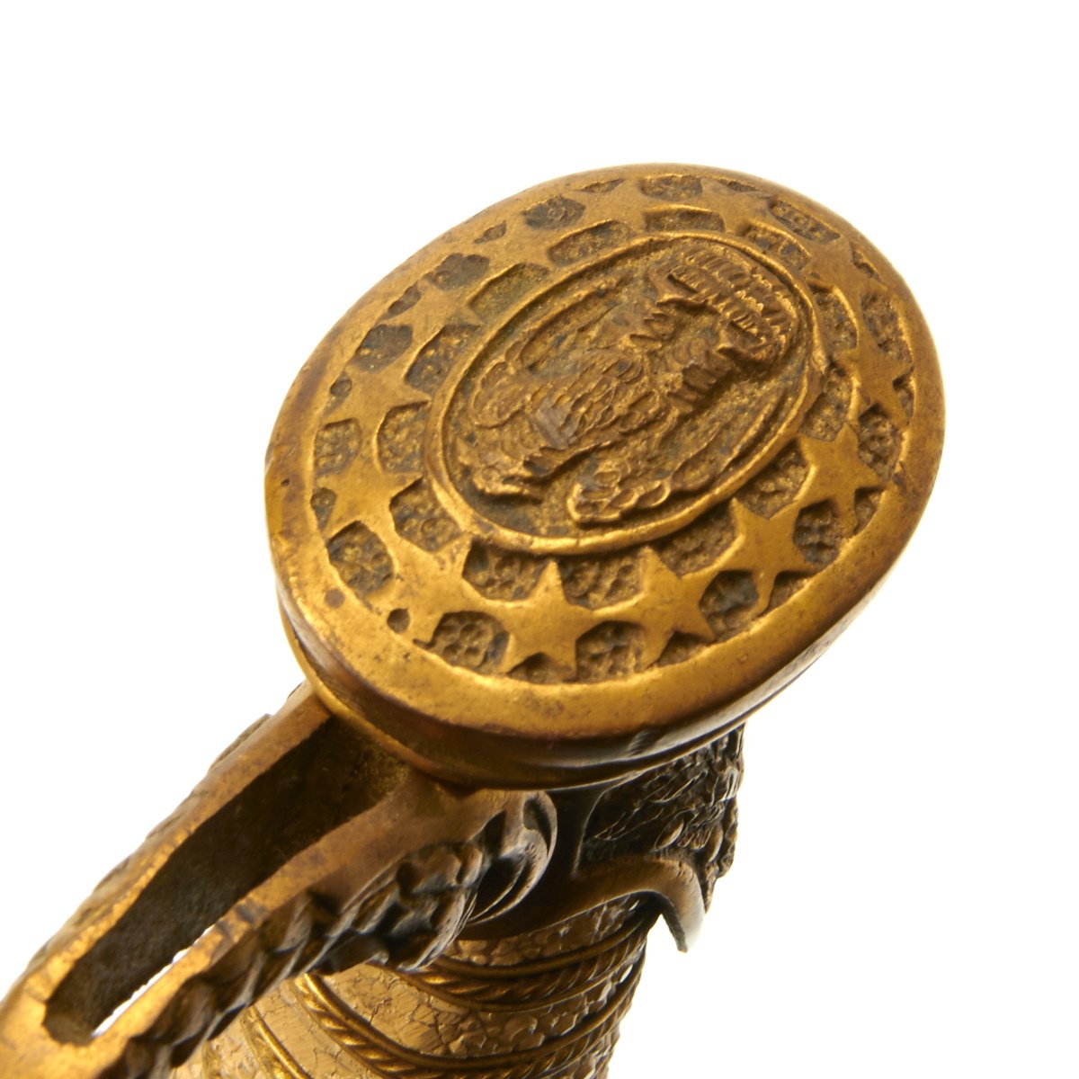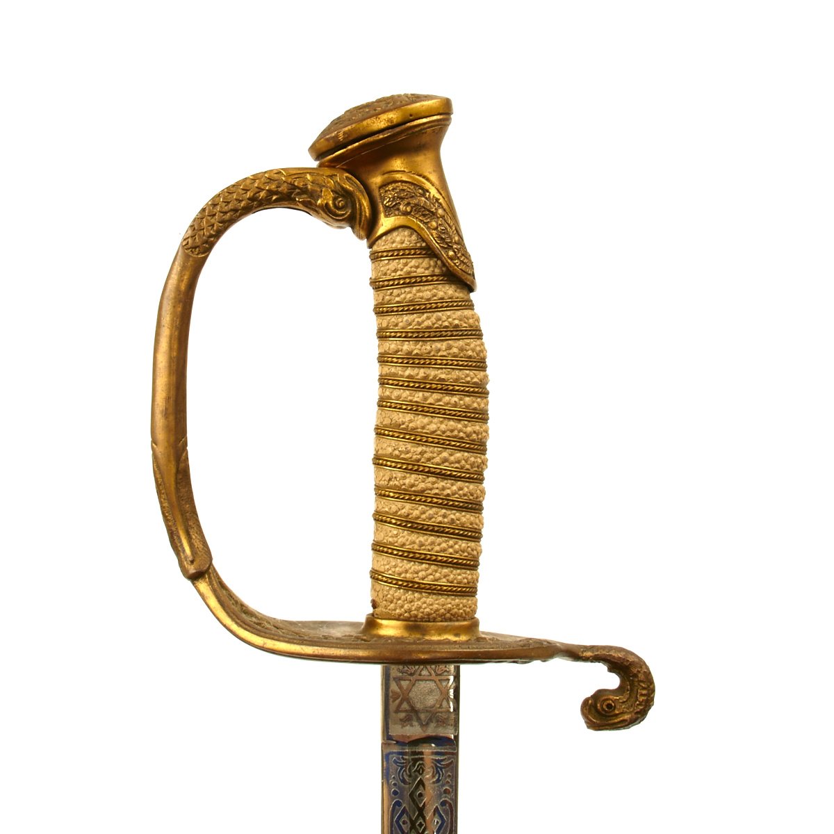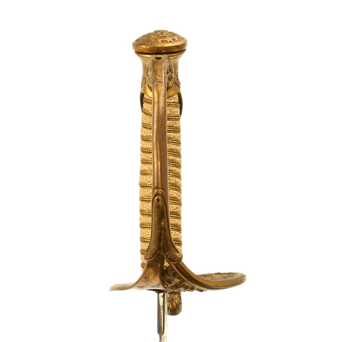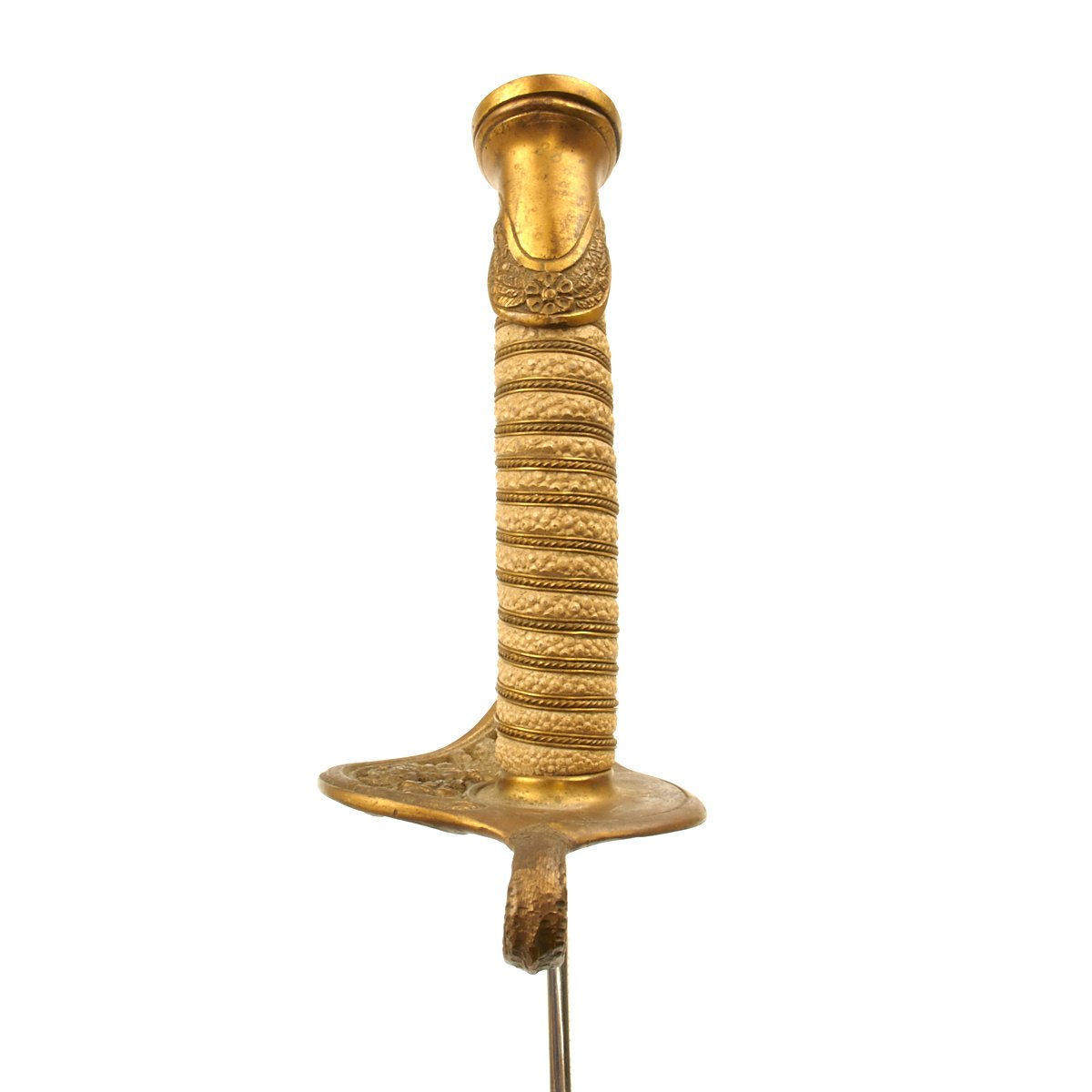 Original Item: One-of-a-kind. This is a post war U.S. Navy Officer sword, originally a gift for a USNA graduate, and has come straight out of the attic. Gilt brass mounts to both sword and scabbard. Heavily Nickel plated engraved and embossed 34" blade displaying the officer name and initials S.V. Cappetta. Overall length of the Sword is 40". The blade stamped MADE U.S.A Contained in its original stiff leather covered scabbard with gilt brass mounts. The hilt is florally embossed including USN. Offered in very good aged condition.