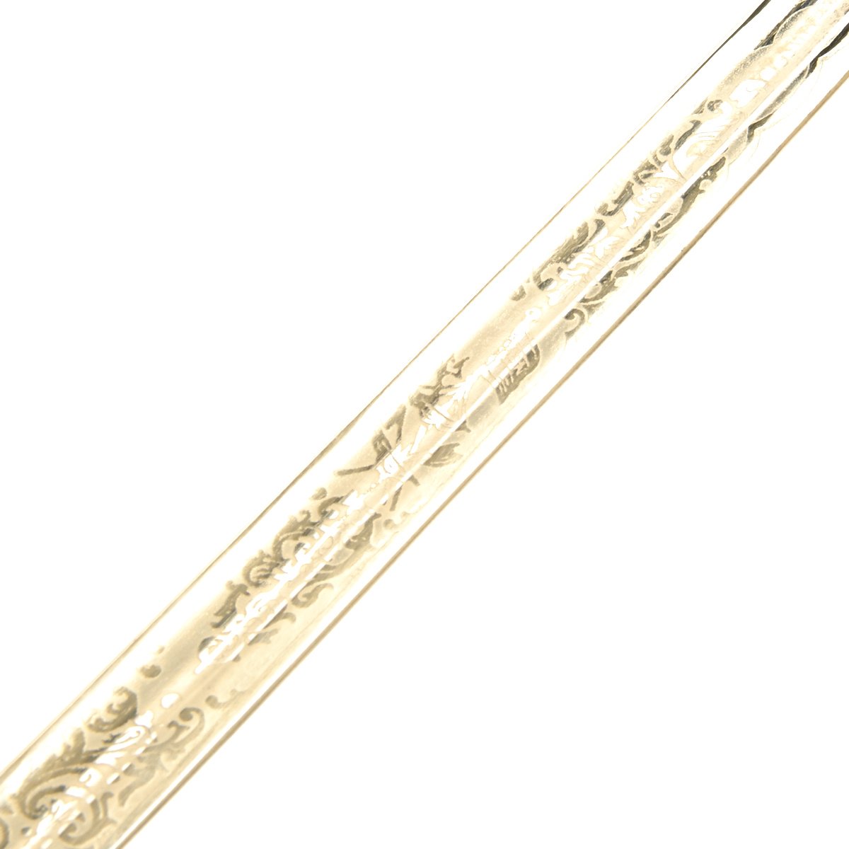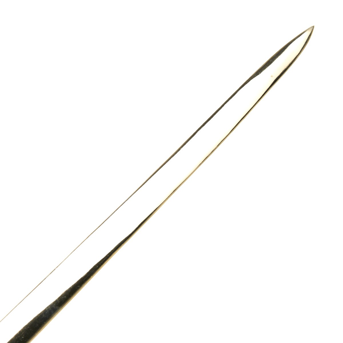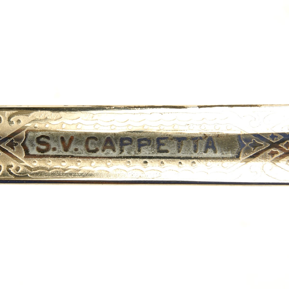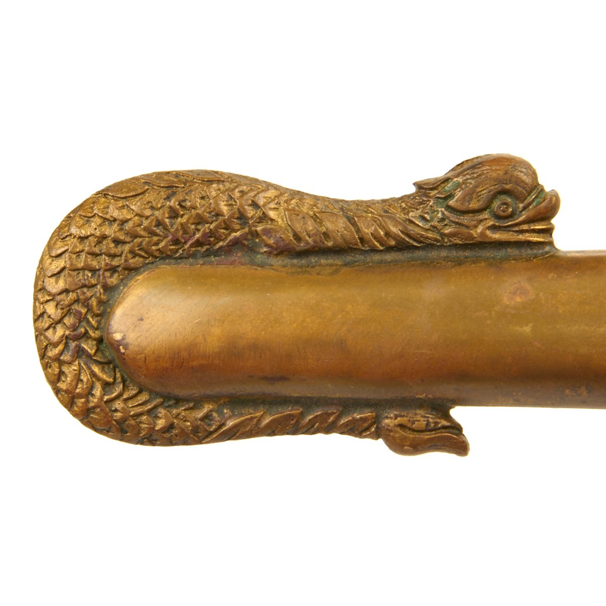 Original Item: One-of-a-kind. This is a post war U.S. Navy Officer sword, originally a gift for a USNA graduate, and has come straight out of the attic. Gilt brass mounts to both sword and scabbard. Heavily Nickel plated engraved and embossed 34" blade displaying the officer name and initials S.V. Cappetta. Overall length of the Sword is 40". The blade stamped MADE U.S.A Contained in its original stiff leather covered scabbard with gilt brass mounts. The hilt is florally embossed including USN. Offered in very good aged condition.