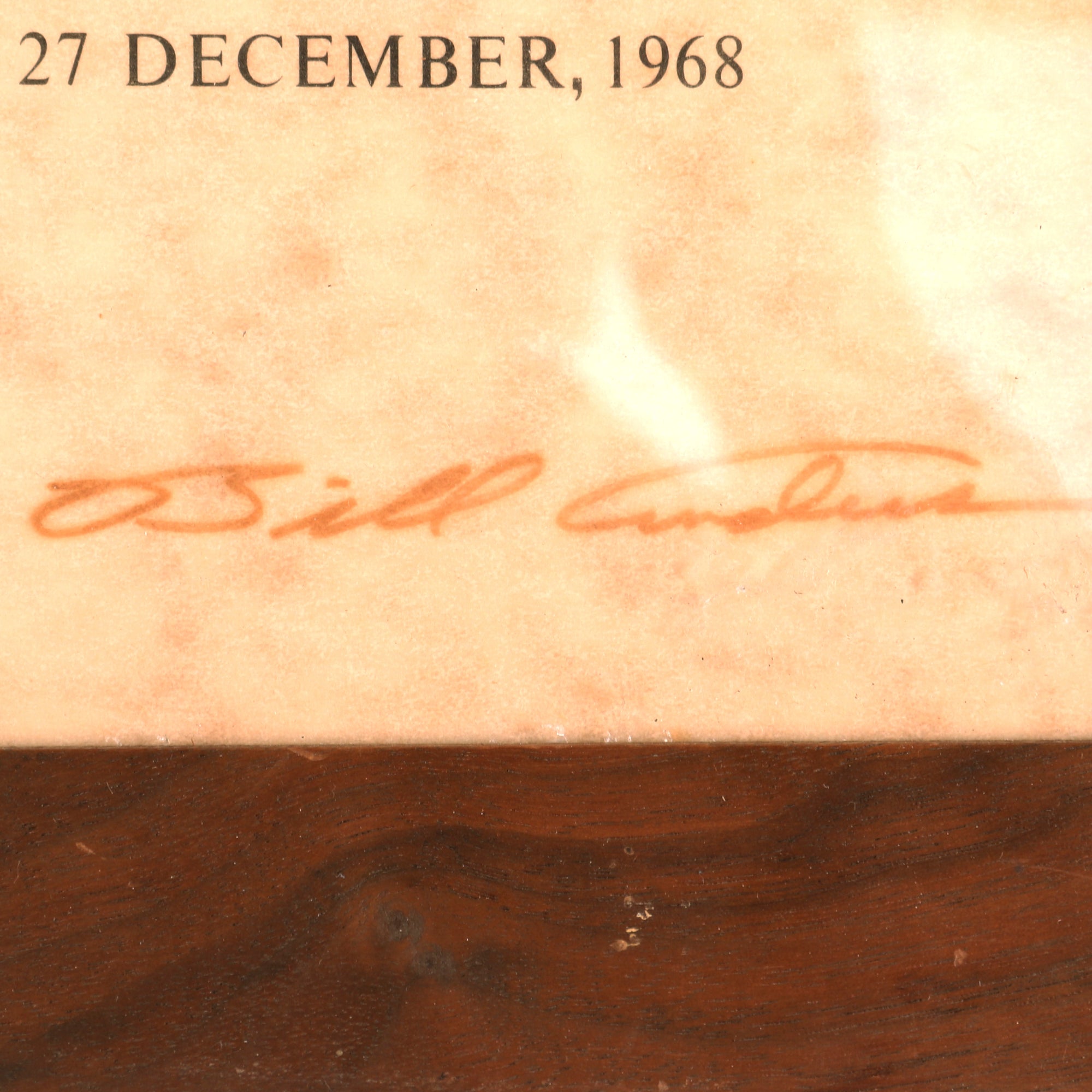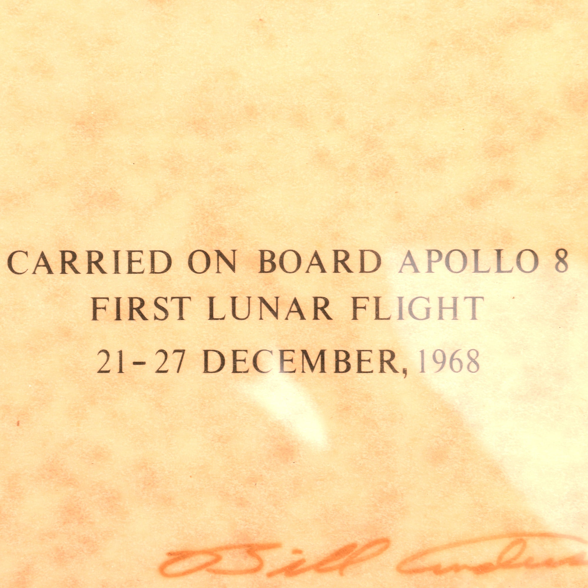 Original Item. One-of-a-Kind. This is without a doubt one of the most astounding NASA related pieces we have offered, a framed flag of Texas which was carried on board Apollo 8, the first crewed spacecraft to leave Earth's gravitational sphere of influence, and the first human spaceflight to reach the Moon, and gifted to Texas Governor John Connally. The frame is also signed by the three astronauts aboard the mission, Frank Borman, James Lovell, and William Anders. Anders is credited with having taken “Earthrise”, often described as "the most influential environmental photograph ever taken".