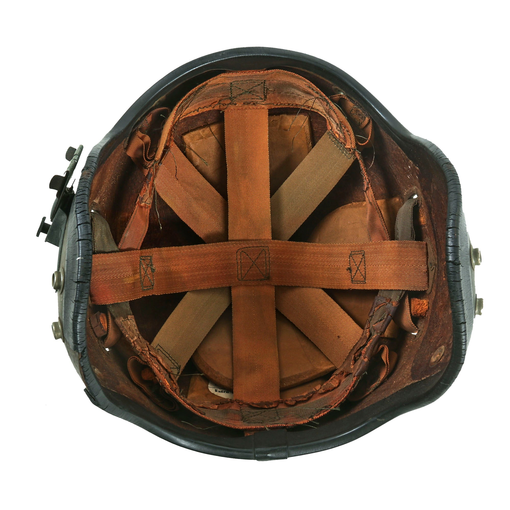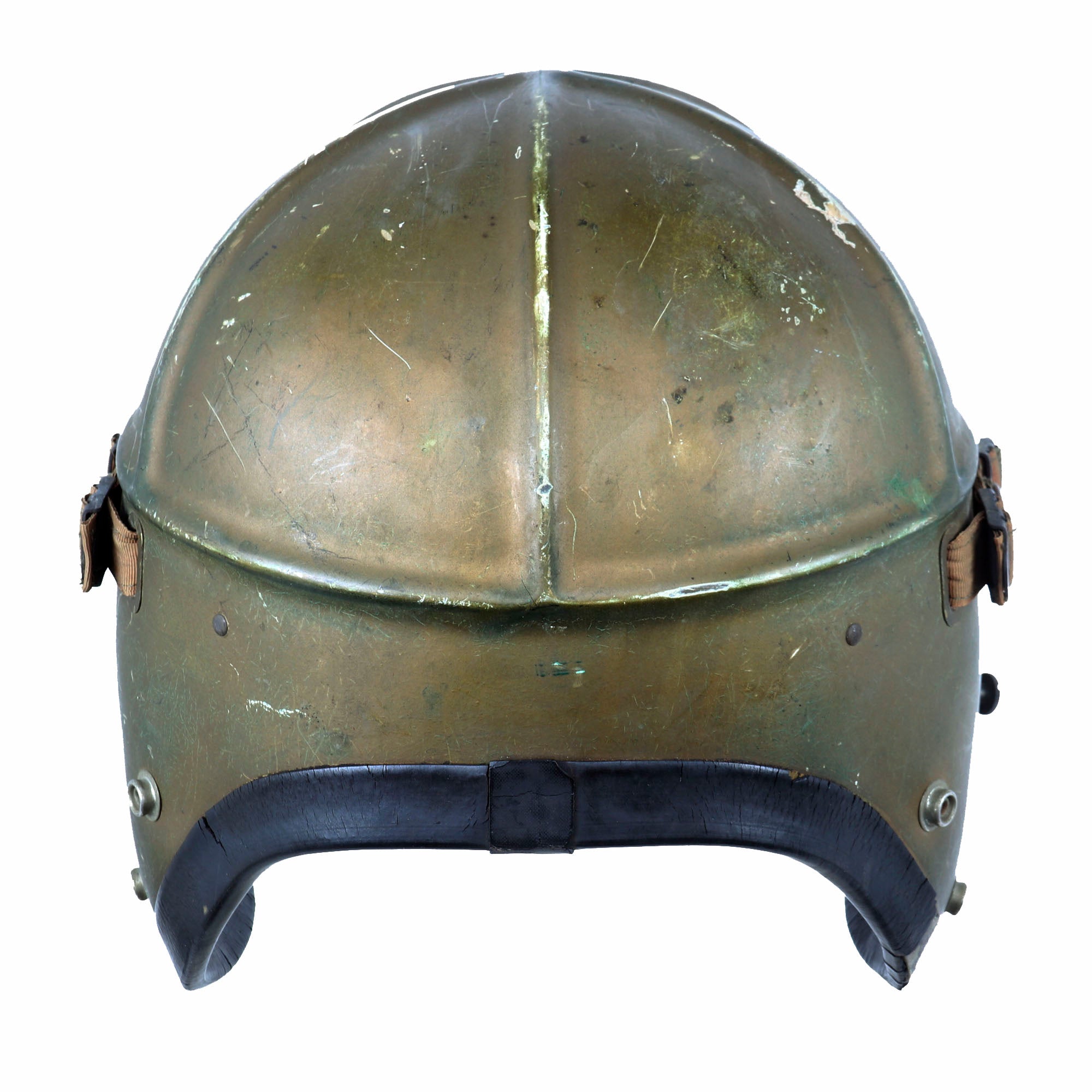 One of the internal padding pieces has come off and is stuck behind the straps. The rubber along the rim is heavily cracking with some pieces missing. The helmet has very heavy wear without any of its accessories. A fair example, good for display. Comes ready for further research and display.