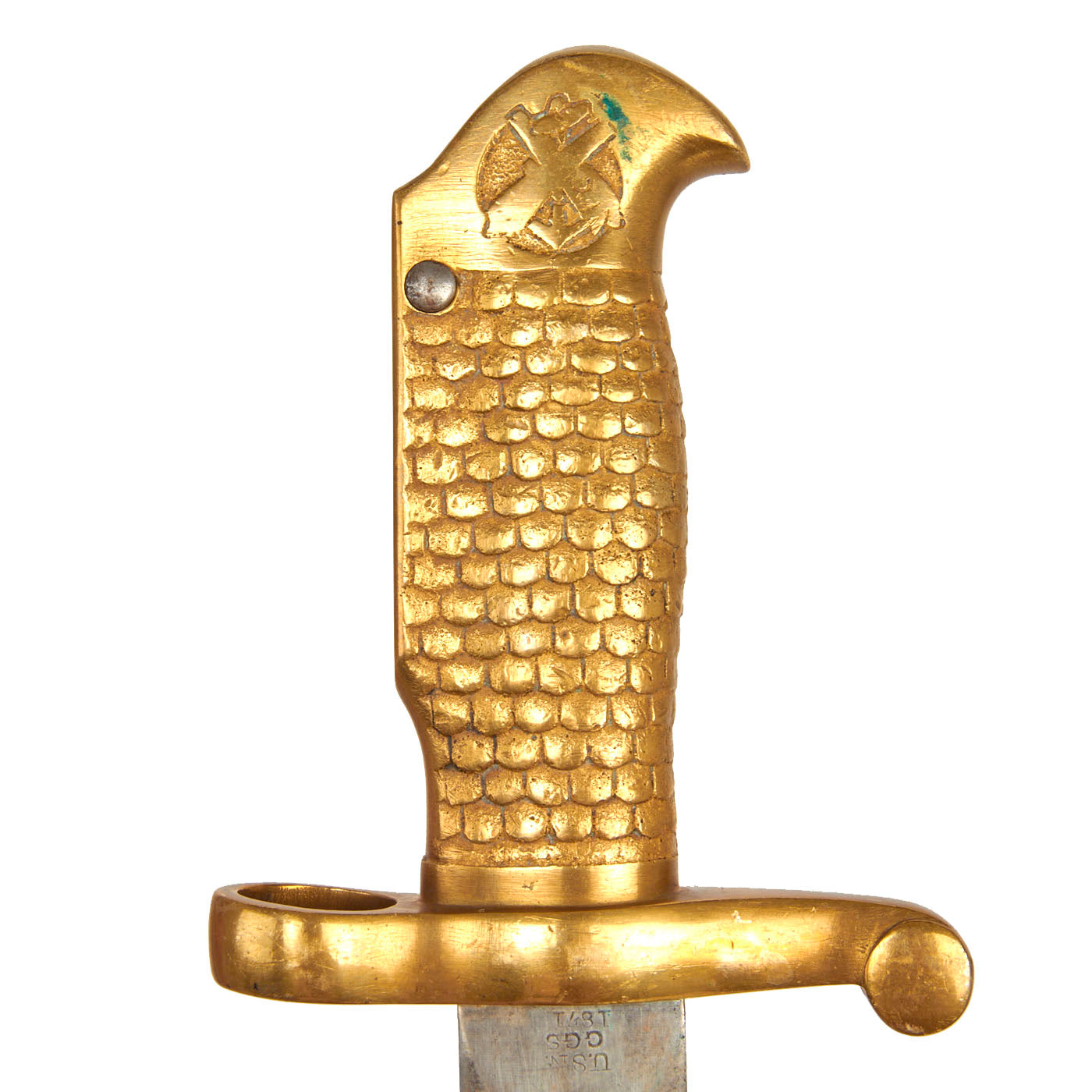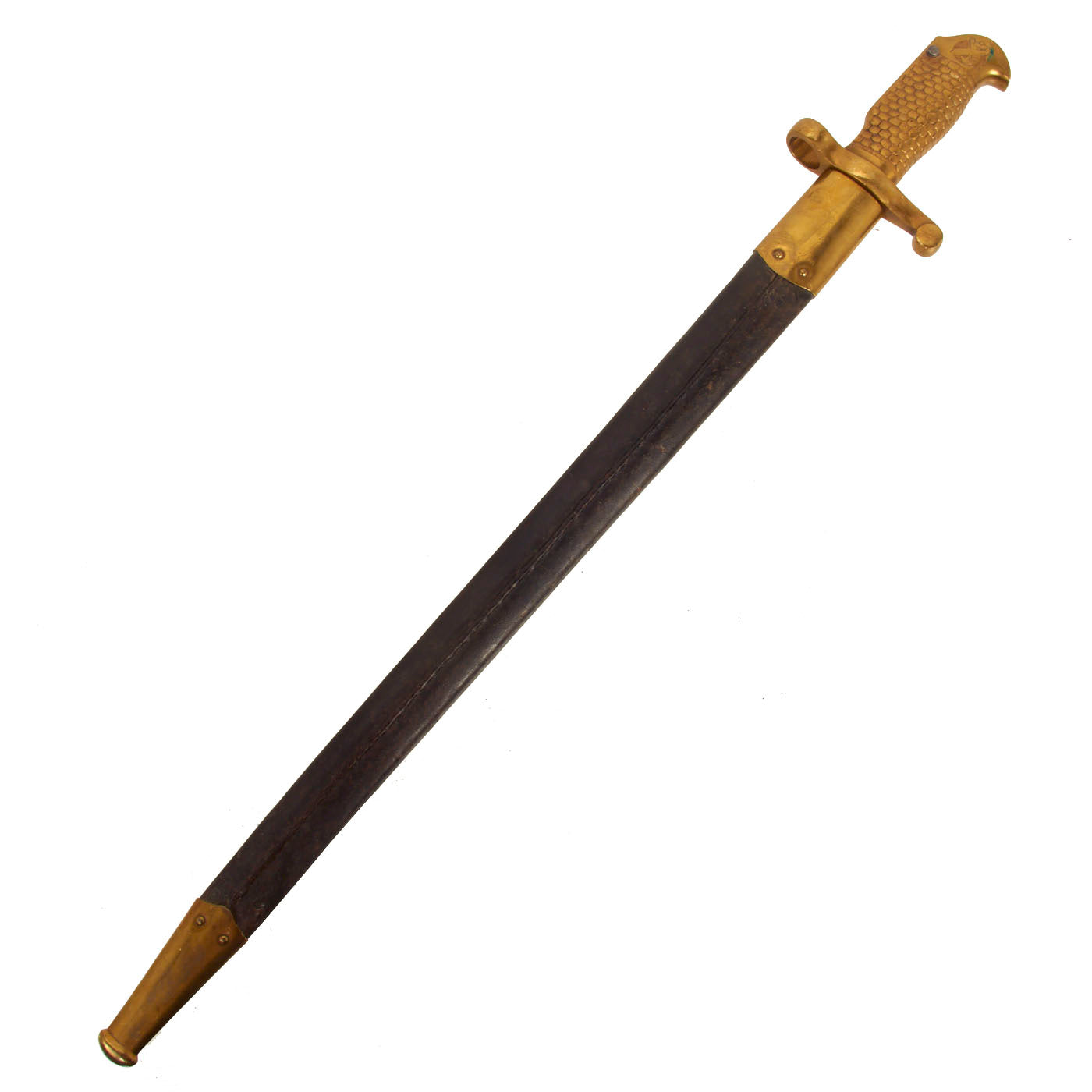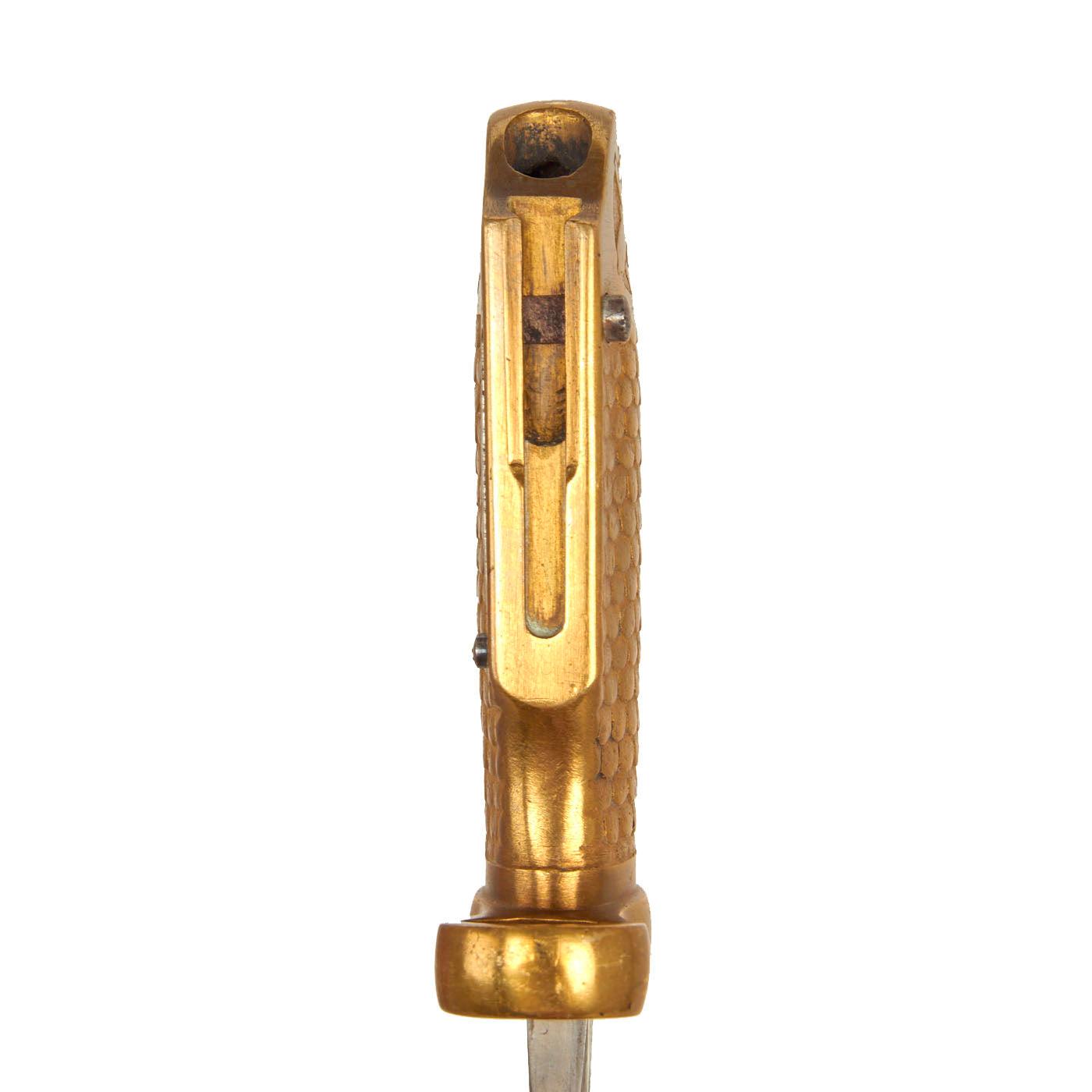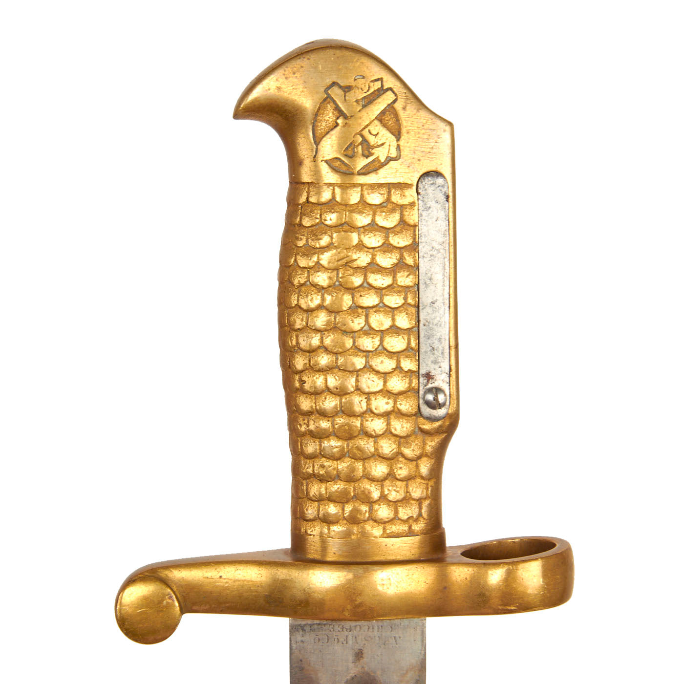 Original Item: Only One Available: This is the lesser known of the Post Civil War Naval brass hilted bayonets for the U.S. Navy M1870 Remington Rolling block rifle, the Type 2 being somewhat more distinctive than the Type 1. It is a lovely double edged sword bayonet with a 20" blade, measuring 25” overall. It features a distinctive solid brass hilt with a feather/scale design cast into the grip.