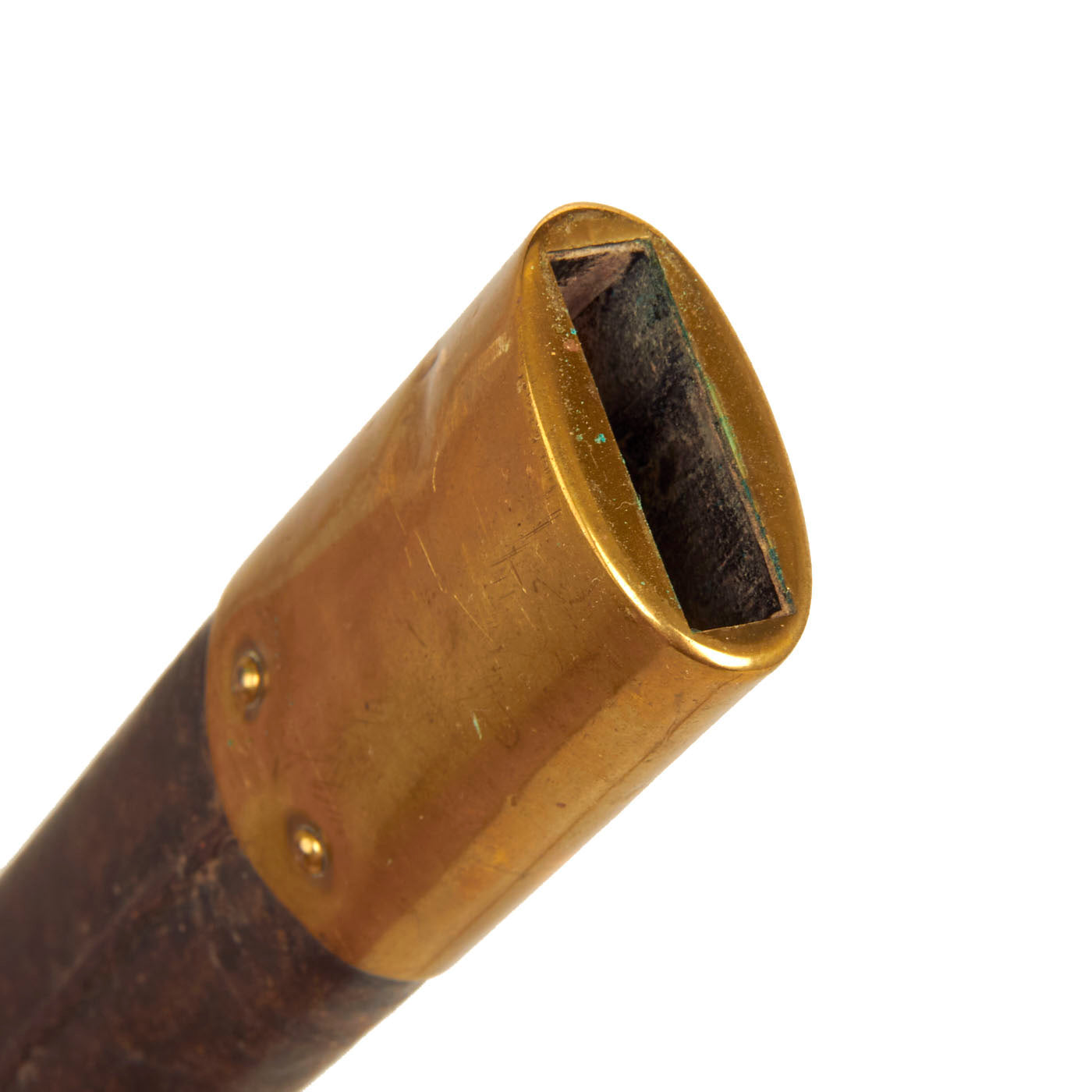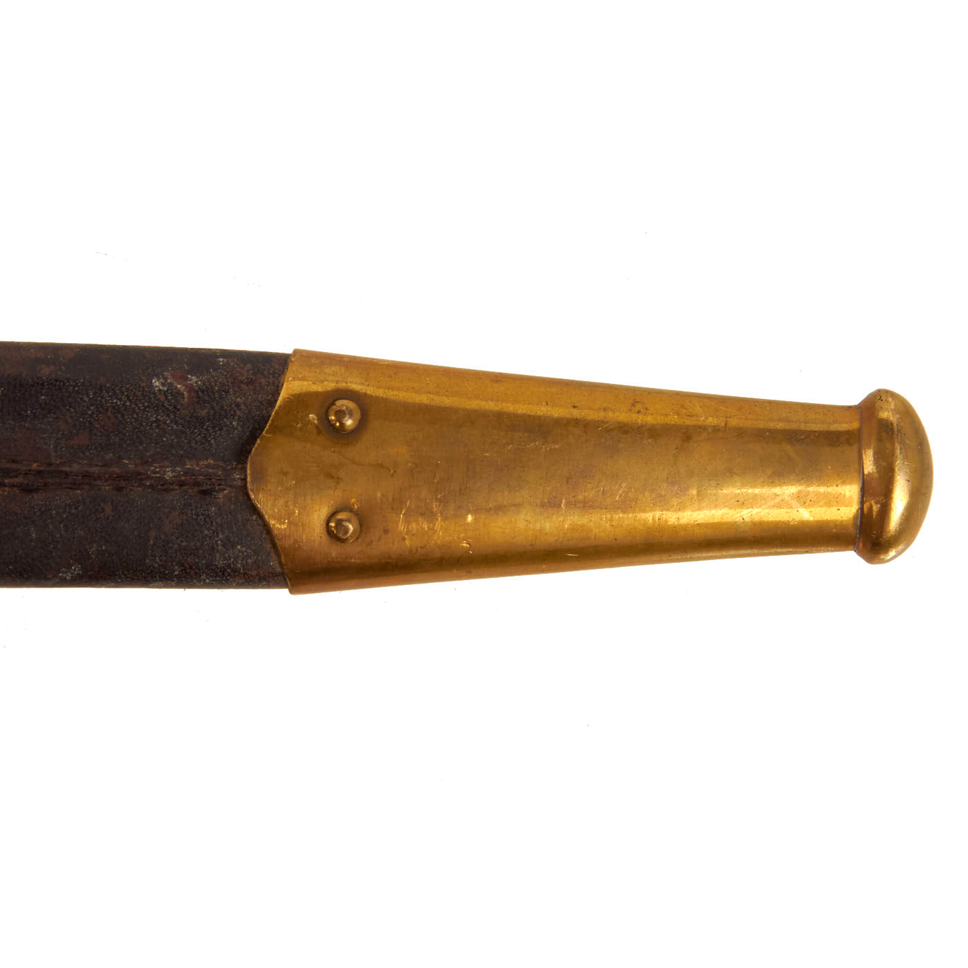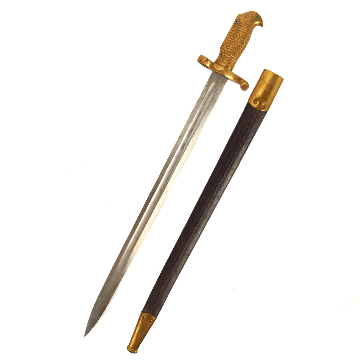 Original Item: Only One Available: This is the lesser known of the Post Civil War Naval brass hilted bayonets for the U.S. Navy M1870 Remington Rolling block rifle, the Type 2 being somewhat more distinctive than the Type 1. It is a lovely double edged sword bayonet with a 20" blade, measuring 25” overall. It features a distinctive solid brass hilt with a feather/scale design cast into the grip.