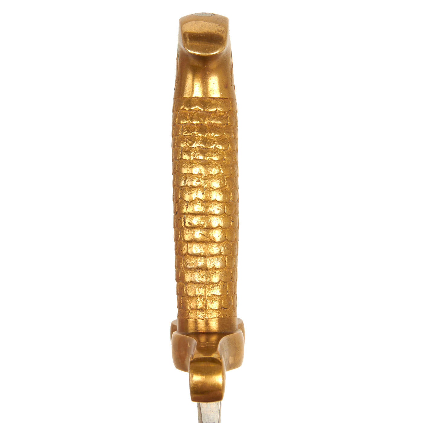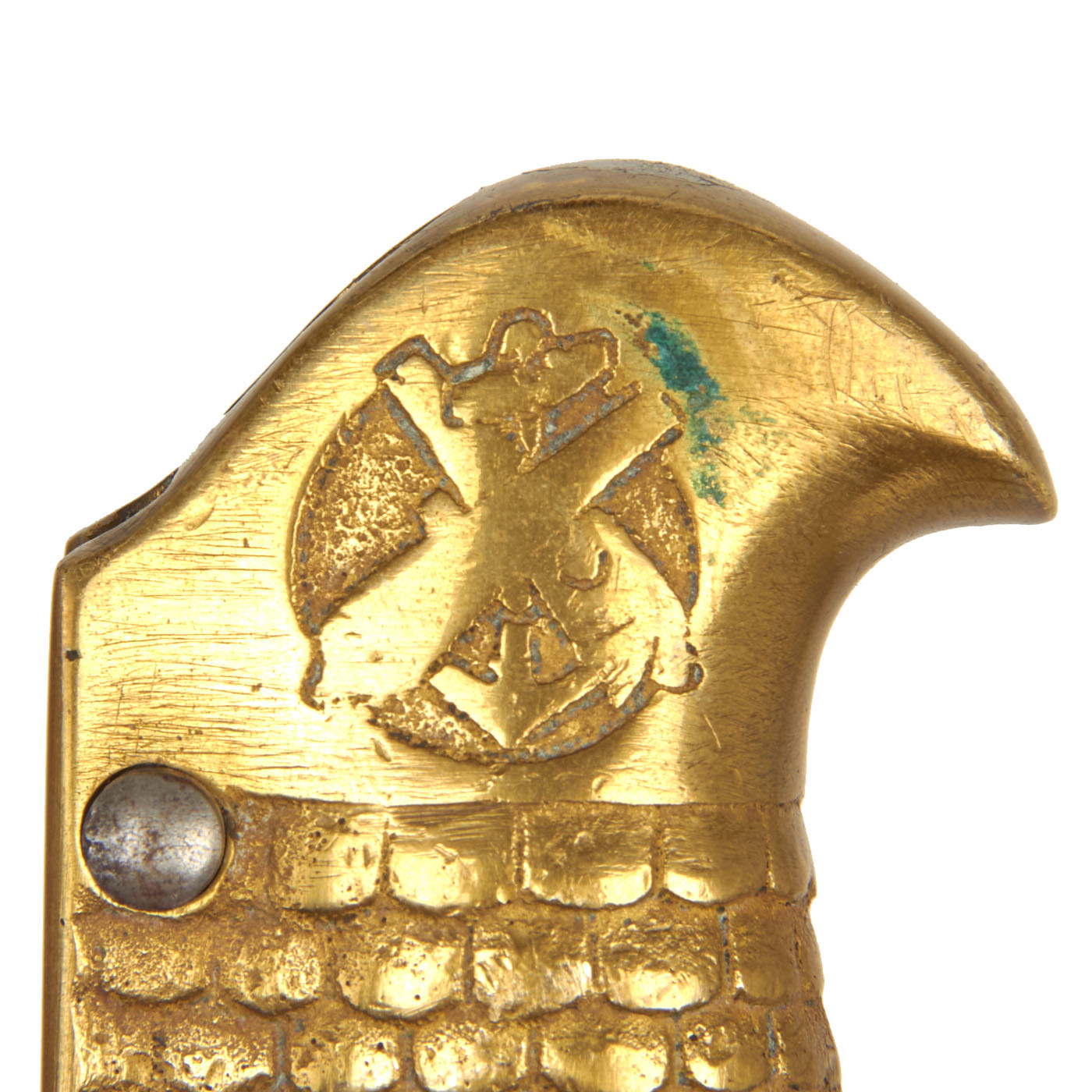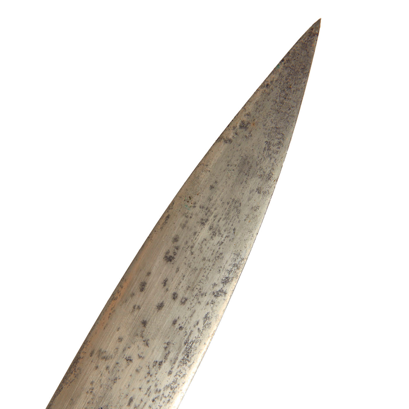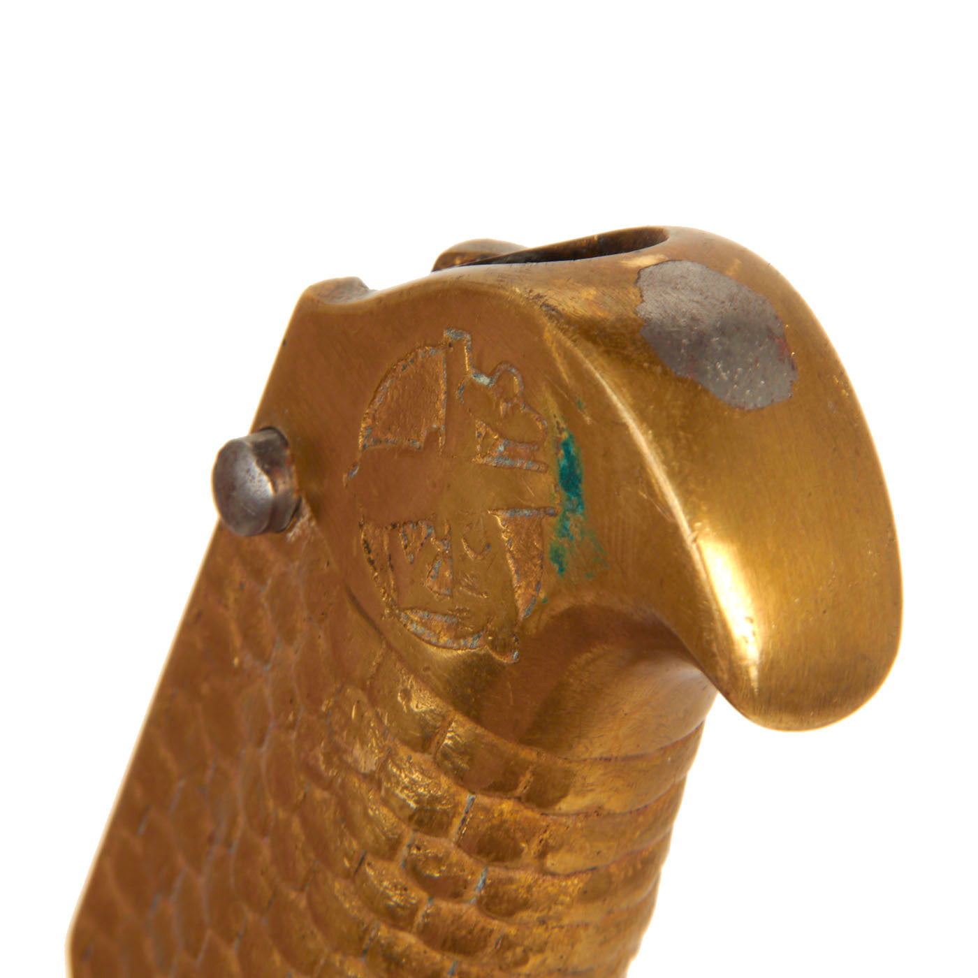 Original Item: Only One Available: This is the lesser known of the Post Civil War Naval brass hilted bayonets for the U.S. Navy M1870 Remington Rolling block rifle, the Type 2 being somewhat more distinctive than the Type 1. It is a lovely double edged sword bayonet with a 20" blade, measuring 25” overall. It features a distinctive solid brass hilt with a feather/scale design cast into the grip.