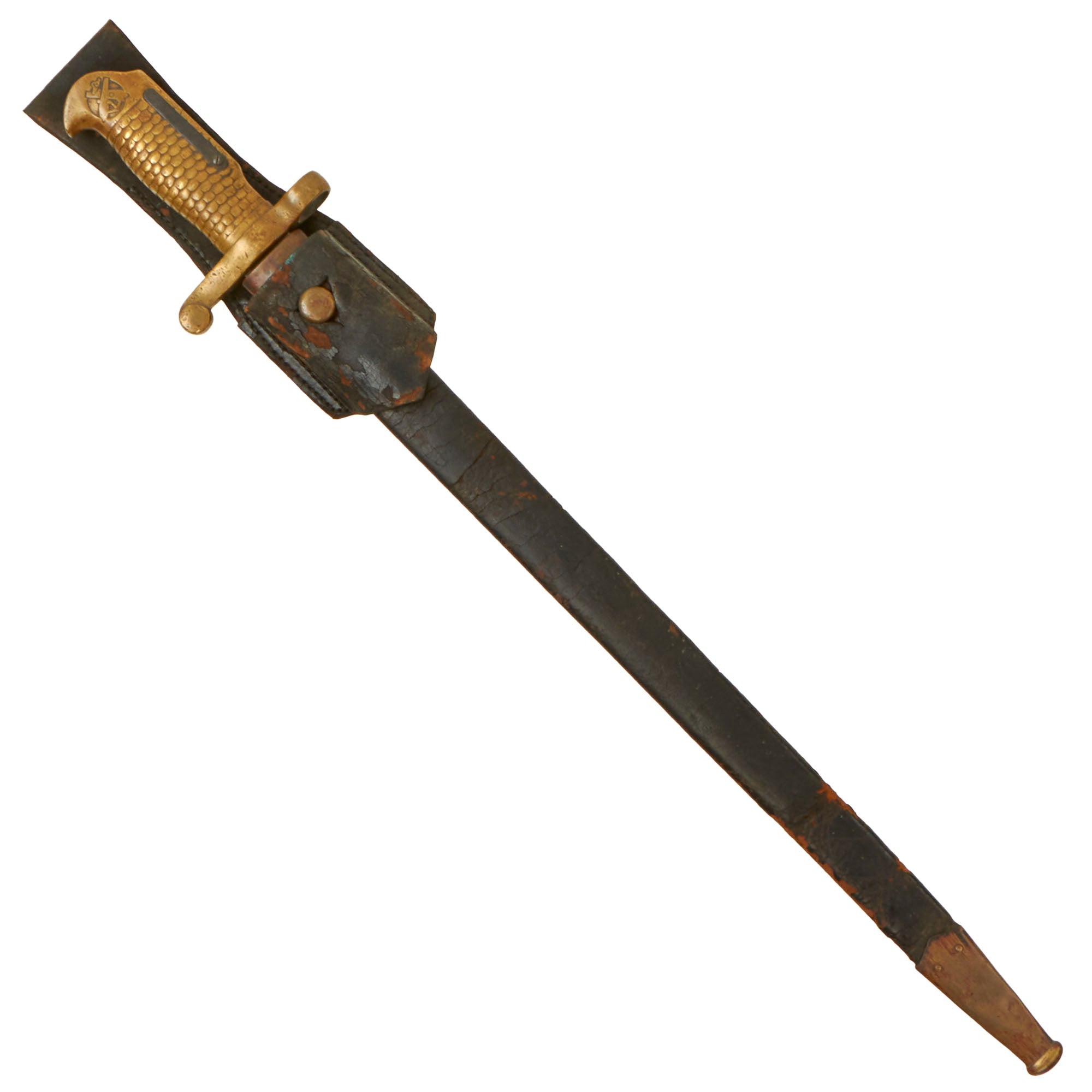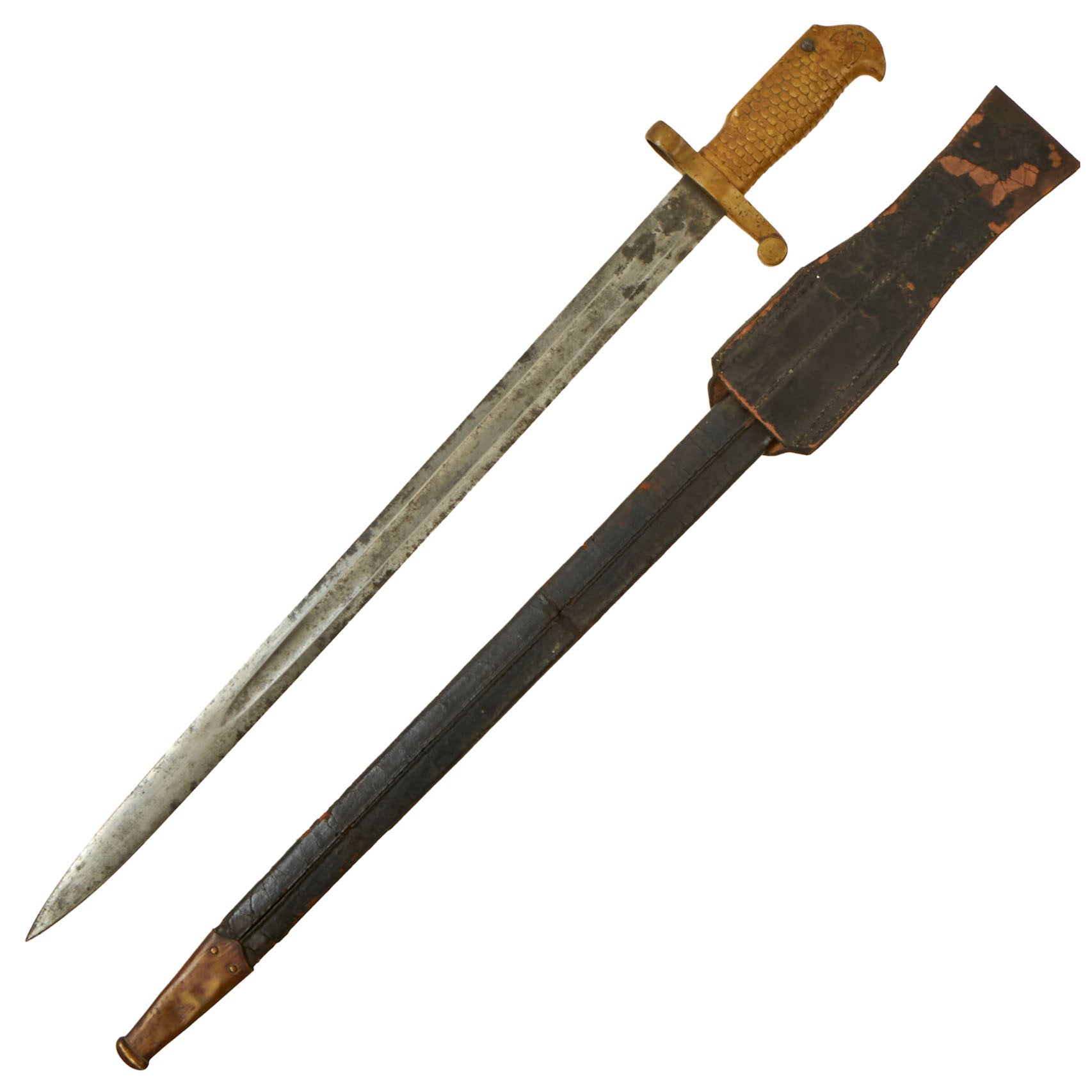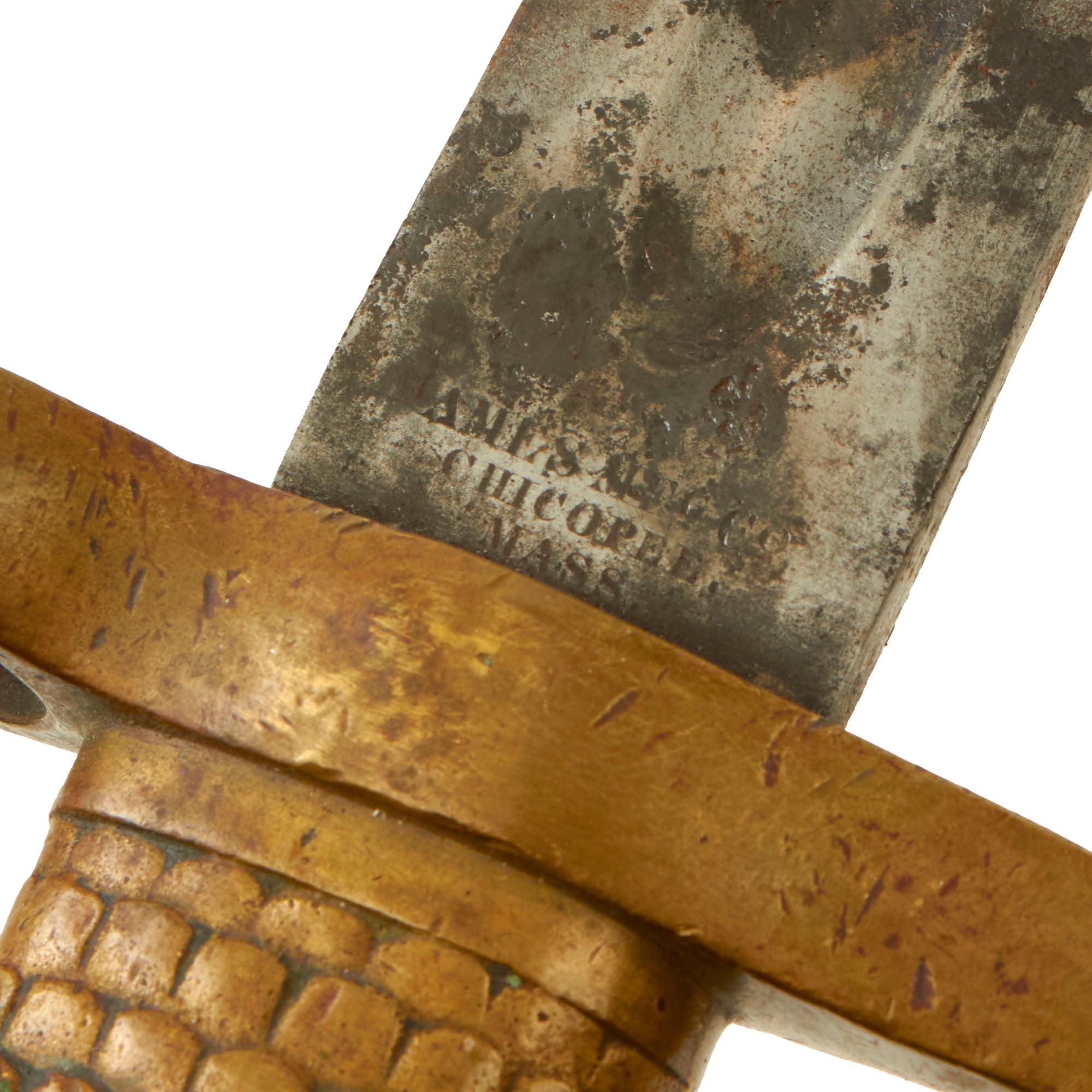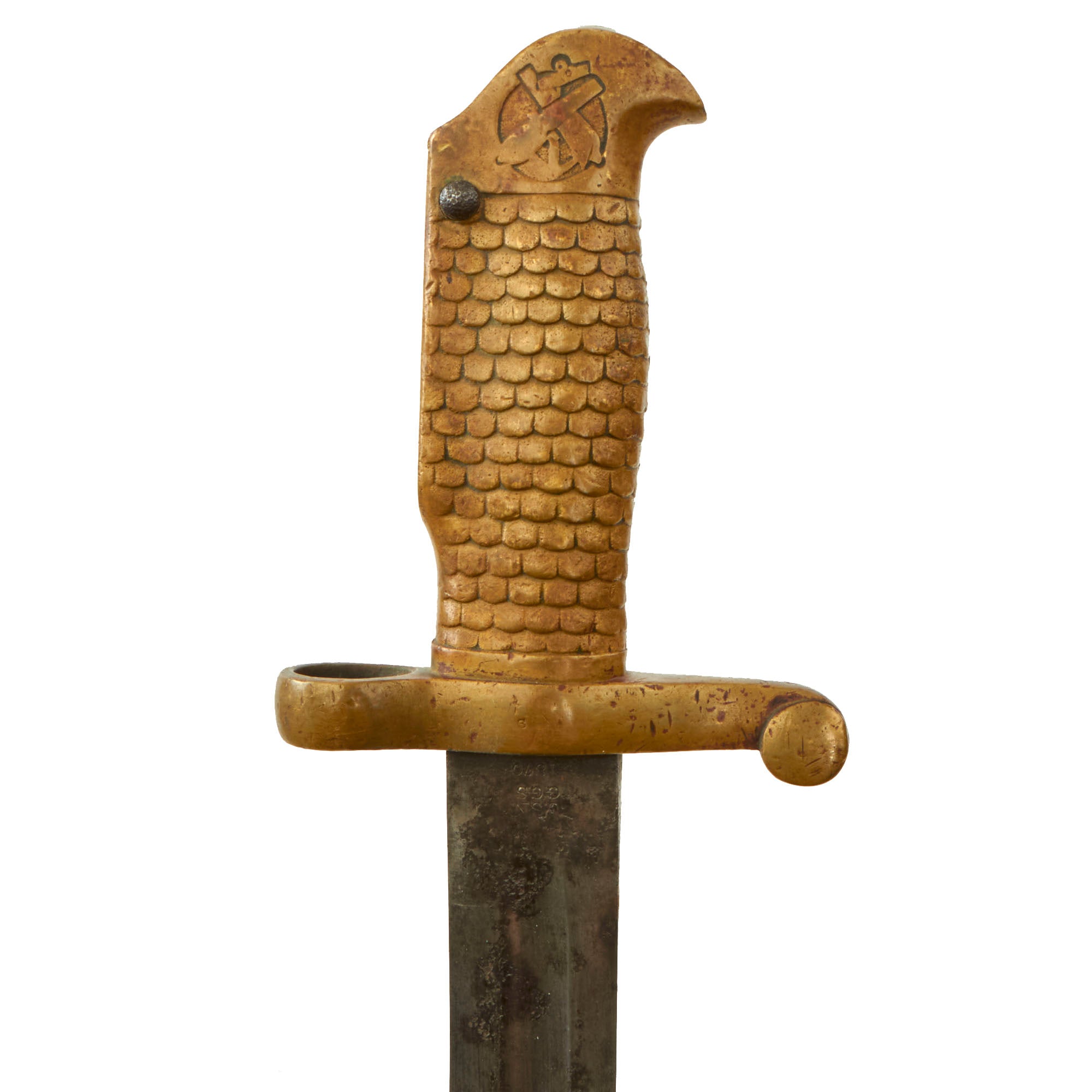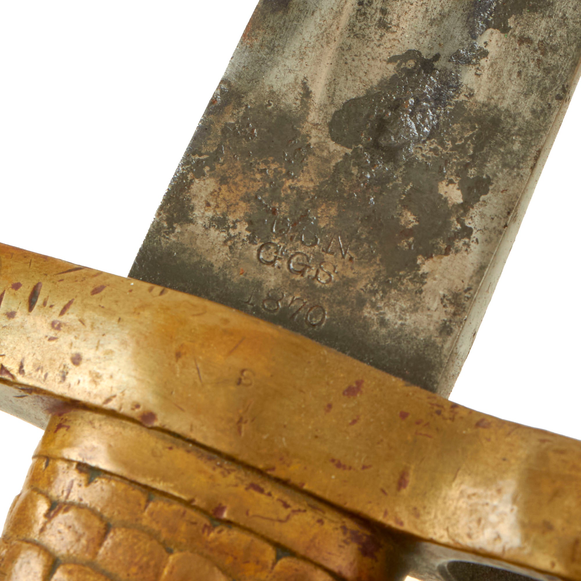 Original Item: Only One Available: This is the lesser known of the Post Civil War Naval brass hilted bayonets for the U.S. Navy M1870 Remington Rolling block rifle, the Type 2 being somewhat more distinctive than the Type 1. It is a lovely double edged sword bayonet with a 20" blade, measuring 25” overall. It features a distinctive solid brass hilt with a feather/scale design cast into the grip.The ricasso is marked with:U.S.N.GGS1870With the manufacturer information partially stamped on the opposite side:AMES MFG COCHICOPEEThe pommel is cast with the U.S. Crossed Cannons overlaying an Anchor and still bears the U.S. Inspector's initials of G.G.S. with I.A. on the end of the pommel. The blade shows use with some staining but is still in great shape. Bayonet comes complete with brass mounted black leather scabbard which shows heavy crazing and cracking to the leather. The scabbard is held within a black leather frog that is likely not original to the scabbard given the triangular shaped frog-button hole. However, it’s certainly of the period and matches the bayonet well.In great shape and ready to display!Specifications:Blade Length: 20 ⅛”"Blade Style: Single Edge "Yataghan" w/ FullerOverall length: 24 ¾“Crossguard: 3 ¾”Scabbard Length: 20½”Springfield model 1870 Remington—NavyThe Springfield Model 1870 rolling-block U.S. Navy rifle was a shipboard small arm for use by the United States Navy, employing the Remington Arms Company rolling-block design, and manufactured under a royalty agreement with Remington.Note: Springfield Model 1870 may also refer to the Springfield Model 1870 rifle. One of the rifles which used the trapdoor breechblock design developed by Erskine S. Allin.The U.S. Navy decided to order 10,000 rolling-block rifles. These were to be manufactured at Springfield Armory. After lengthy discussions, it was decided that Springfield Armory would make the complete rifle, and would pay Remington and Sons a $1 royalty for all rifles produced.After the rifles were produced, Navy inspectors realized that the rear sights had been positioned incorrectly, and were dangerously close to the chamber, making the weapon unsafe for use. All 10,000 rifles were rejected, and were subsequently sold to Poultney and Trimble of Baltimore. These weapons were then exported to France for use during the Franco-Prussian War.The sale of the defective rifles enabled enough funds to be recovered that the Navy Ordnance Department later ordered 12,000 Model 1870 Type II rifles, which were just a minor improvement to the Model 1870 and included changes such as the correction of the location of the rear sight.