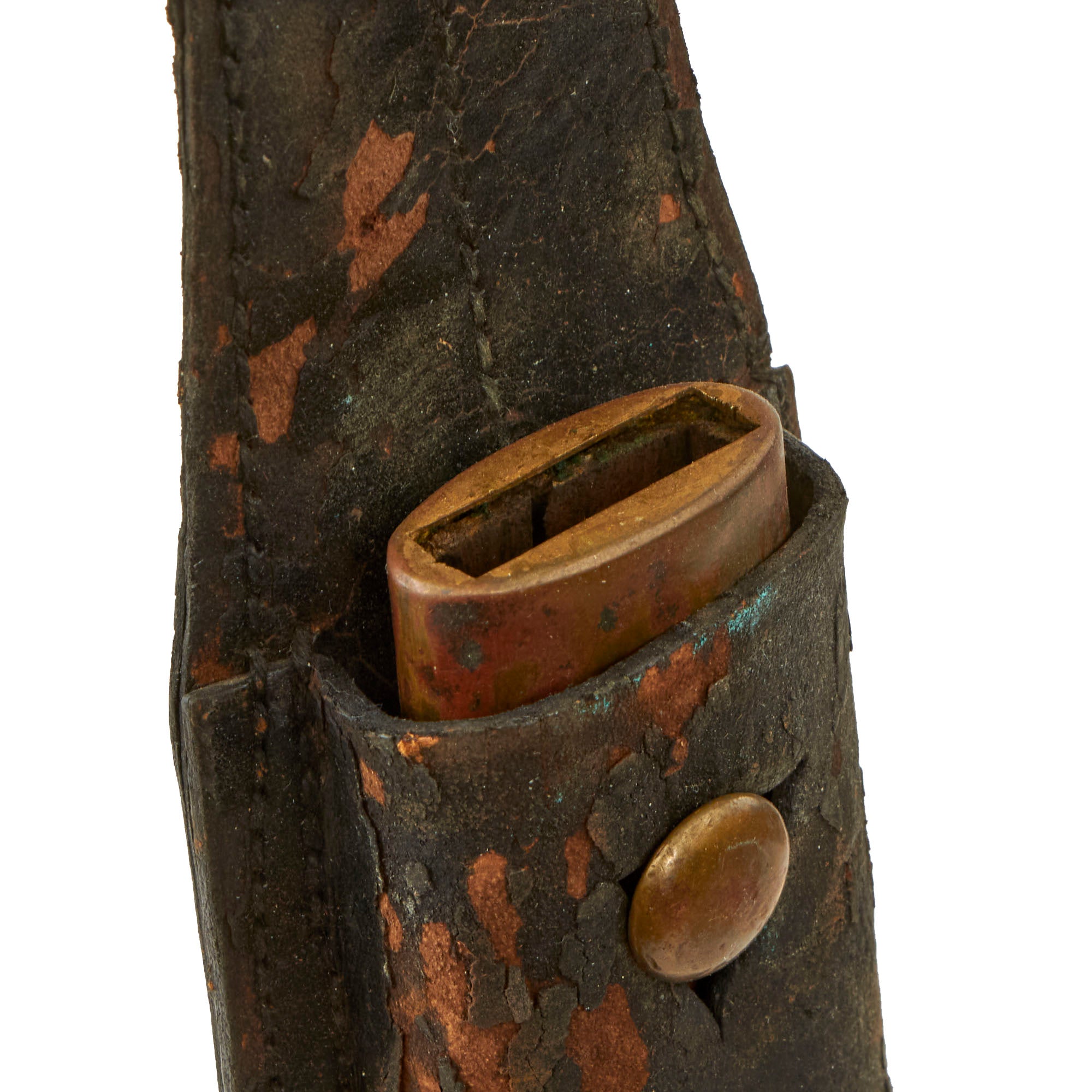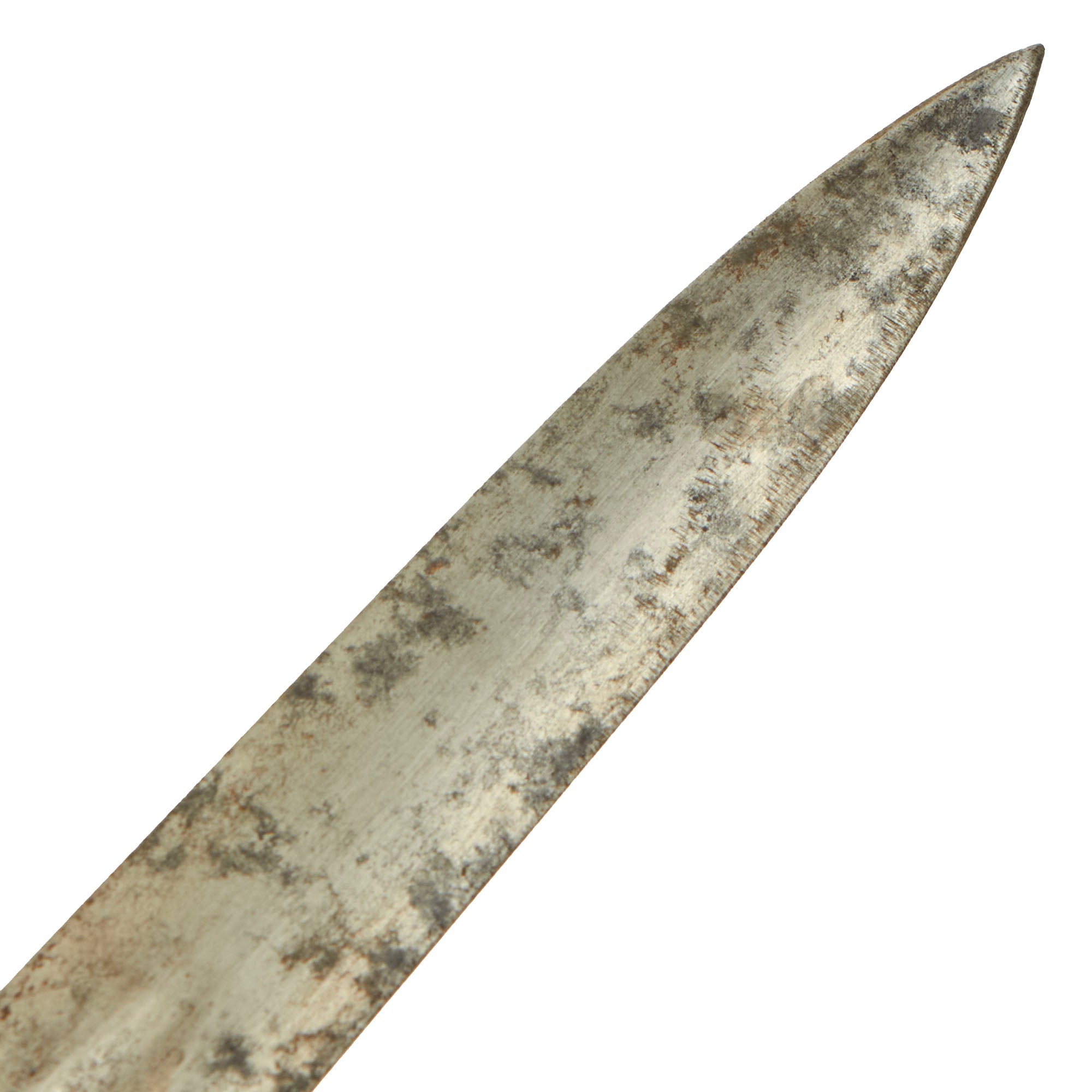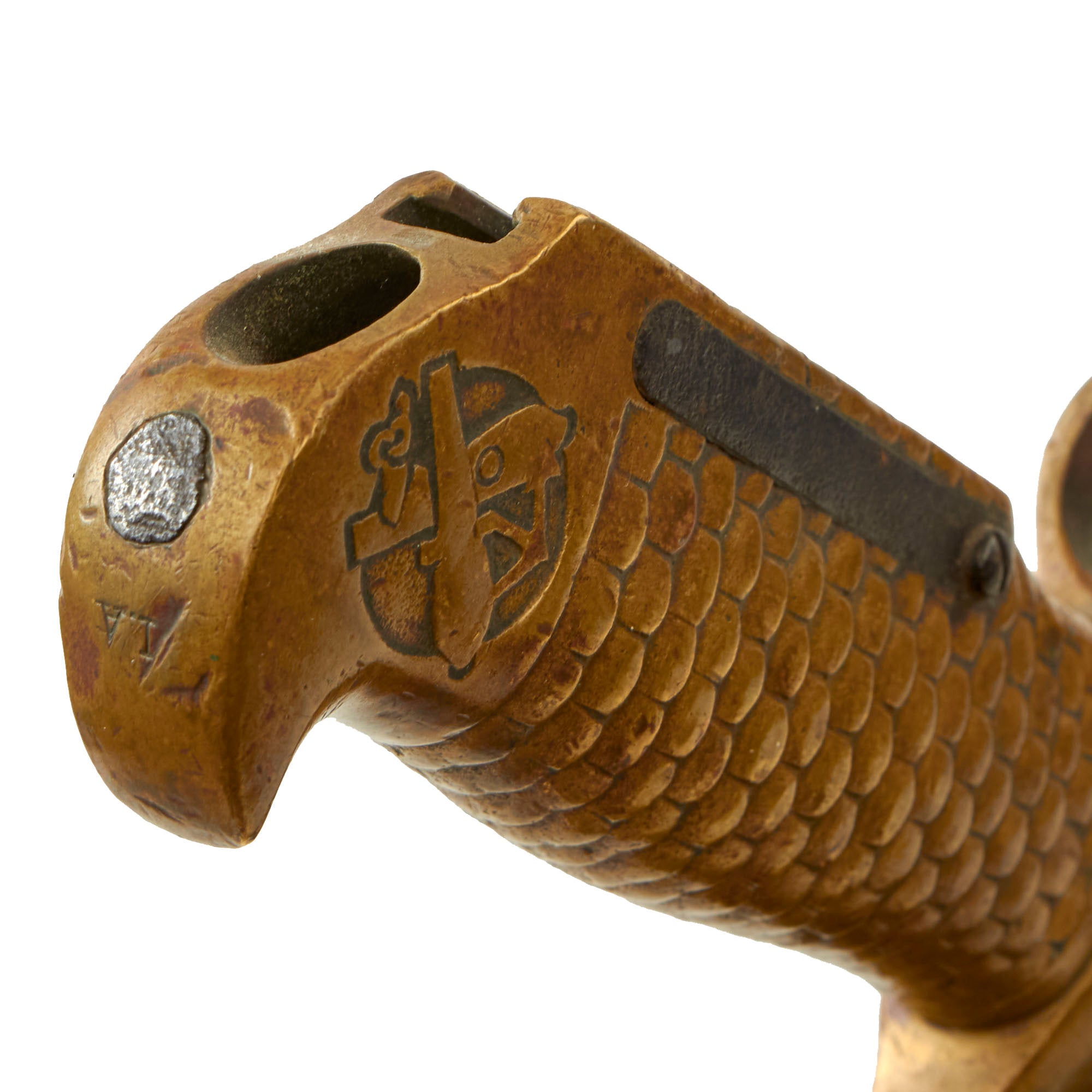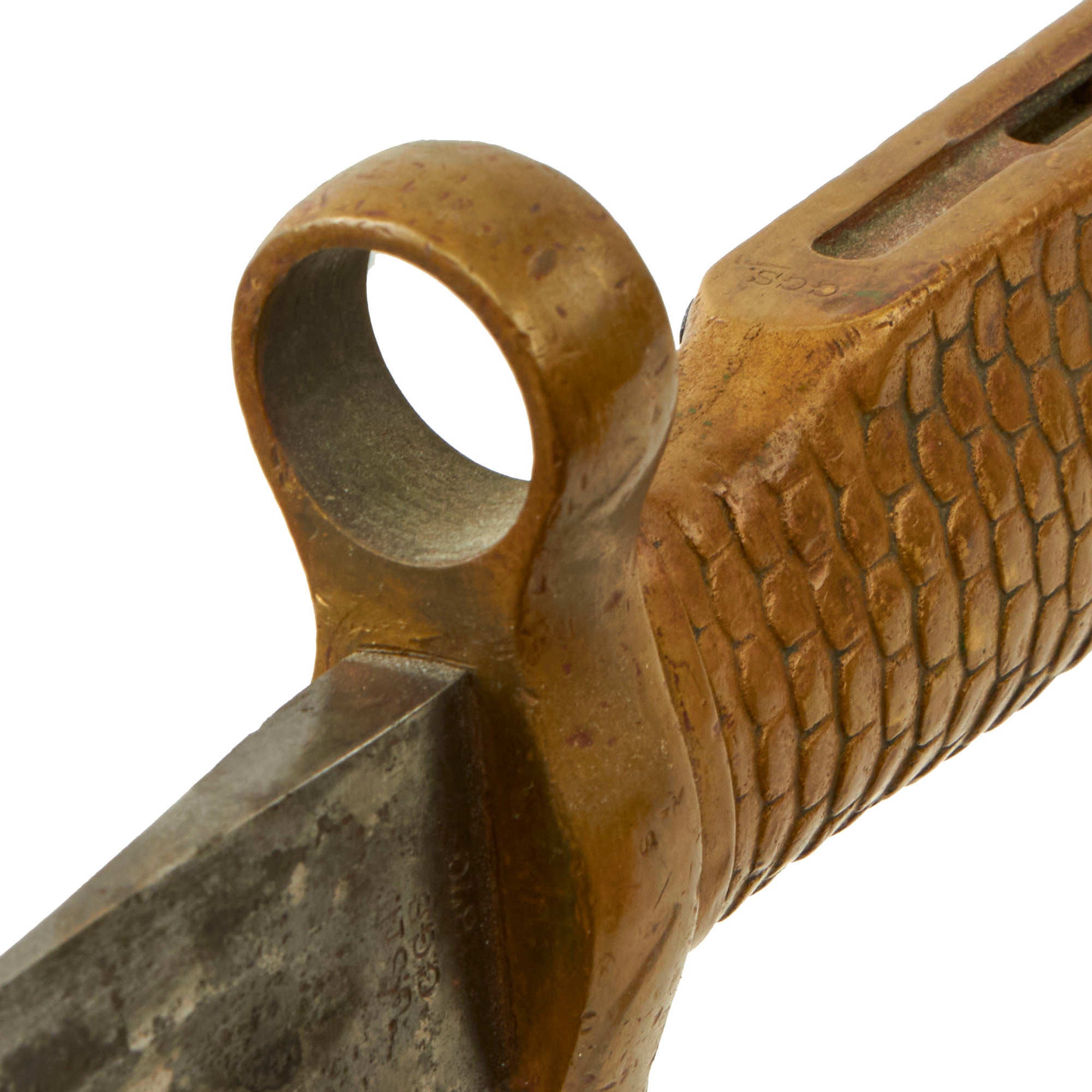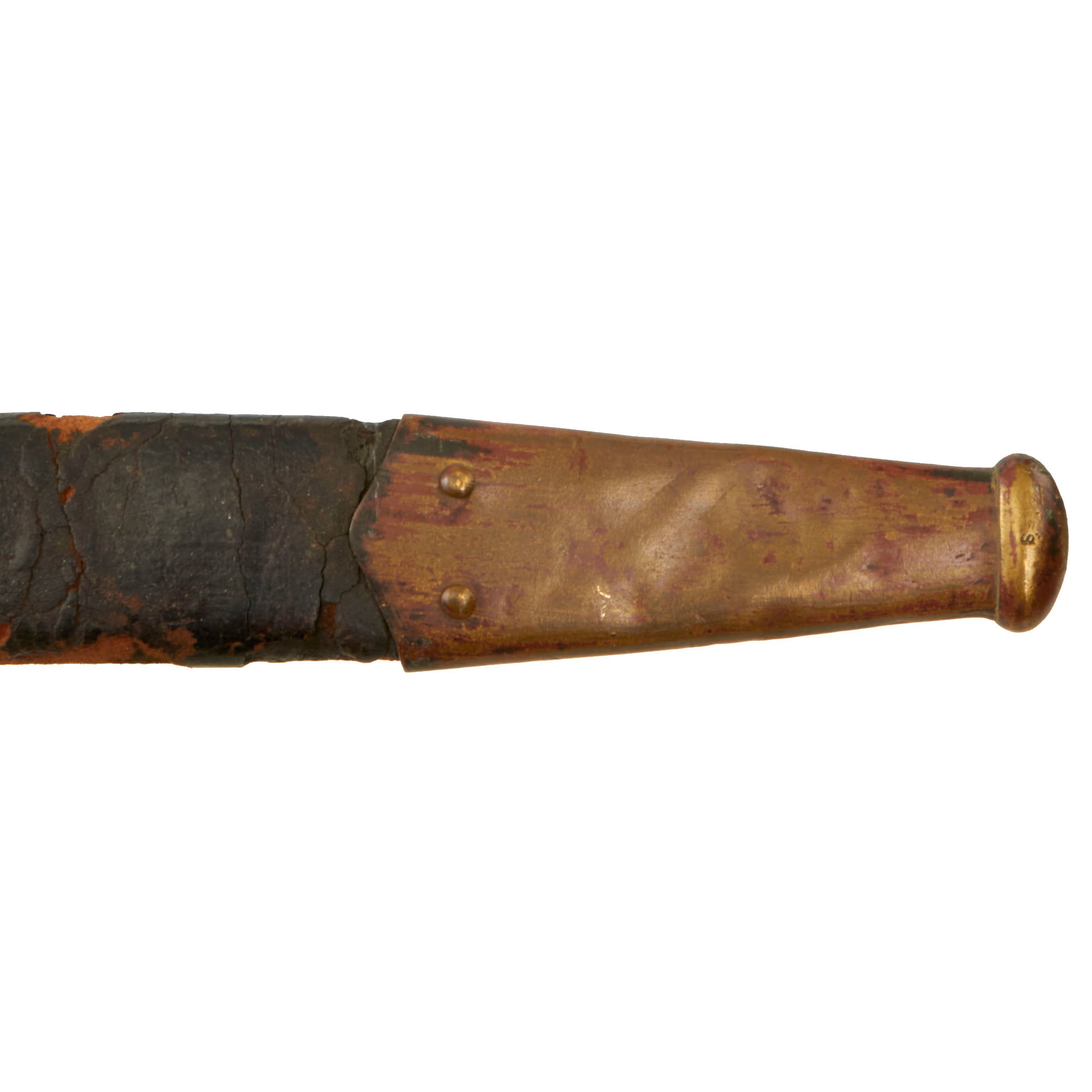Original Item: Only One Available: This is the lesser known of the Post Civil War Naval brass hilted bayonets for the U.S. Navy M1870 Remington Rolling block rifle, the Type 2 being somewhat more distinctive than the Type 1. It is a lovely double edged sword bayonet with a 20" blade, measuring 25” overall. It features a distinctive solid brass hilt with a feather/scale design cast into the grip.The ricasso is marked with:U.S.N.GGS1870With the manufacturer information partially stamped on the opposite side:AMES MFG COCHICOPEEThe pommel is cast with the U.S. Crossed Cannons overlaying an Anchor and still bears the U.S. Inspector's initials of G.G.S. with I.A. on the end of the pommel. The blade shows use with some staining but is still in great shape. Bayonet comes complete with brass mounted black leather scabbard which shows heavy crazing and cracking to the leather. The scabbard is held within a black leather frog that is likely not original to the scabbard given the triangular shaped frog-button hole. However, it’s certainly of the period and matches the bayonet well.In great shape and ready to display!Specifications:Blade Length: 20 ⅛”"Blade Style: Single Edge "Yataghan" w/ FullerOverall length: 24 ¾“Crossguard: 3 ¾”Scabbard Length: 20½”Springfield model 1870 Remington—NavyThe Springfield Model 1870 rolling-block U.S. Navy rifle was a shipboard small arm for use by the United States Navy, employing the Remington Arms Company rolling-block design, and manufactured under a royalty agreement with Remington.Note: Springfield Model 1870 may also refer to the Springfield Model 1870 rifle. One of the rifles which used the trapdoor breechblock design developed by Erskine S. Allin.The U.S. Navy decided to order 10,000 rolling-block rifles. These were to be manufactured at Springfield Armory. After lengthy discussions, it was decided that Springfield Armory would make the complete rifle, and would pay Remington and Sons a $1 royalty for all rifles produced.After the rifles were produced, Navy inspectors realized that the rear sights had been positioned incorrectly, and were dangerously close to the chamber, making the weapon unsafe for use. All 10,000 rifles were rejected, and were subsequently sold to Poultney and Trimble of Baltimore. These weapons were then exported to France for use during the Franco-Prussian War.The sale of the defective rifles enabled enough funds to be recovered that the Navy Ordnance Department later ordered 12,000 Model 1870 Type II rifles, which were just a minor improvement to the Model 1870 and included changes such as the correction of the location of the rear sight.