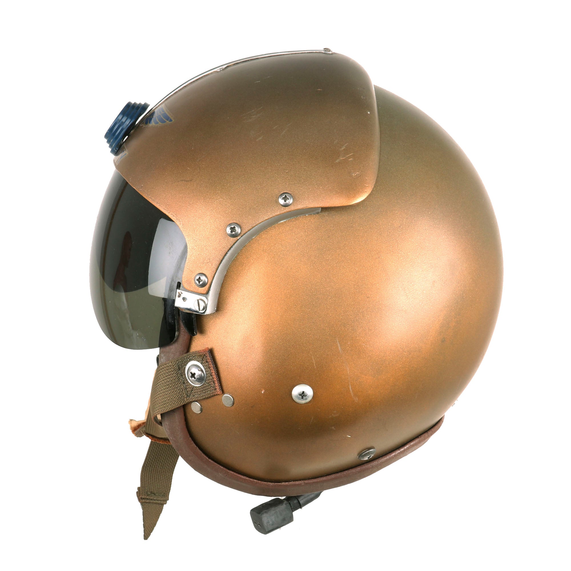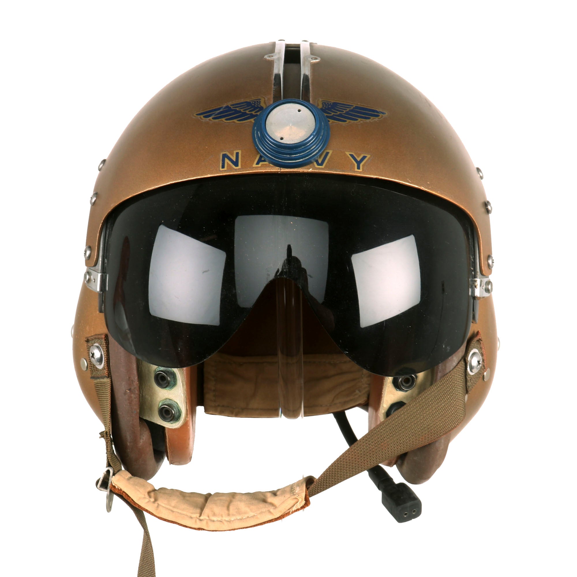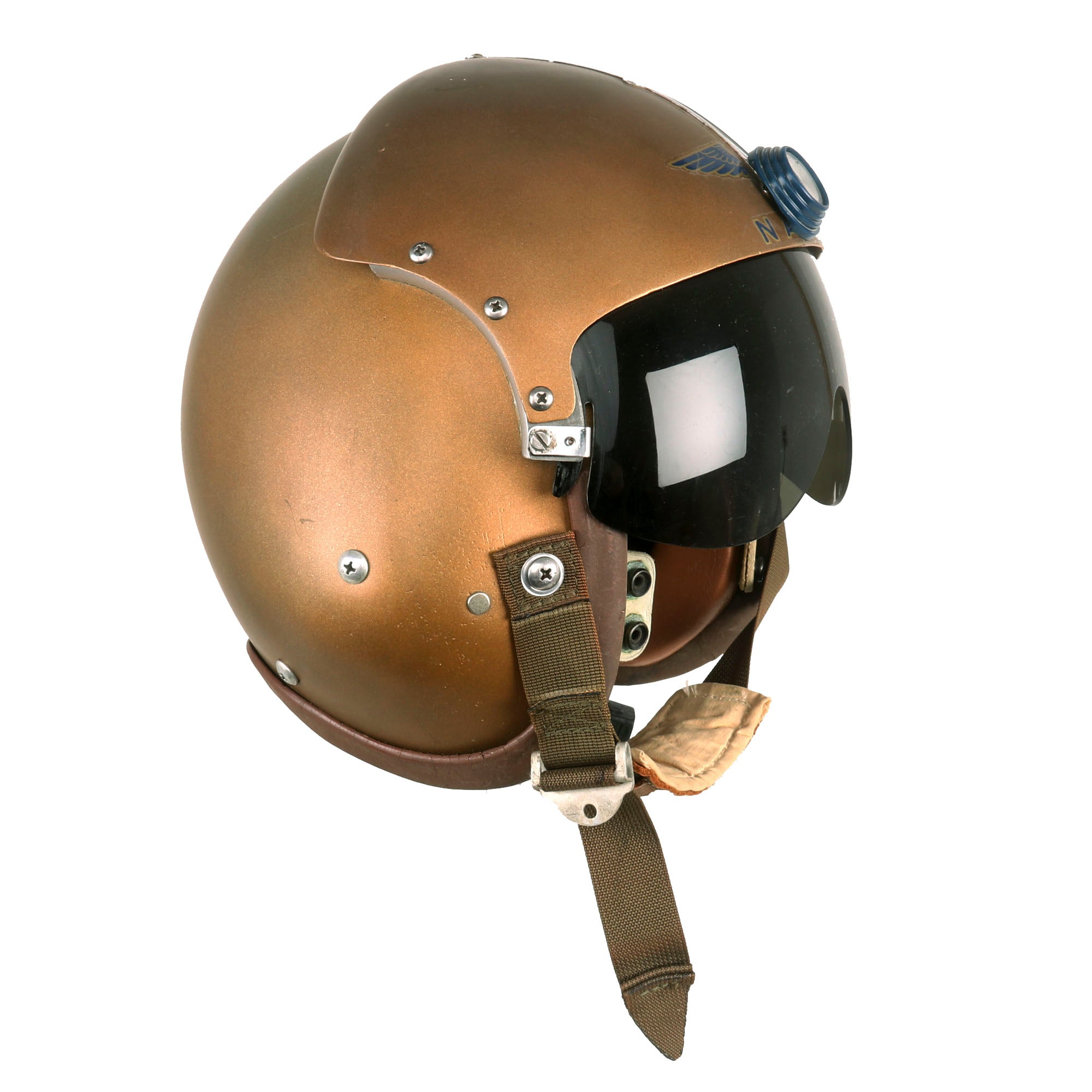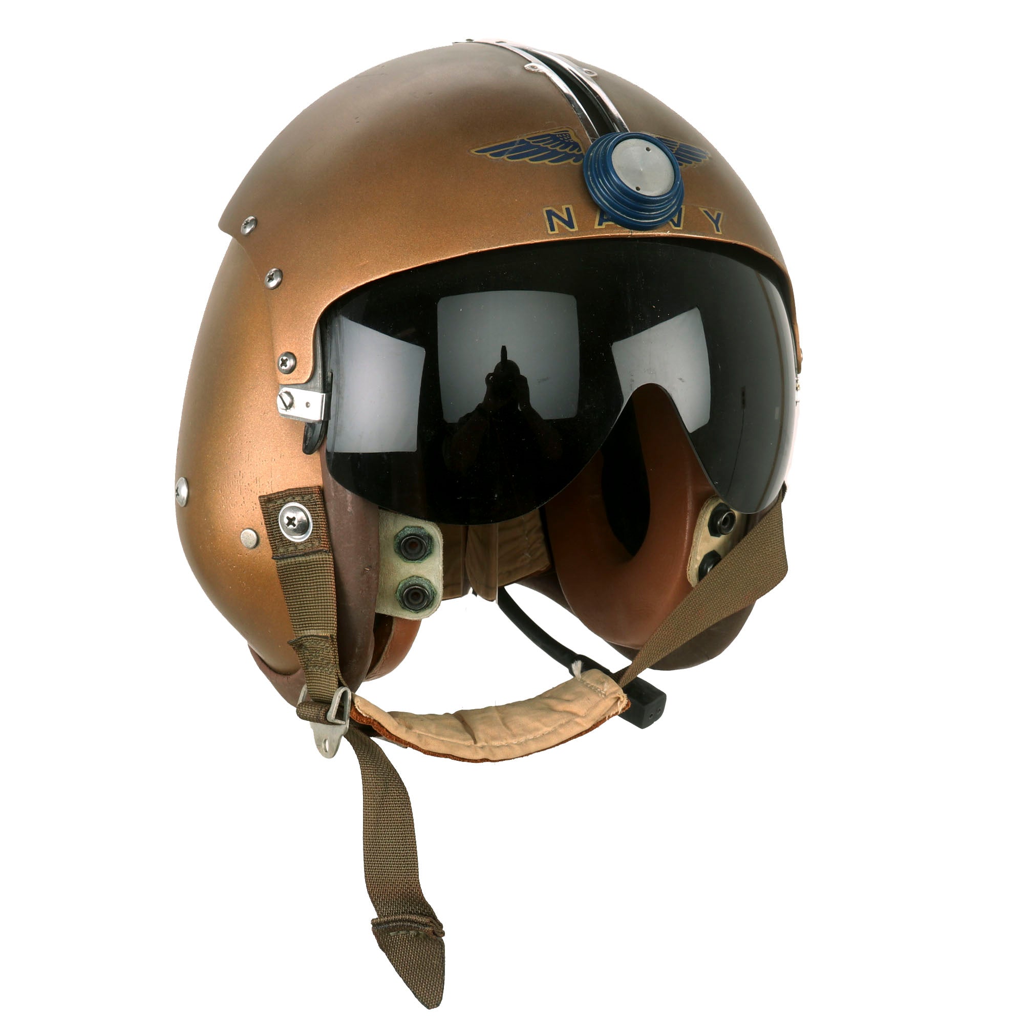 Original Item: Only One Available. This is a late 1950s era United States Navy USN Helicopter Flight Helmet type APH-5 Helmet. It has the correct early type thick roam rubber edge roll, and the base color is white, now painted over with U.S. Navy gold. Wings have been pasted to each side of the top with NAVY below it as shown. It still has the internal padding, however there are no avionics installed. It also does have a retractable visor installed, which can be controlled by sliding the circular tab on top of the helmet back and forth.