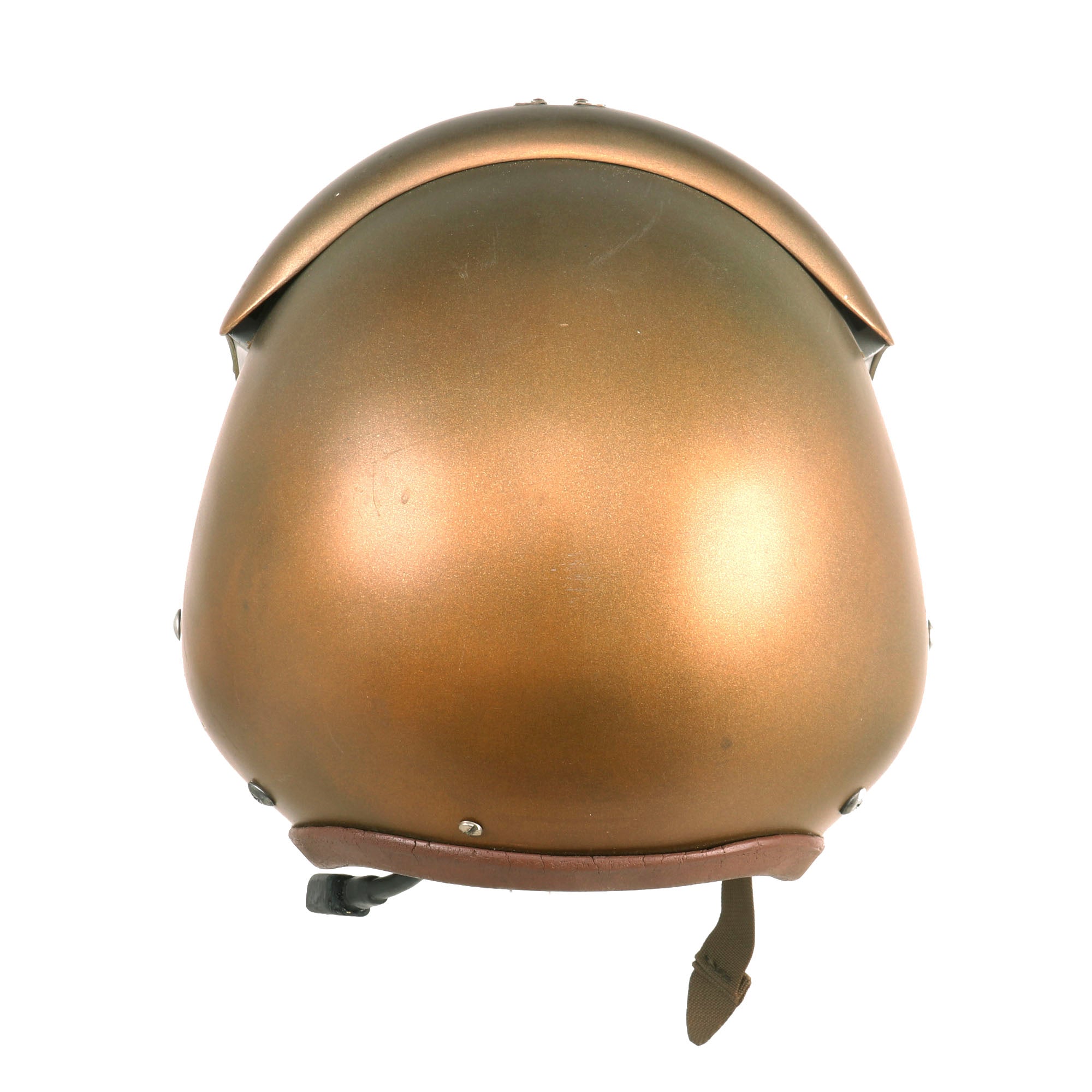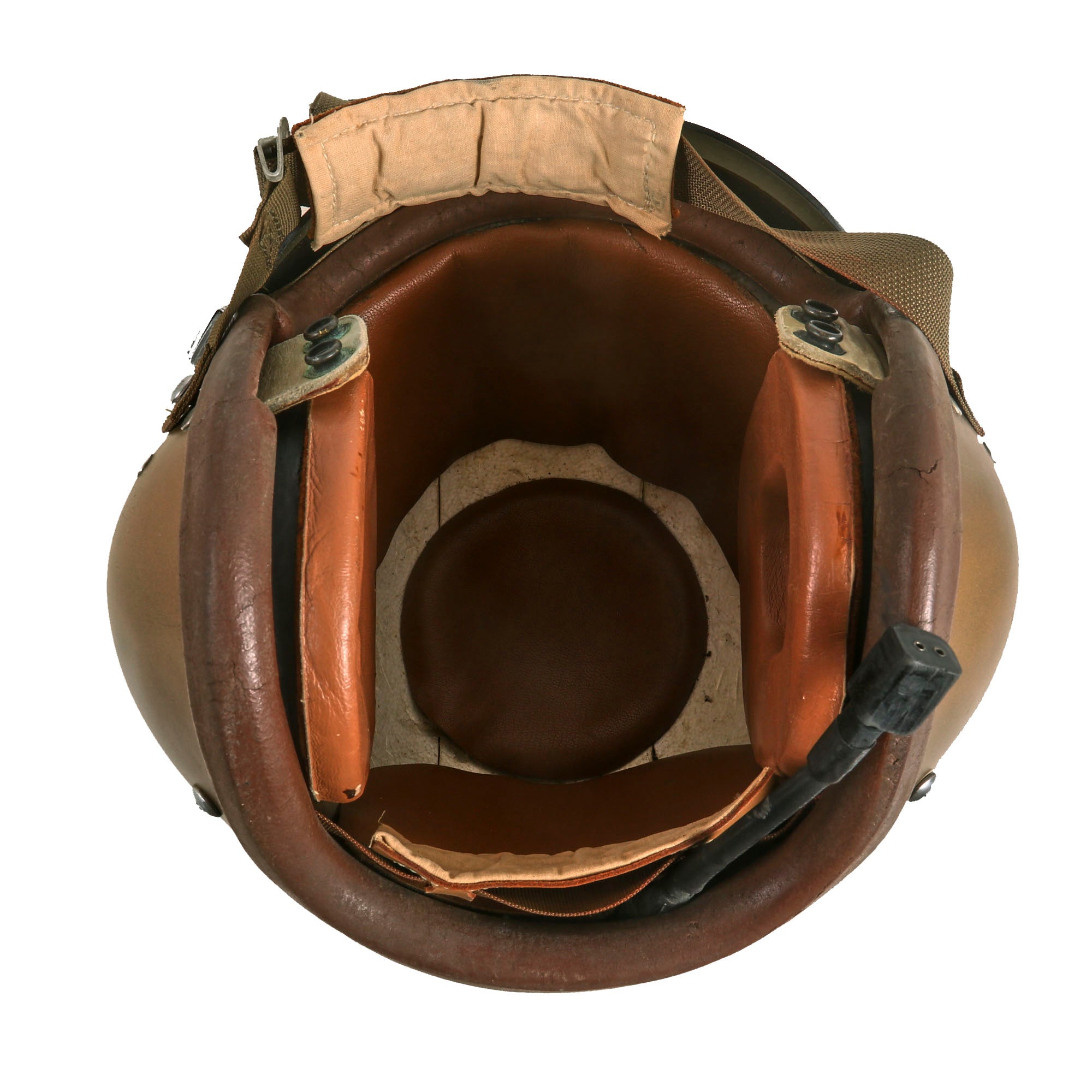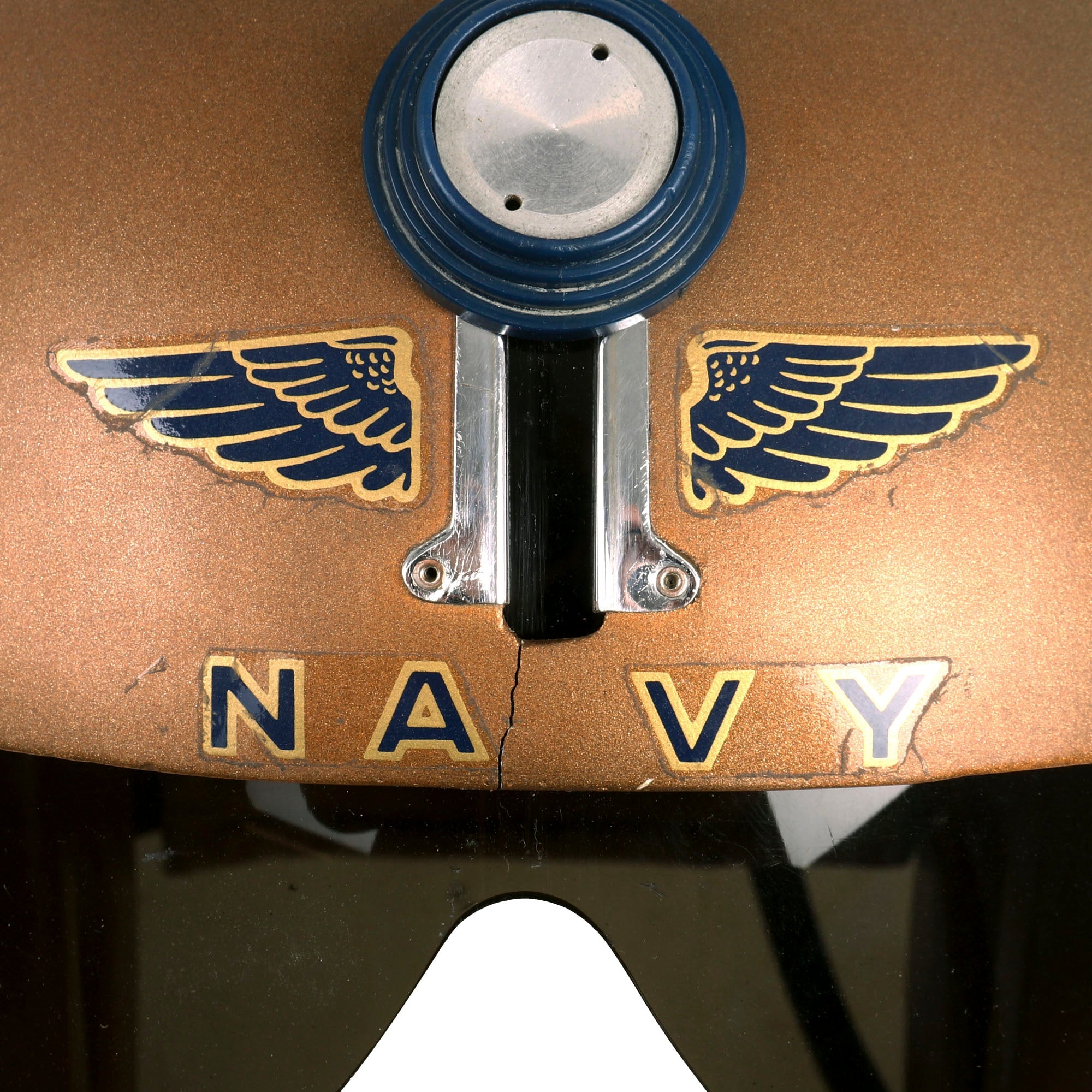 The helmet is in overall good shape with some flaws. There is a crack in the helmet just below the tab to adjust the visor, right in between the A and V in Navy. The visor still adjusts fine, but caution should be advised when adjusting it. The buckles are all in good working order. There doesn’t appear to be any maker’s mark. Overall a great attractive helmet from the 1950’s/Vietnam War Era that is ready for further research and display! The size appears to be Medium/Large. There is a small attachment wire for the headset, but the headset is absent.