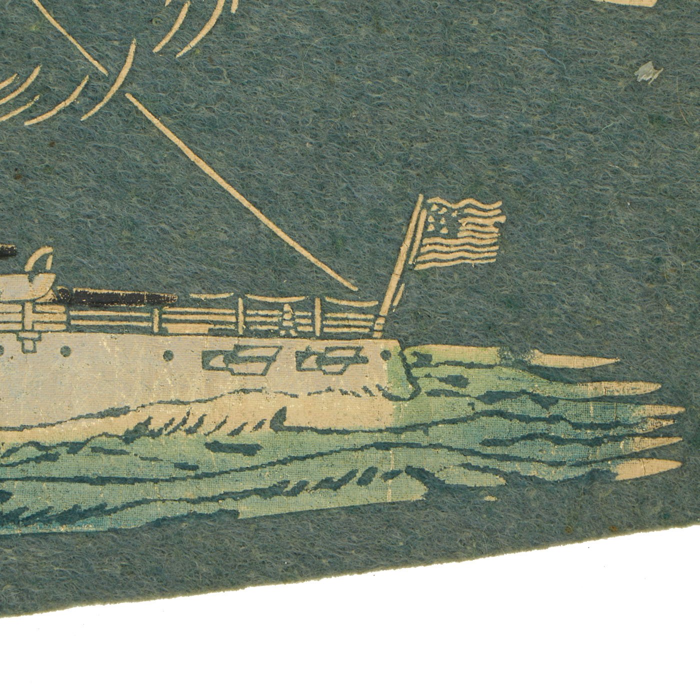 Original Item: Only One Available. Here is an original Circa 1916 Souvenir Felt Pennant featuring the U.S. Arizona. This is the first of these we have ever seen! This certainly dates from the commissioning of the Arizona in 1916, as the age and construction methods used are quite similar to other pennants of this type from the era. Also of note is the fact that the Arizona is in its early “Super Dreadnought” configuration (It remained this way until modernization in 1929-1931). Fantastic condition for its age. These souvenir items of this sort were not intended to last, so to find one at all is a rarity, let alone one that is in excellent condition!