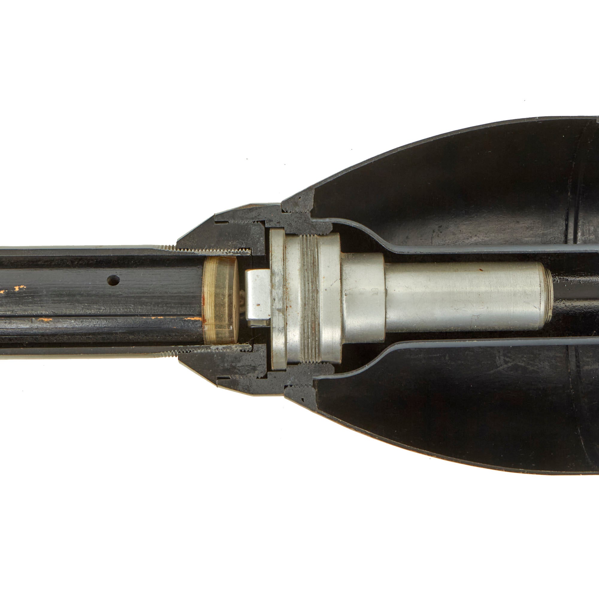 This example was cut in half, as compared to many which only have a 1/4th removed. It shows the internal workings of the bomb and even retains some of the wiring protruding from the bottom near the fins. The tube in the shaft has a small data plate reading Mark I Mod 0. There are some scattered markings across some of the interior pieces. The entire cutaway measures 34½ x 5 x 7”.