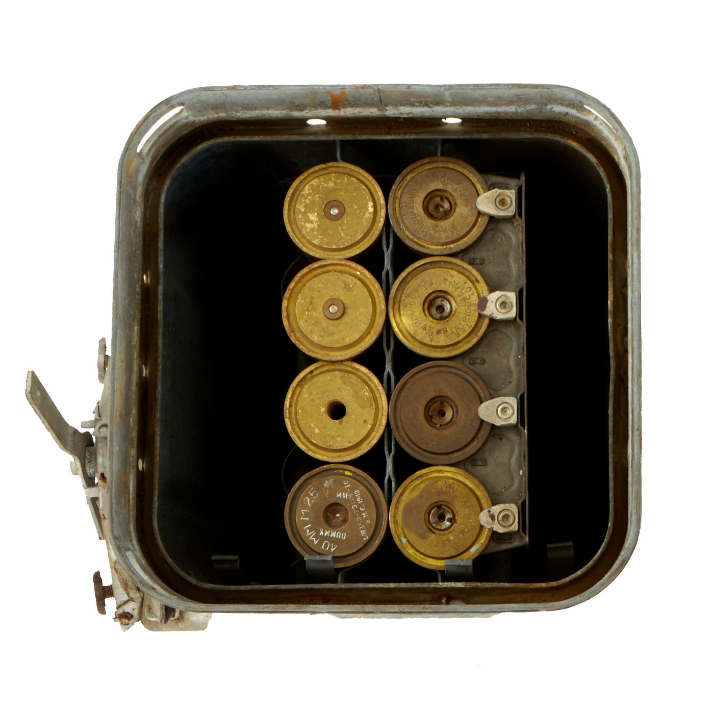 This is an outstanding example of a WWII U.S. Navy Bofors 40mm Cannon ammunition can! Included inside are a total of 8 Inert 40mm Rounds. 5 rounds have inert fuses and tips and the other 3 inert rounds have all wood training tips on them. They sit nicely inside the can in their proper carriages and are still easy to attach the feeding clip onto the base of the rounds. 5 of the rounds have the date of 1943 on them while the other 3 training rounds do not have any markings visible. As for the can, there are no markings visible on it. The can measures in at 25” tall and 11” wide/squared. There appears to be no physical damage to the box, besides the cosmetic issues of the markings being worn away. The rounds have no significant damage visible on them and the paint on the wooden tipped ones are still mostly retained and still look beautiful.